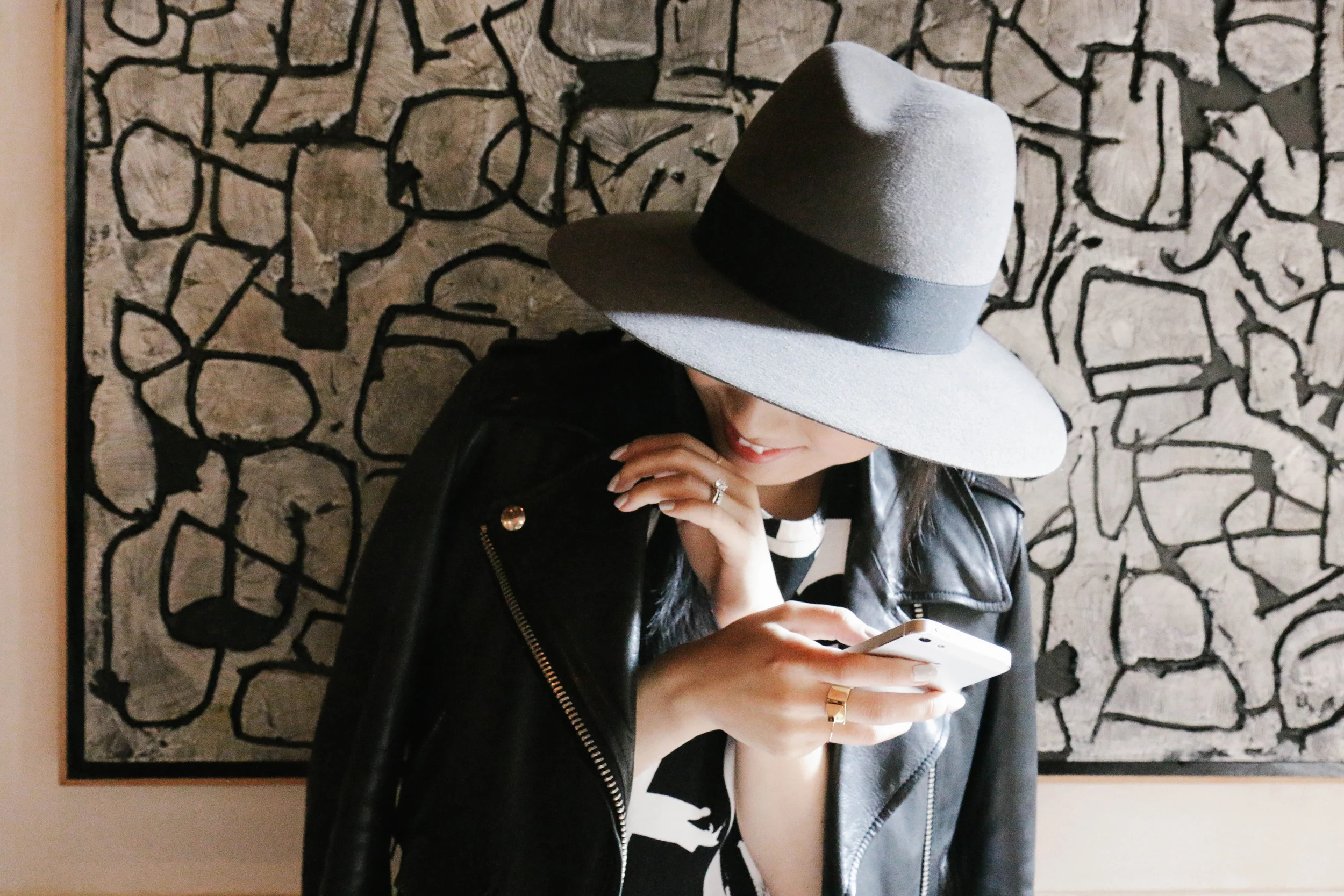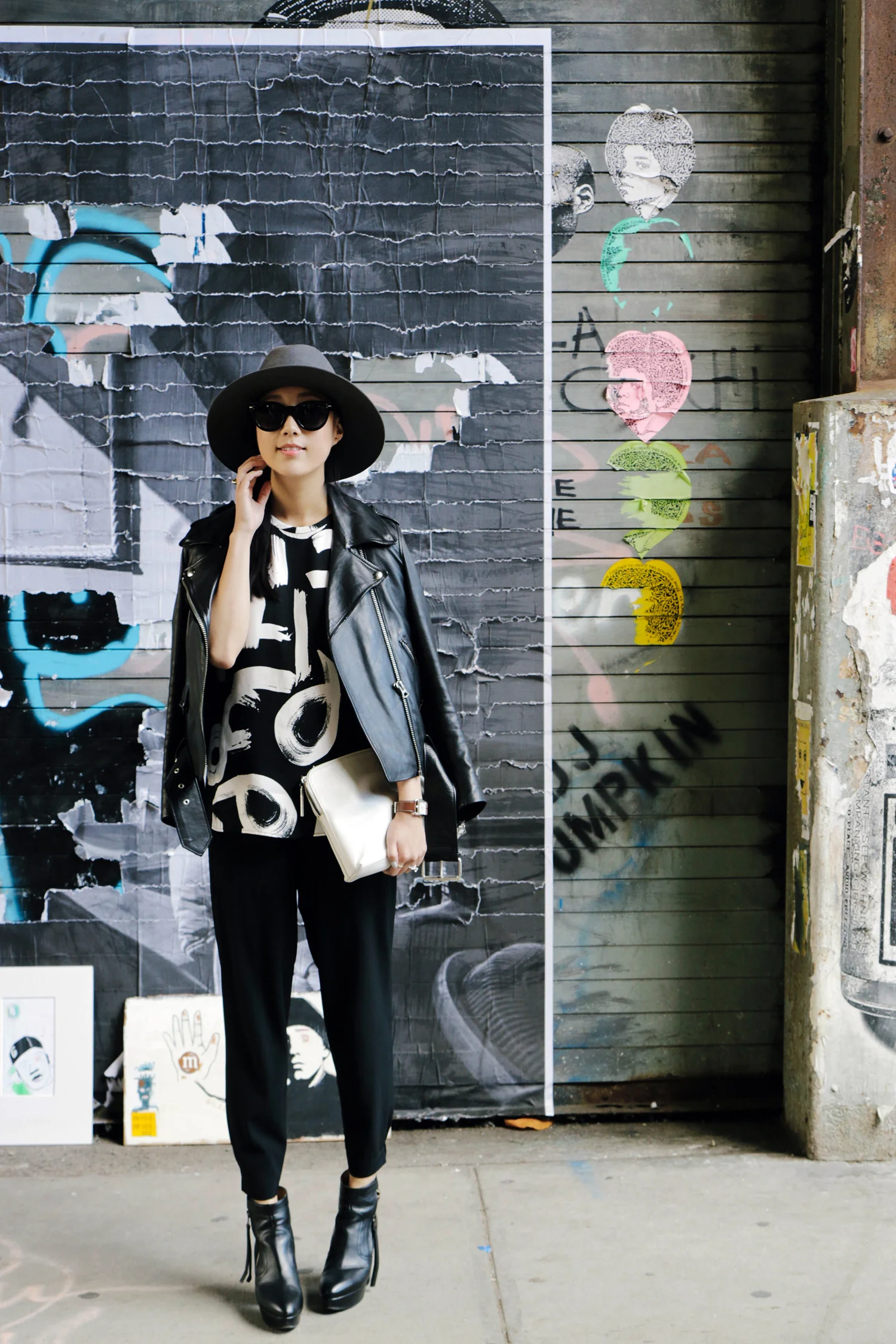 Acne Studios Jacket, Proenza Schouler Top (in Black), Vince Pants, Acne Studios Boots, 3.1 Phillip Lim Clutch (in Black), Saint Laurent Hat and Ring, Céline Sunglasses, Hermes Watch