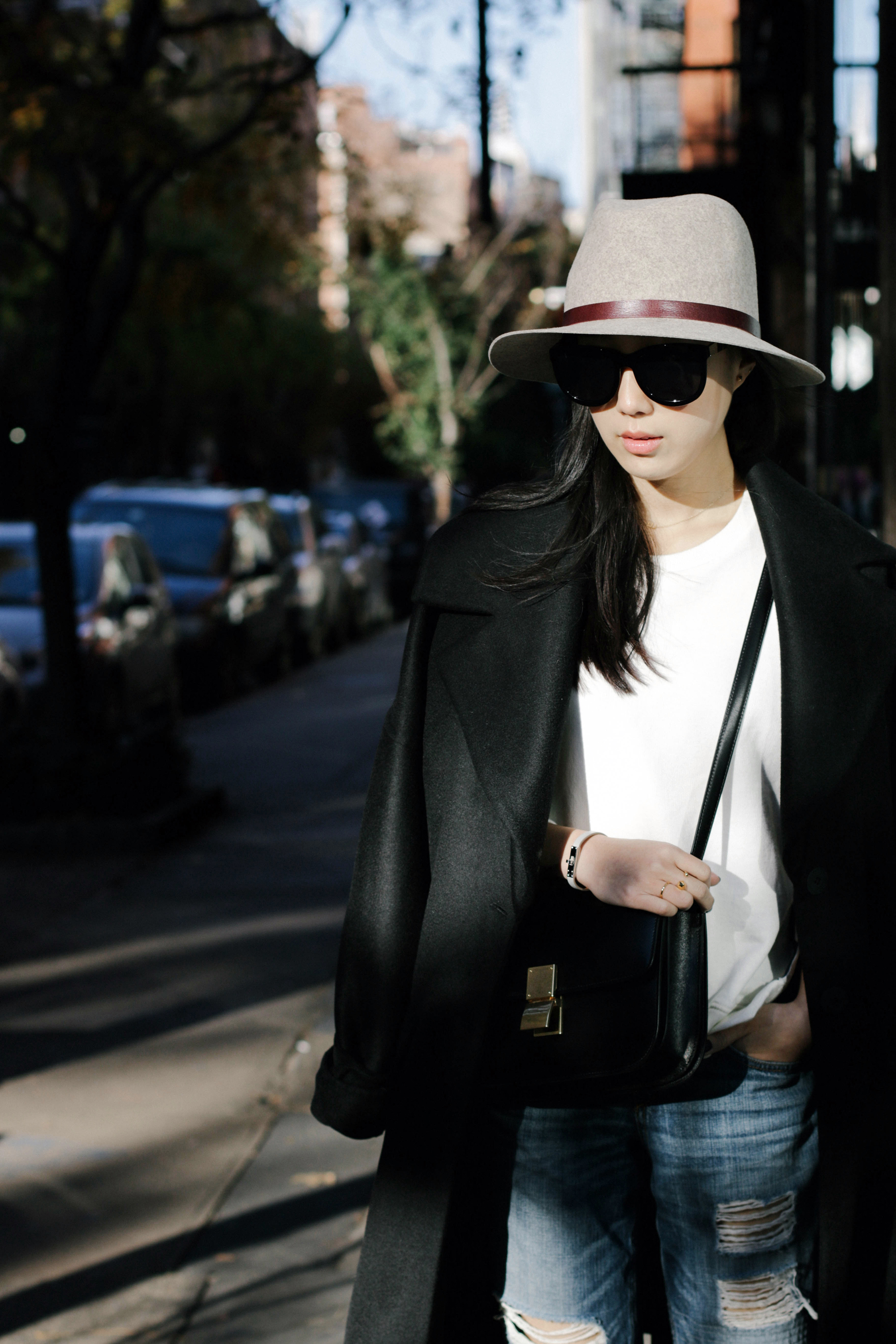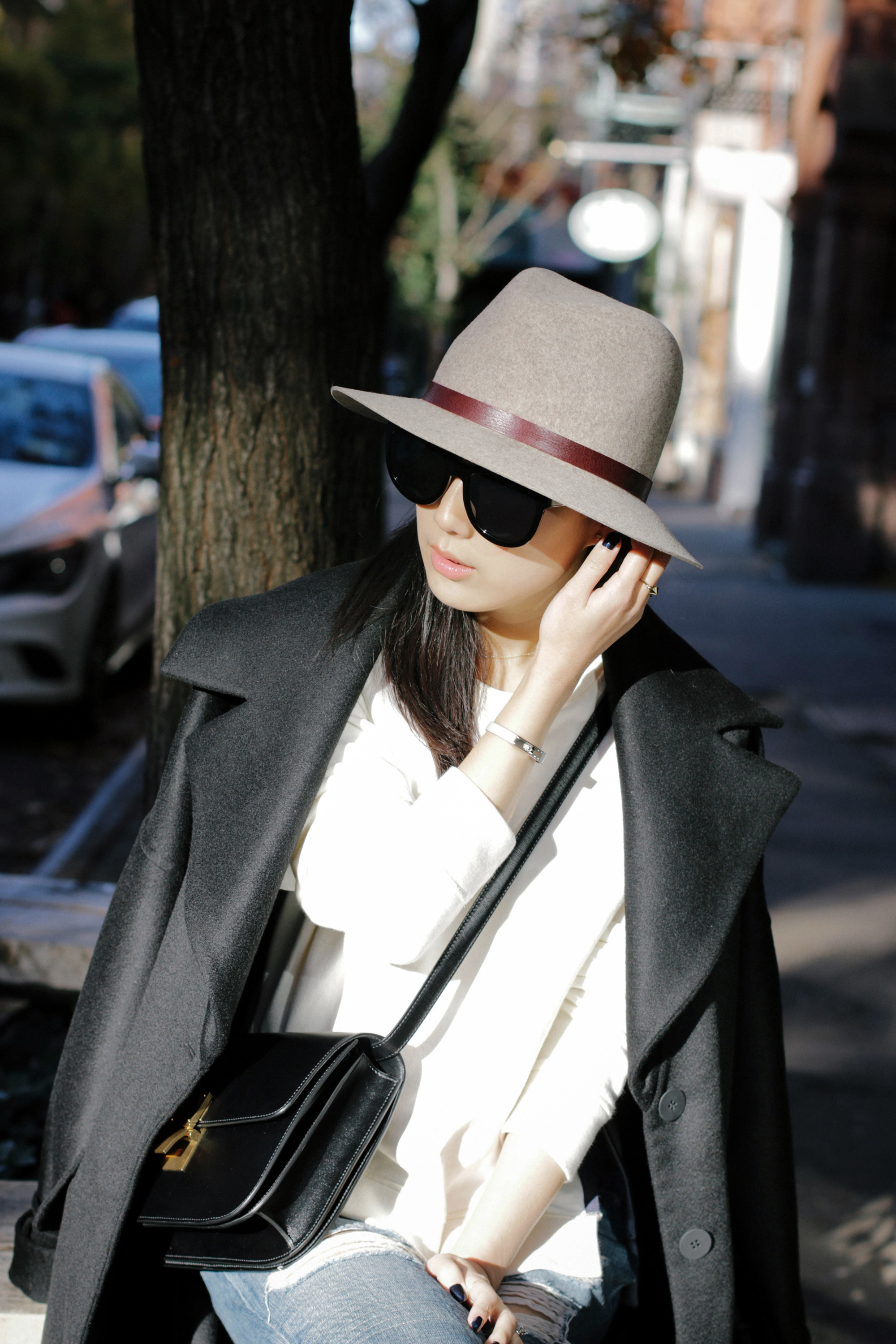 Michelle Waugh Coat, Acne Studios Top, Rag & Bone Jeans, Camilla Skovgaard Boots, Céline Bag, Janessa Leone Hat, The Row Sunglasses (Tortoiseshell), Hermes Bracelet (Black), Brandy Pham Rings (One, Two)