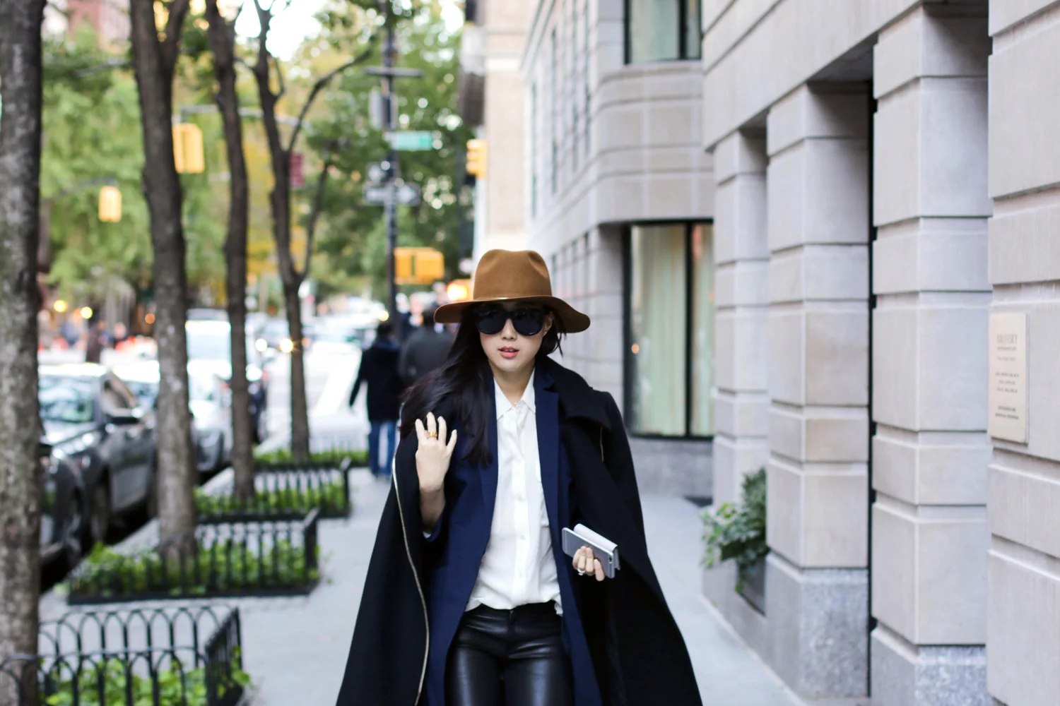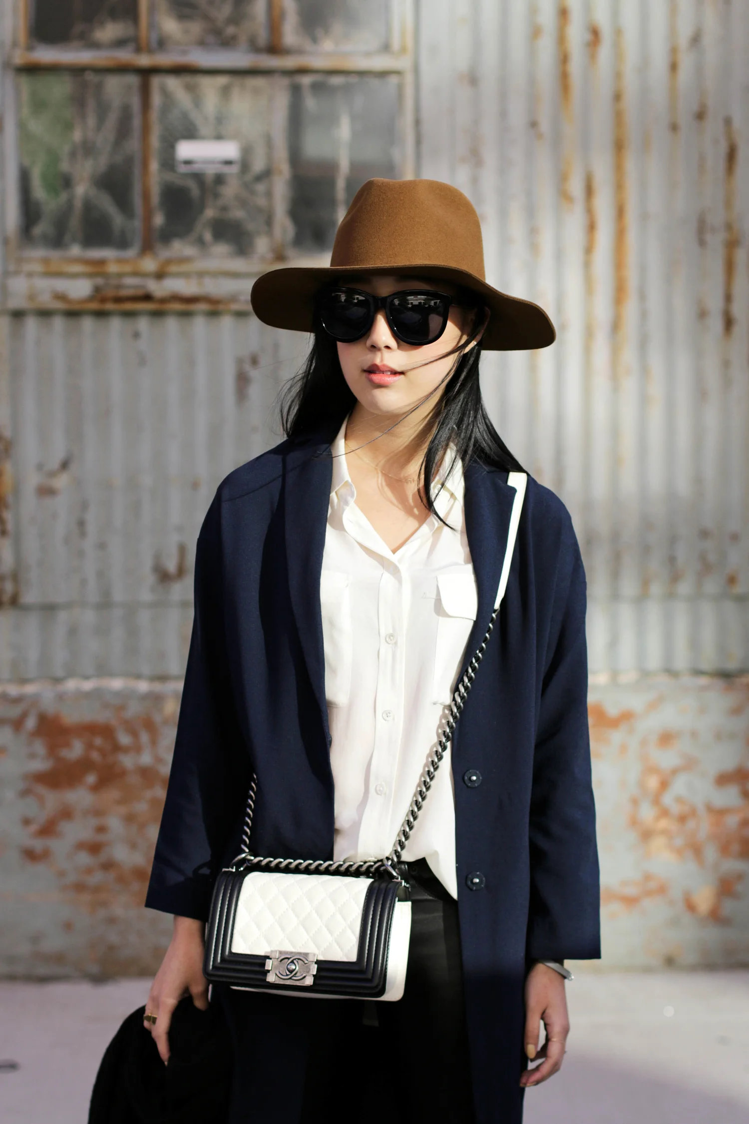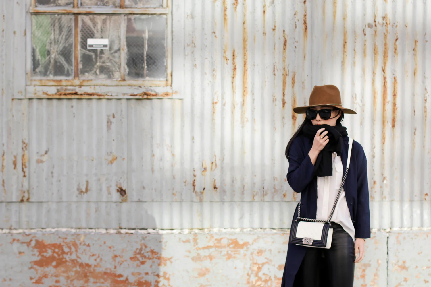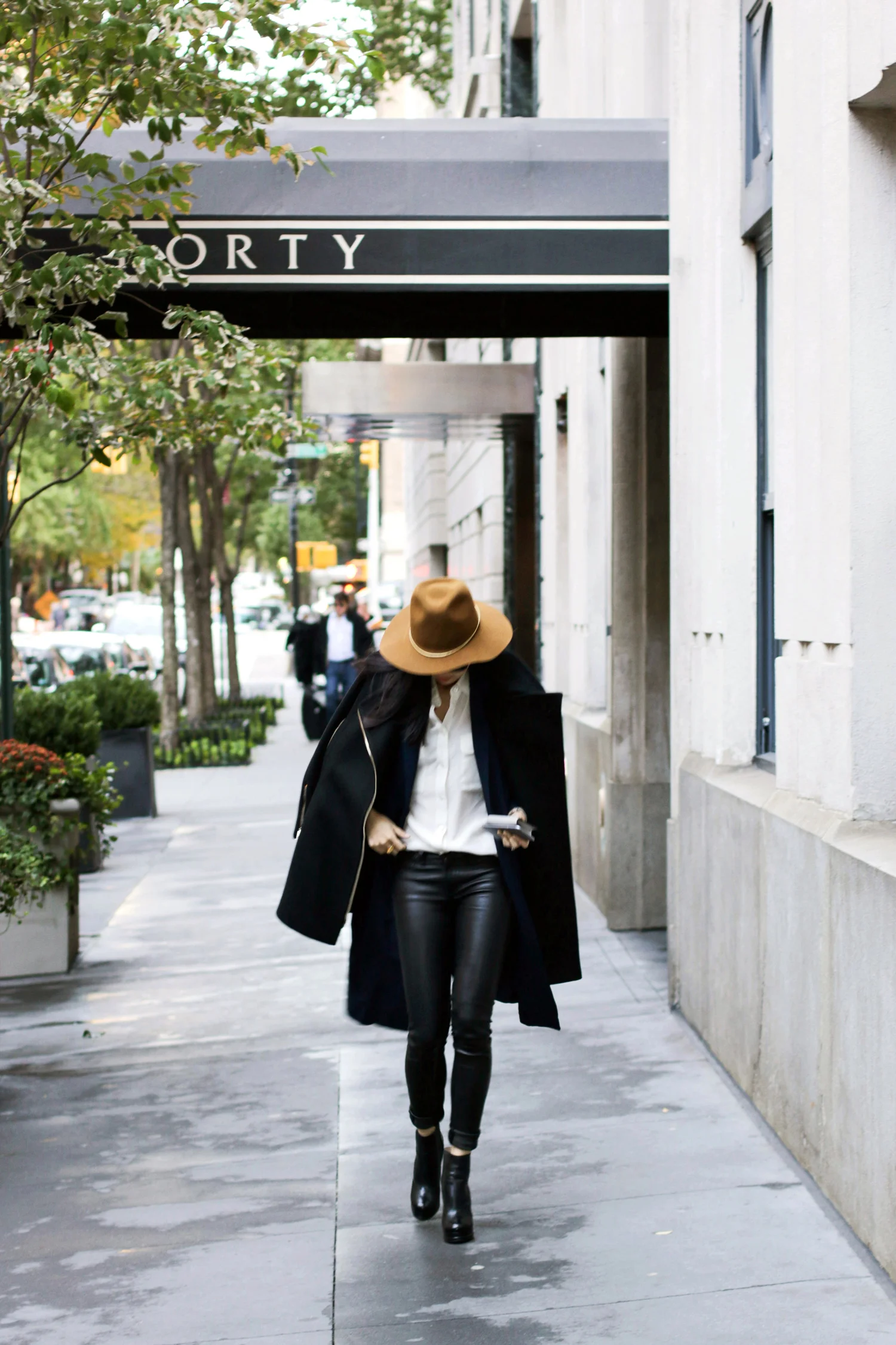 Equipment Top, Rag & Bone Leather Jeans, Asos Duster Coat, Stella McCartney Coat, Janessa Leone Hat, The Row Sunglasses, Gjenmi Necklace, Chanel Shoes and Bag