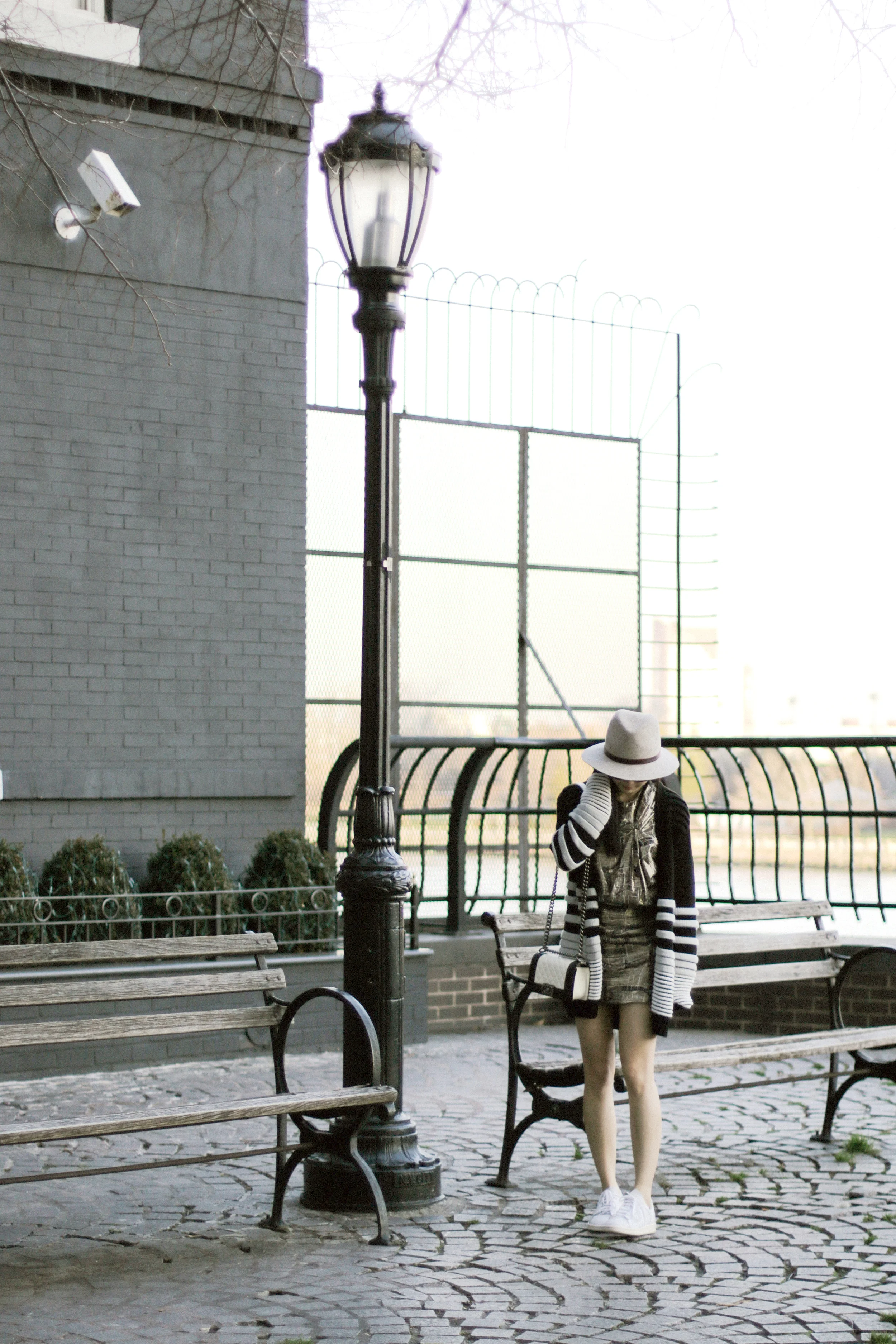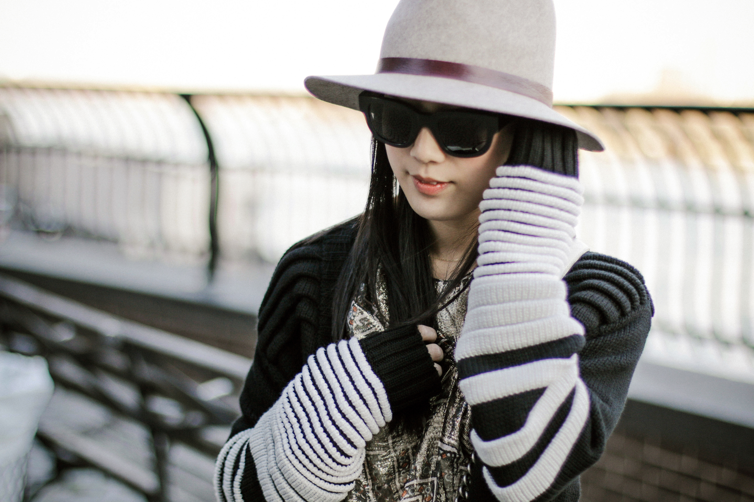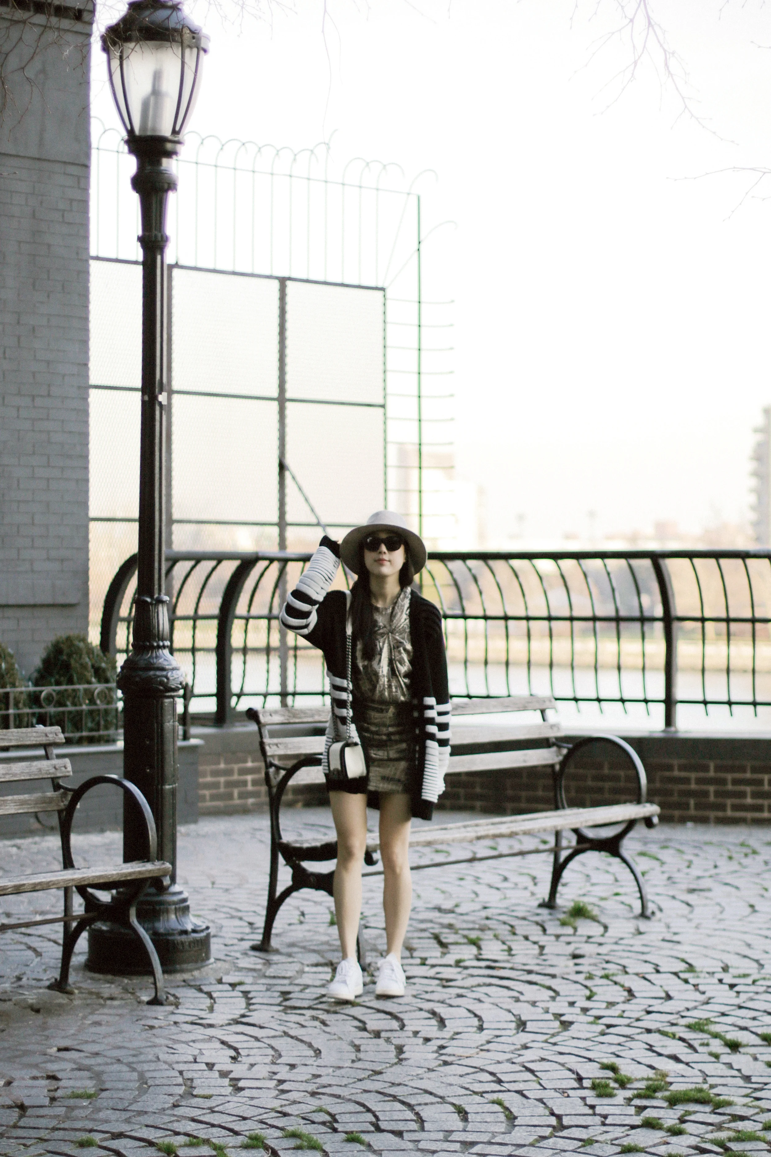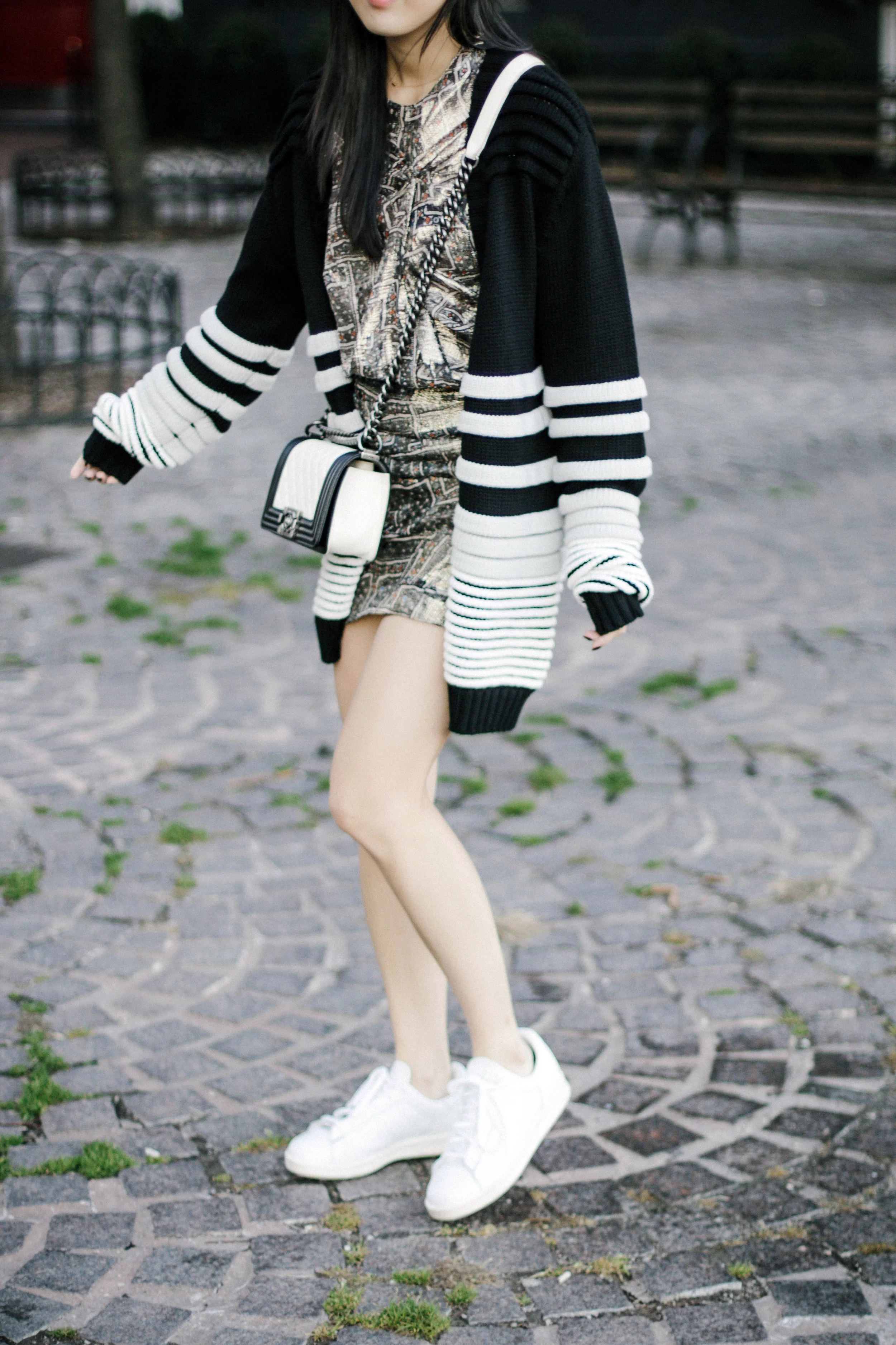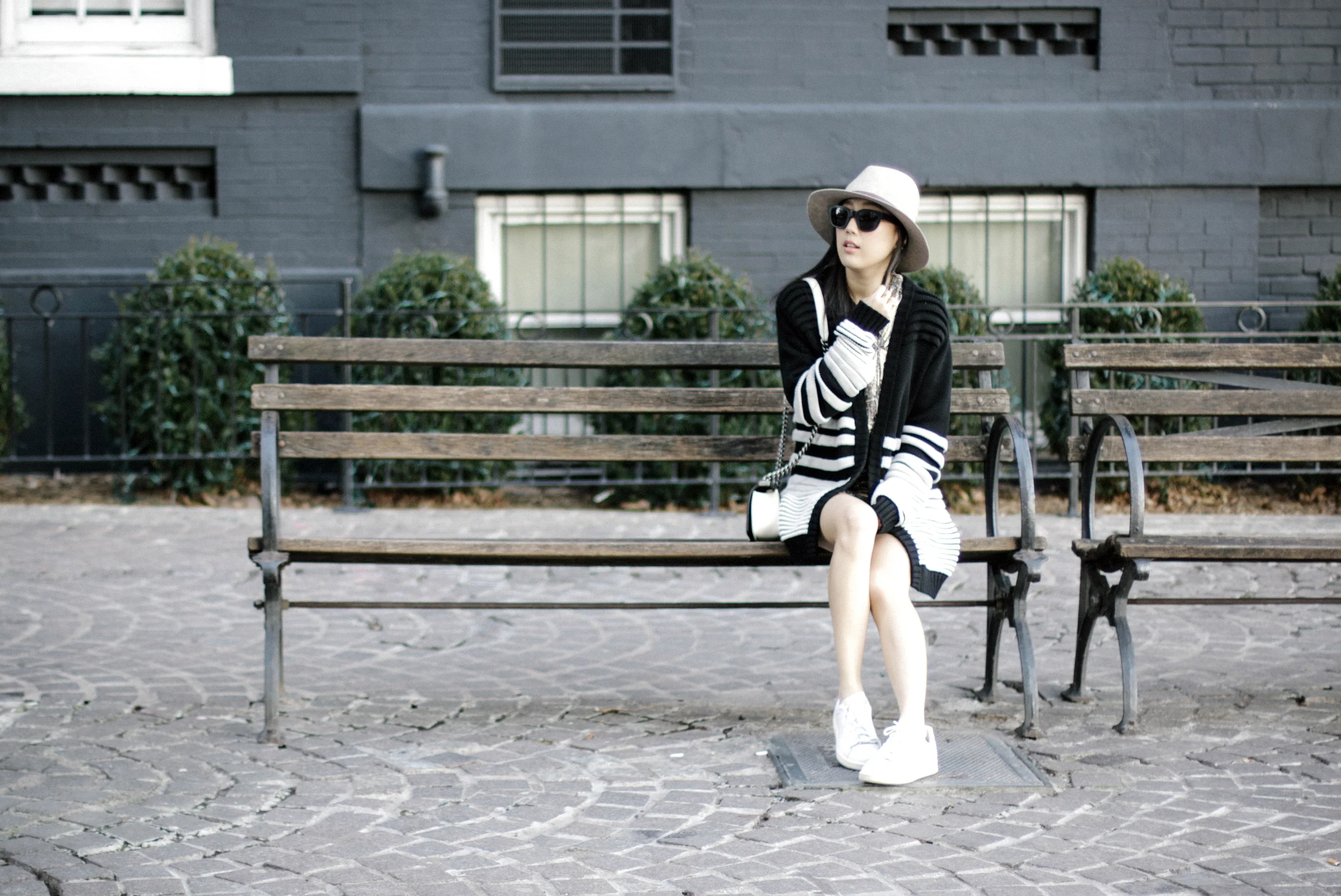 Public School Cardigan, Isabel Marant x H&M Dress, Adidas Sneakers, Chanel Bag, Janessa Leone Hat, Acne Studios Sunglasses