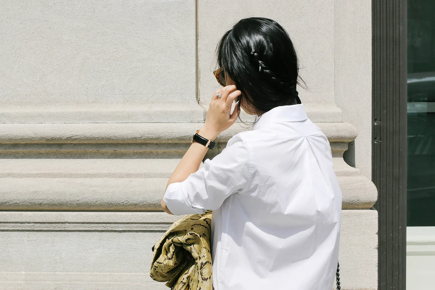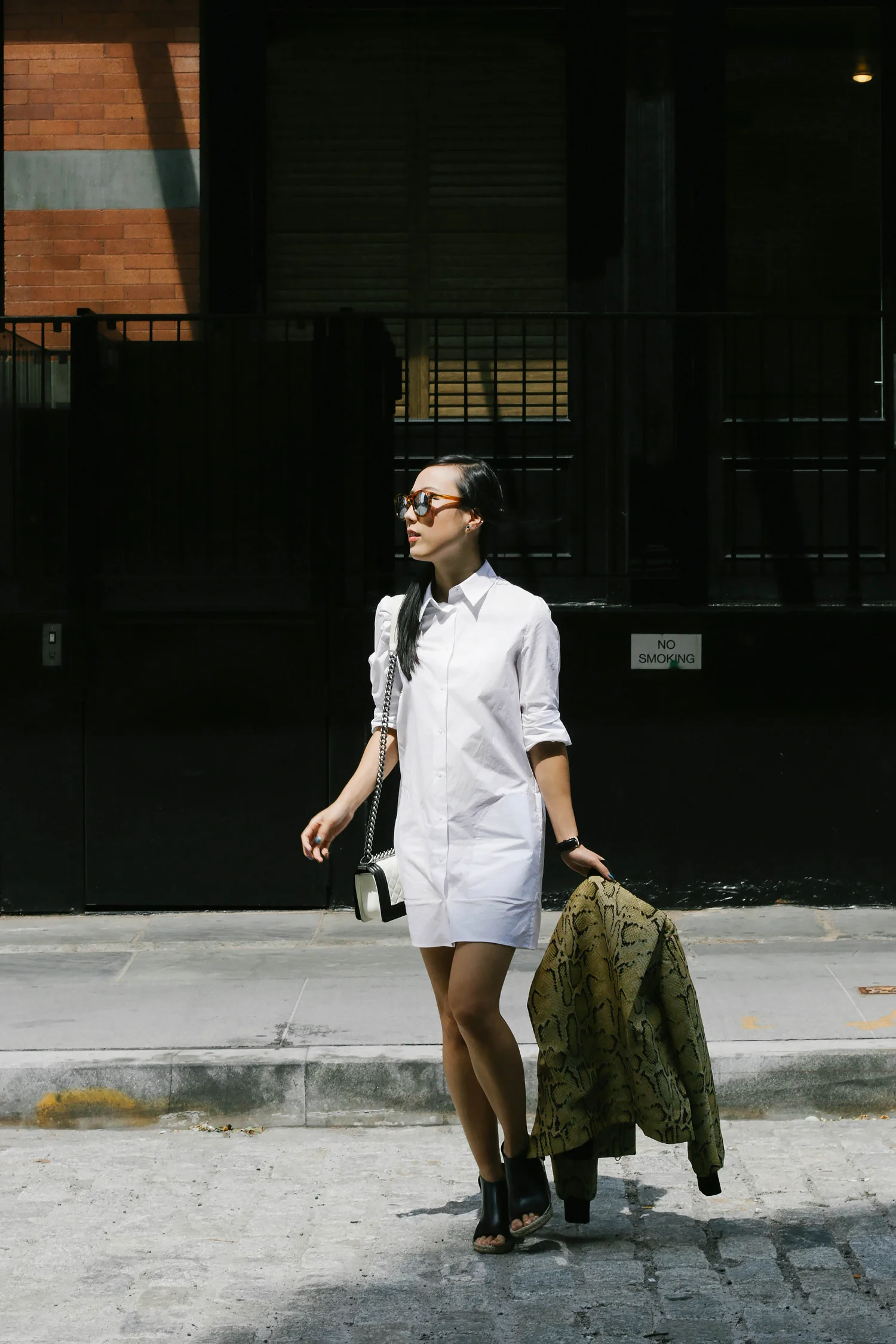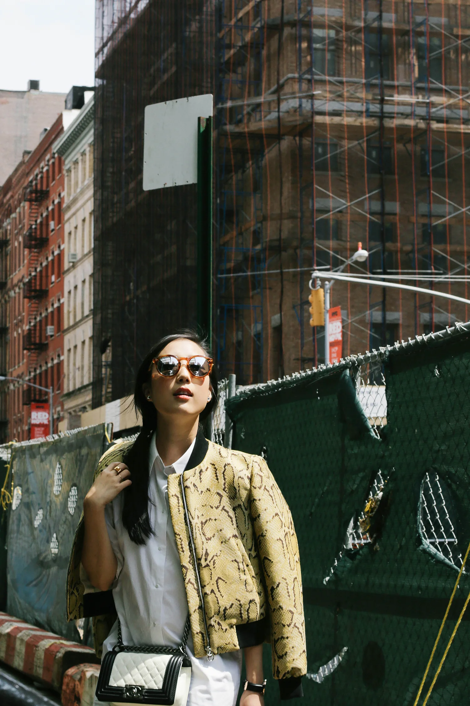 Acne Studios Shirt (Similar), Stella McCartney Jacket, Céline Sandals, Chanel Bag (Similar), Daniel Wellington Watch (15% off—'eggcanvas'), Illesteva Sunglasses (Lighter Tortoise), Saint Laurent Ring (Similar), Catbird Ring