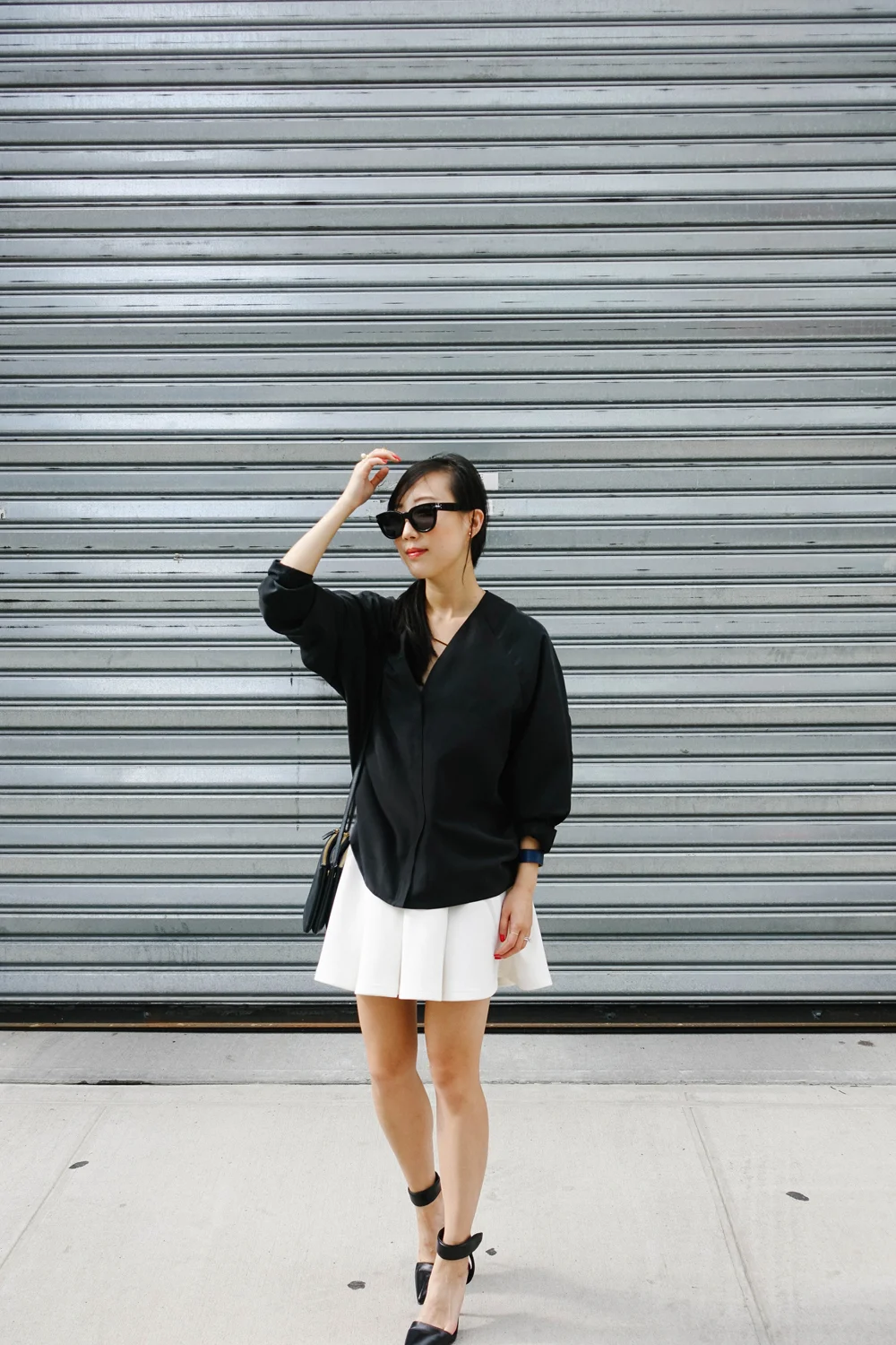 My version of the casual Friday outfit, as we slowly adjust into the fall season. These structured pieces are still very comfortable, as the top is made of silk and the skirt, a neoprene material. I picked up this blazer in Paris back in June and since it was the last one left in store, I just got it in a size bigger than my usual. So it is a bit oversized, but it's nice to be able to wear it as a top or as a jacket. A low heel is great to dress up the look a bit and keep you on your toes!