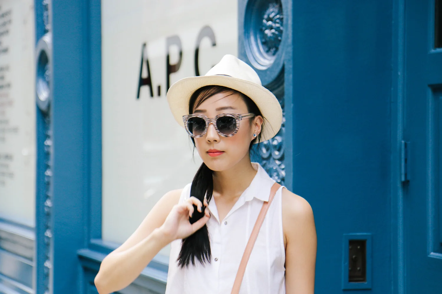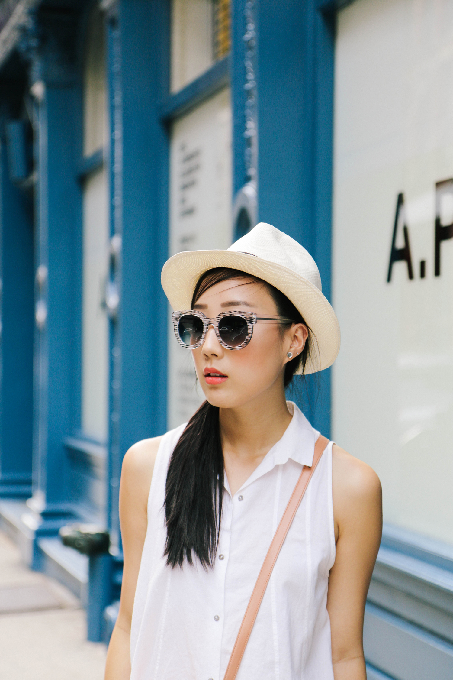 Helmut Lang Top (Similar, Similar), Rag & Bone Shorts (Similar, Similar), Miu Miu Shoes, Céline Bag, Thierry Lasry Sunglasses (Red/Blue Version), J.Crew Hat, Hermes Bracelets, AVEC New York Ring