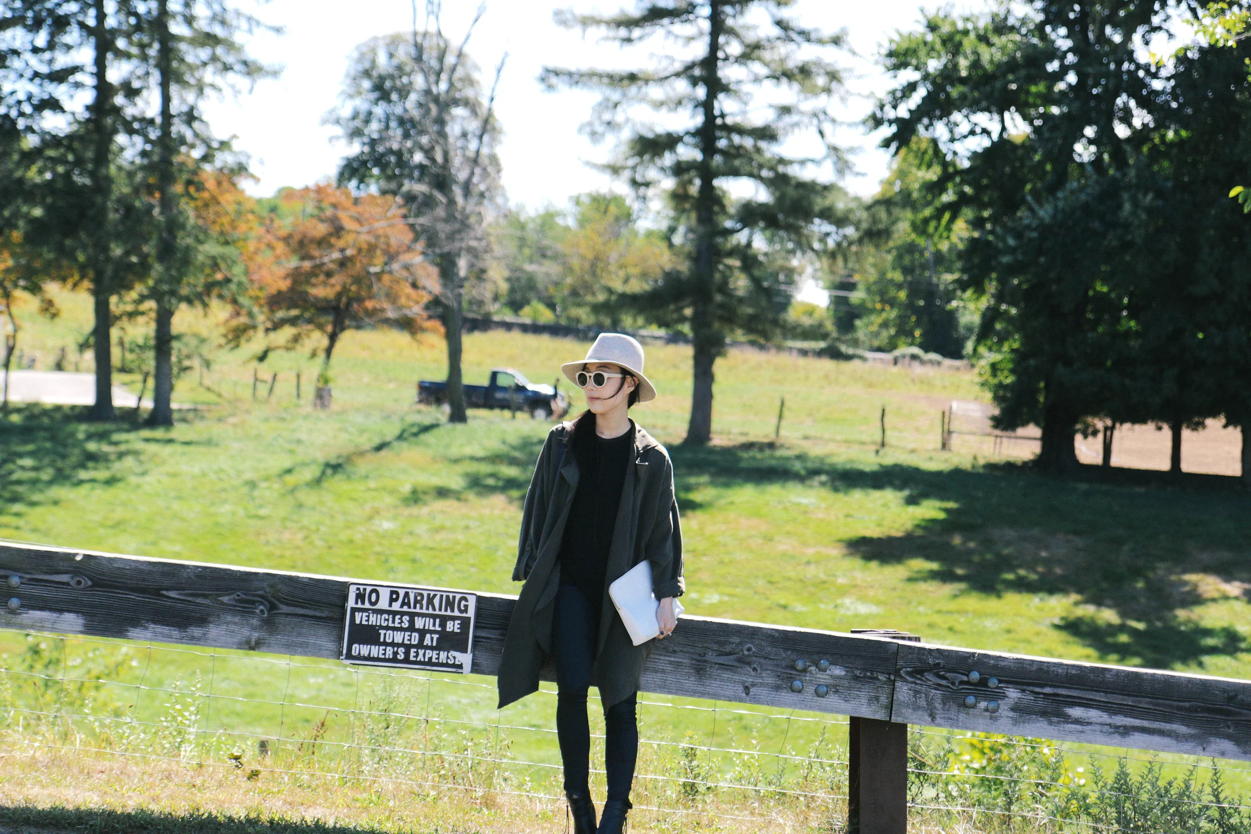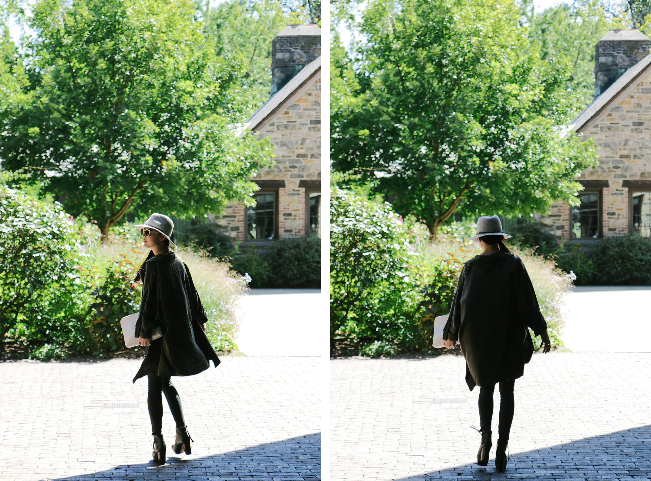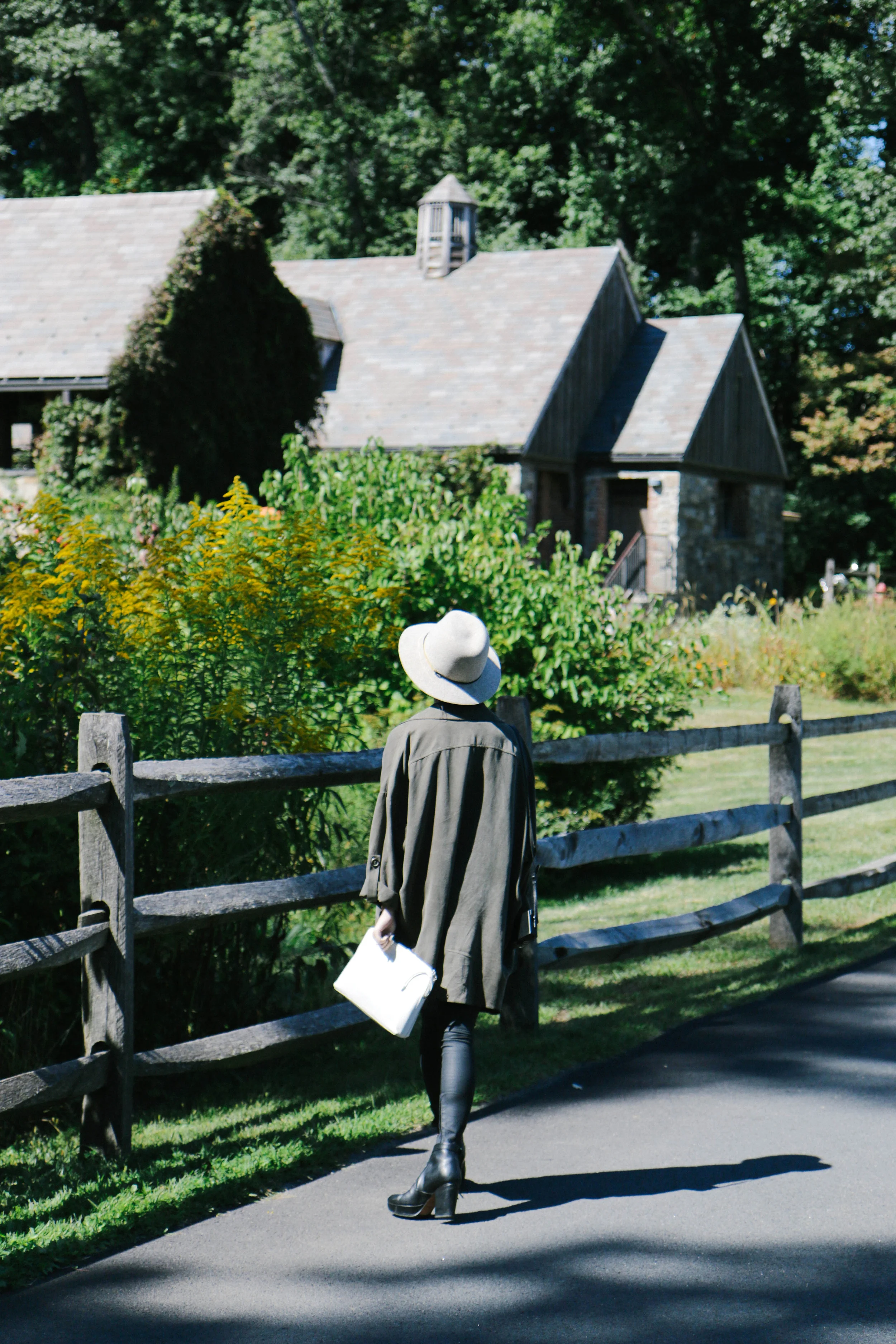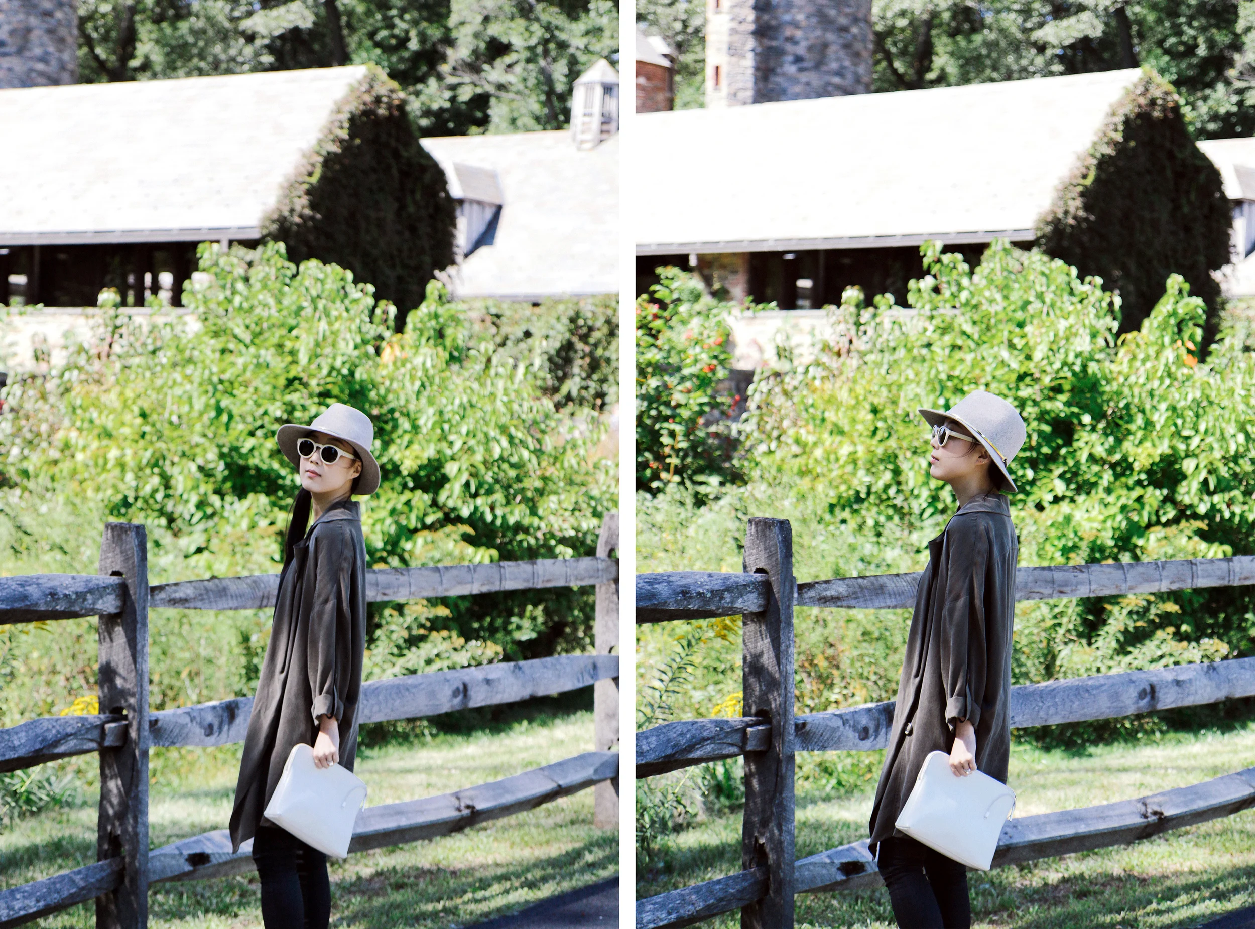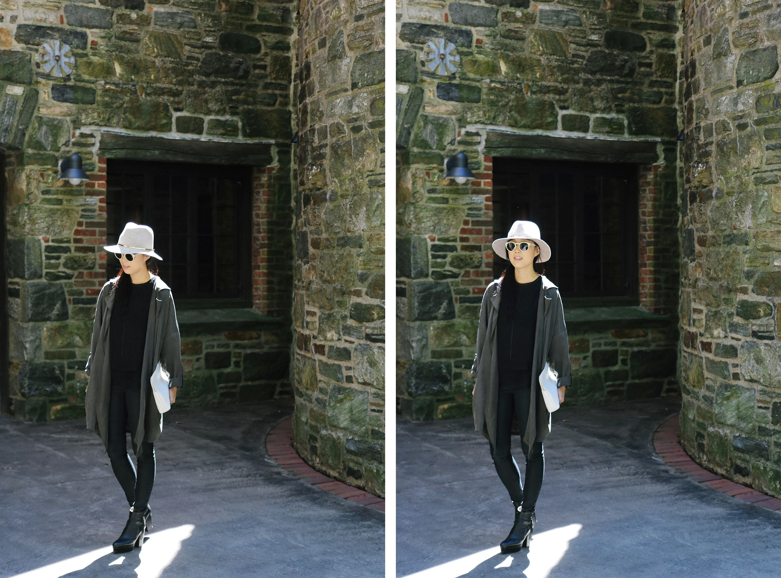 Vince Top, Mason by Michelle Mason Jacket, Rag & Bone Jeans, Janessa Leone Hat, Acne Studios Boots, Gjenmi Necklace, Gjenmi Earrings, Seneca Eyewear Sunglasses