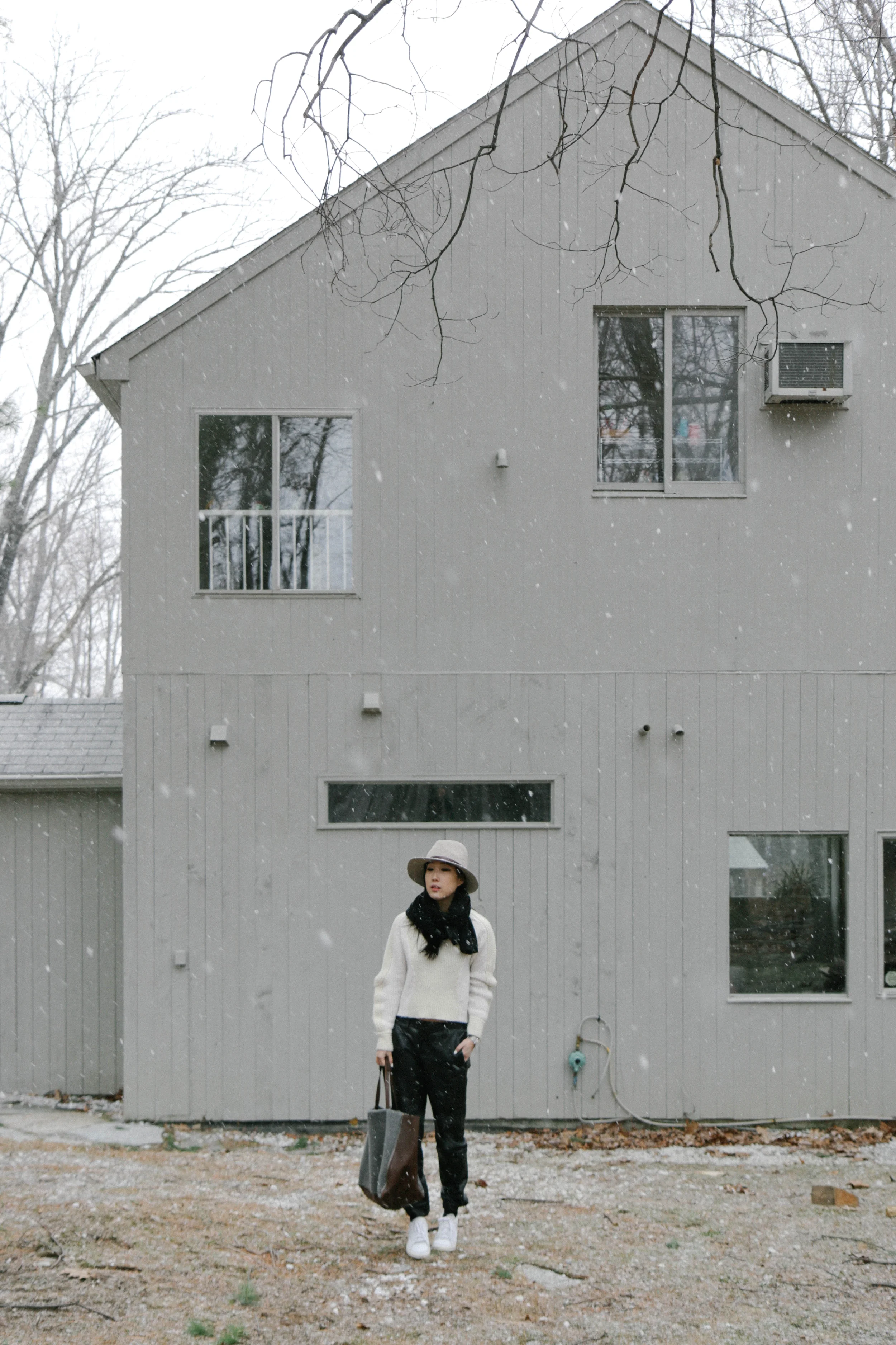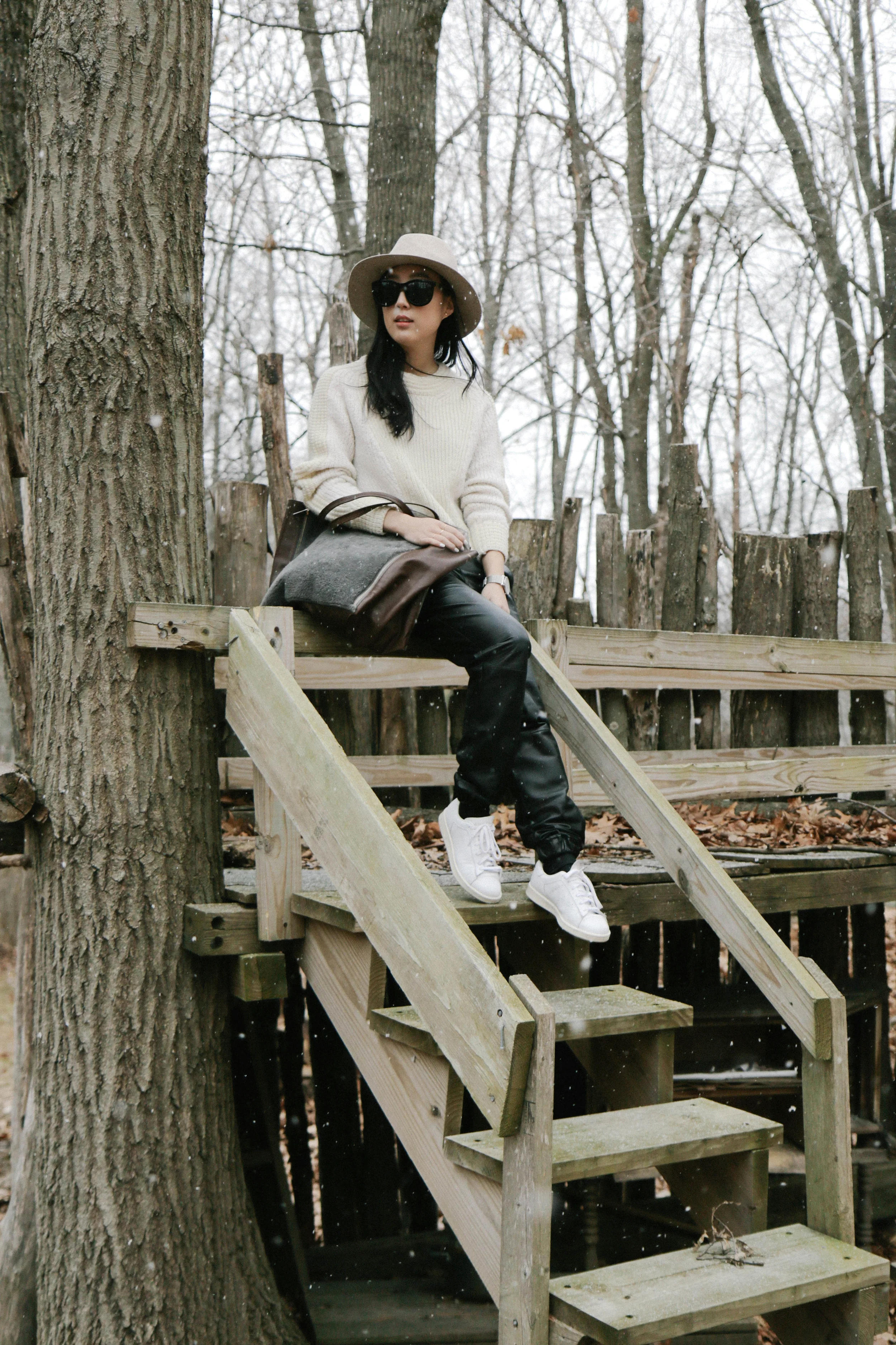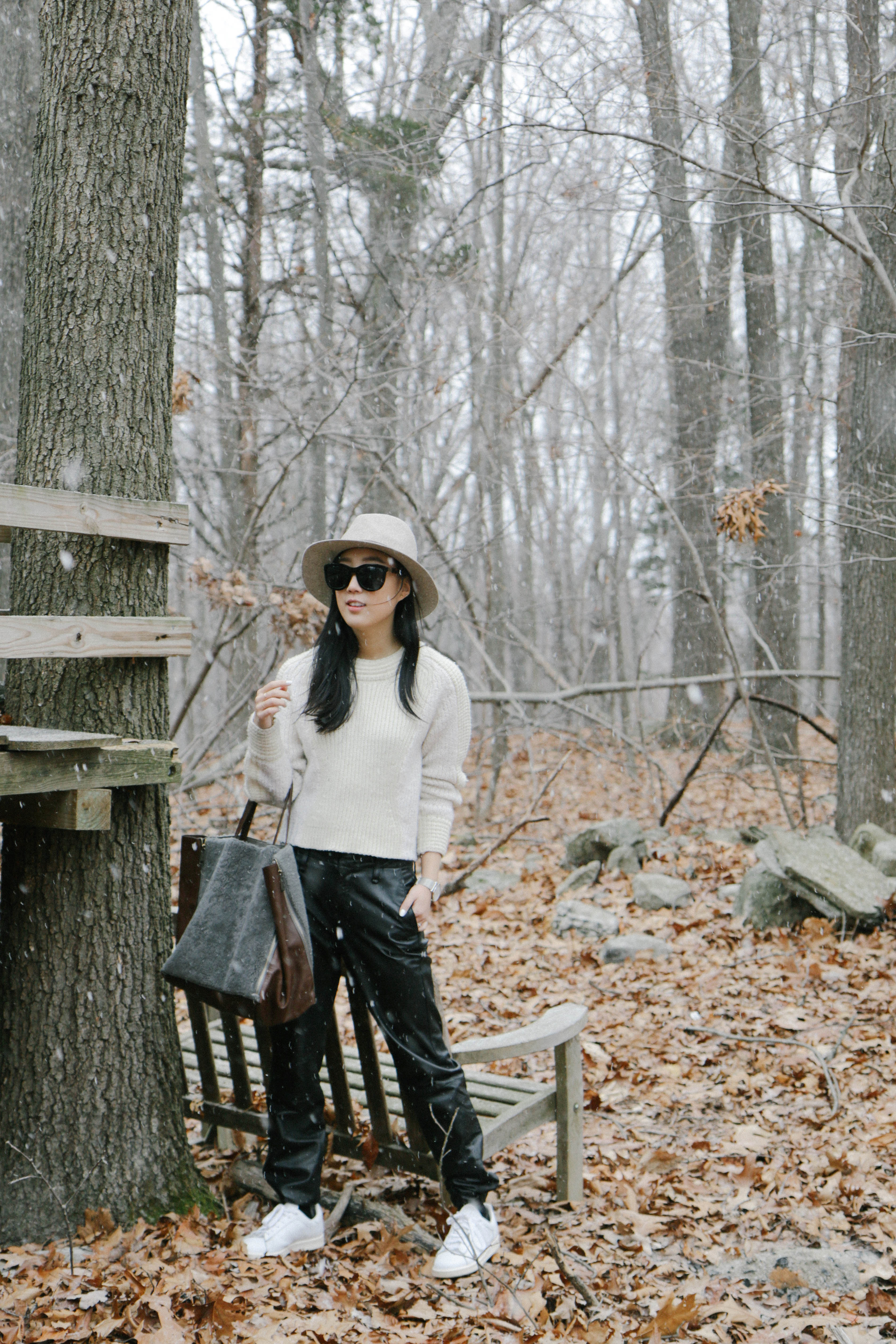 3.1 Phillip Lim Sweater, Rag & Bone Pants, Club Monaco Scarf, Adidas Sneakers, Céline Bag, Janessa Leone Hat, The Row Sunglasses, Larsson and Jennings Watch, Catbird Ring