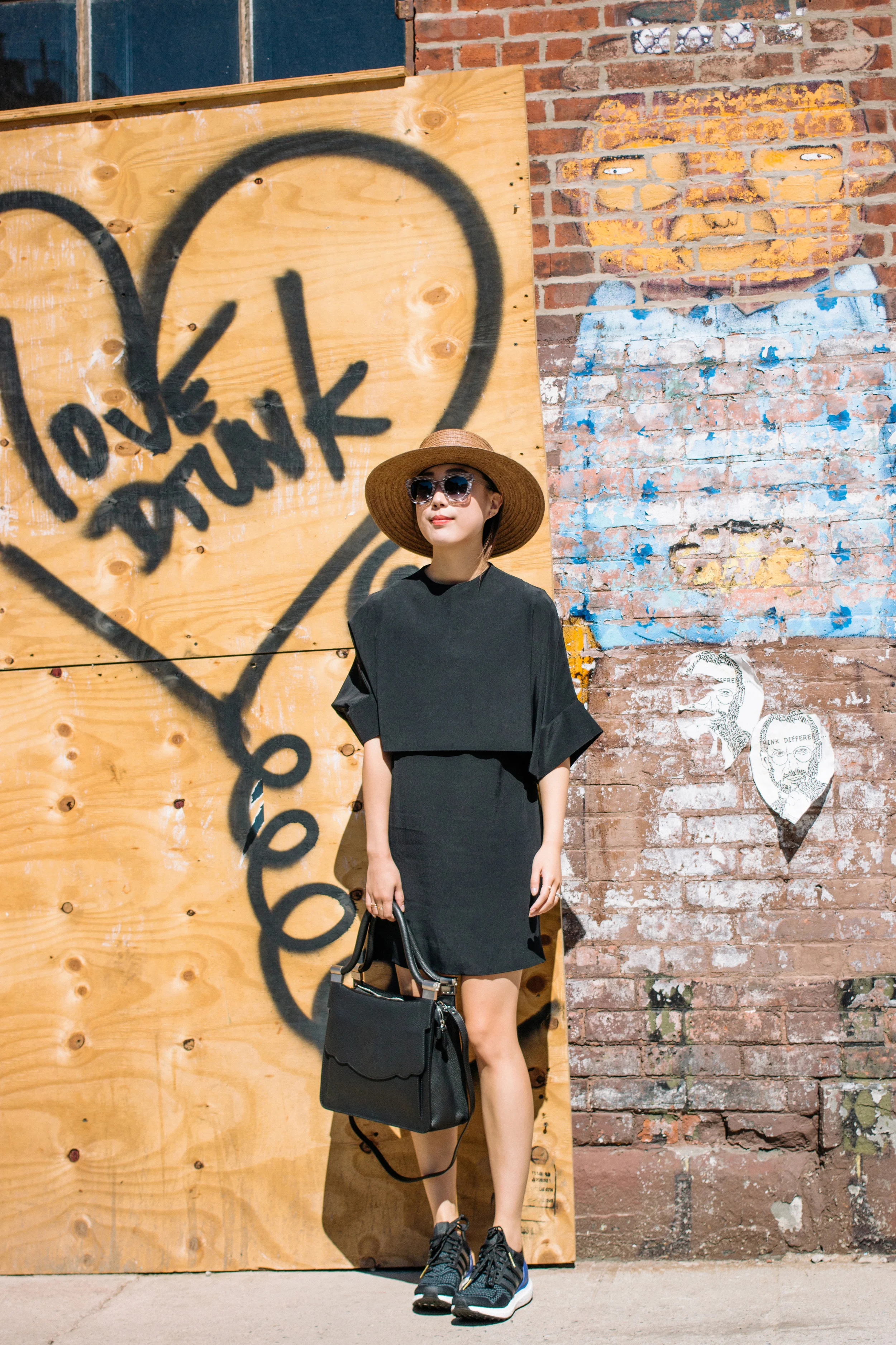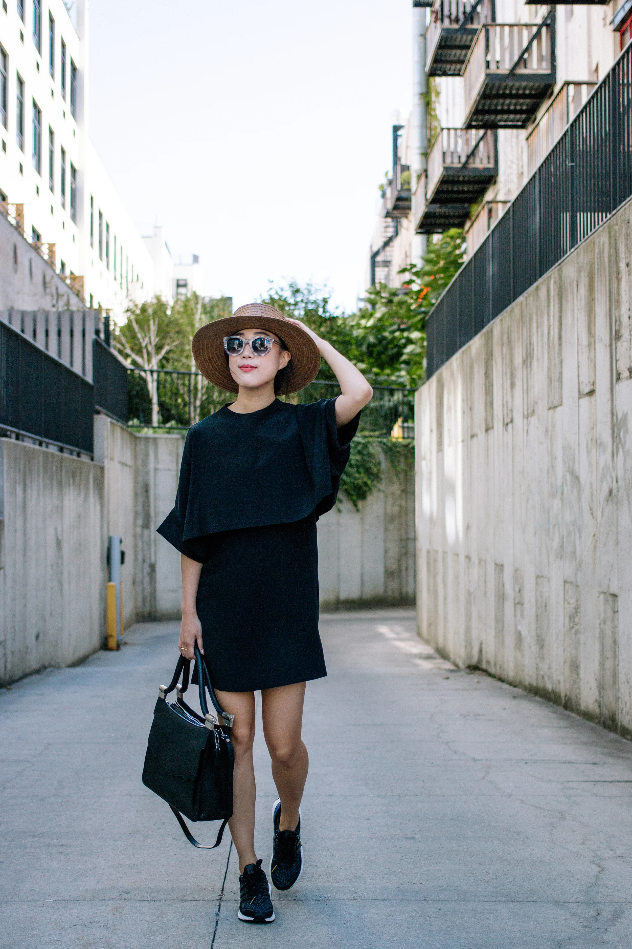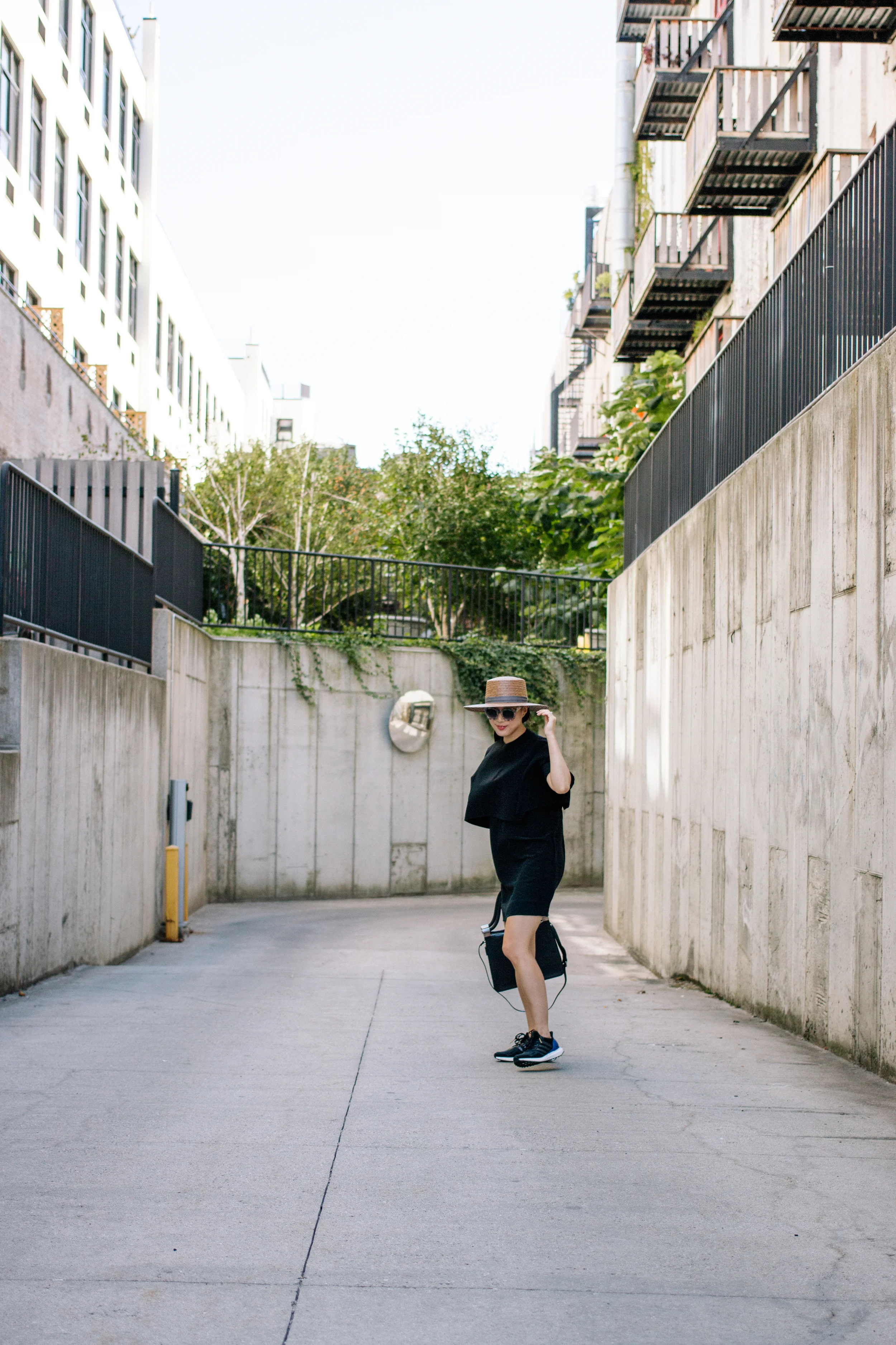 COS Dress, Adidas Sneakers, Thale Blanc Bag, Janessa Leone Hat, Thierry Lasry Sunglasses
