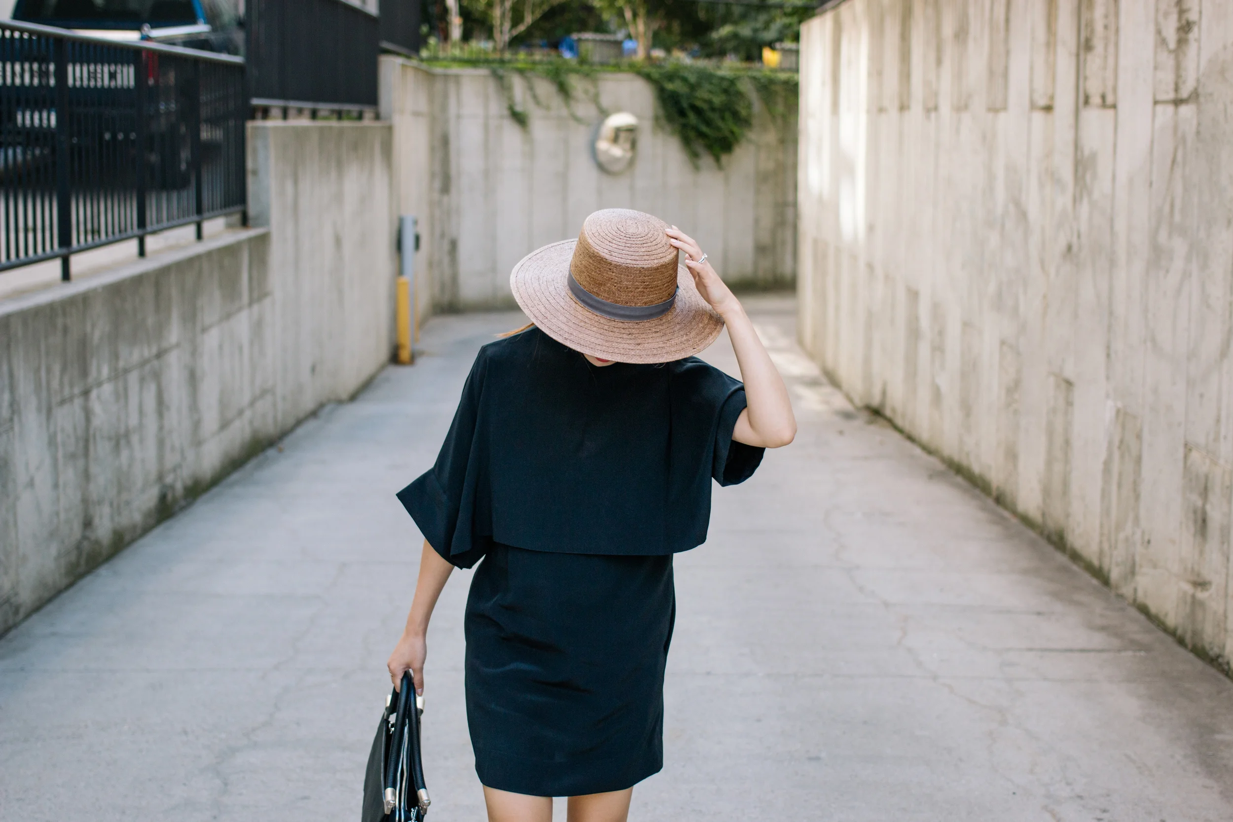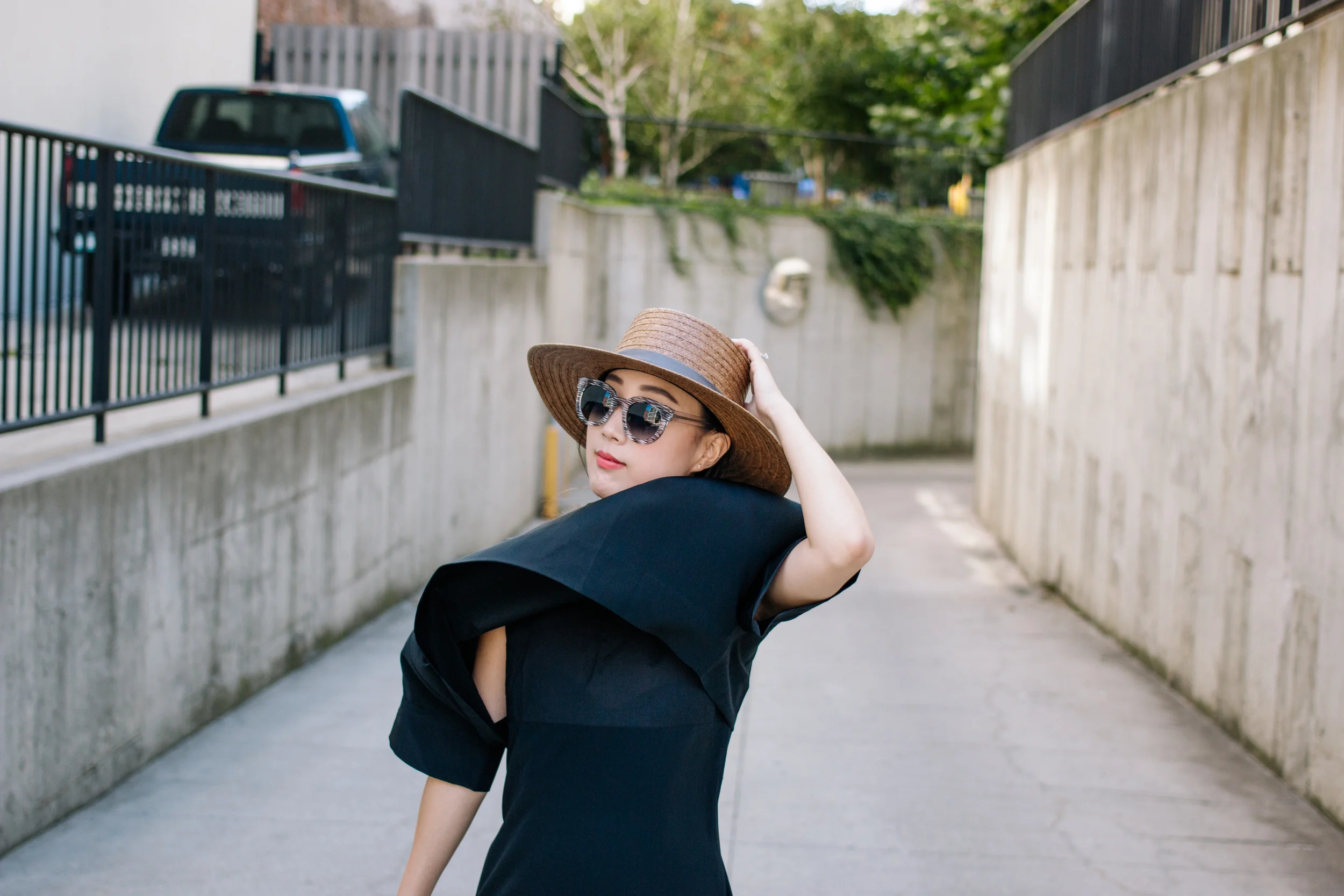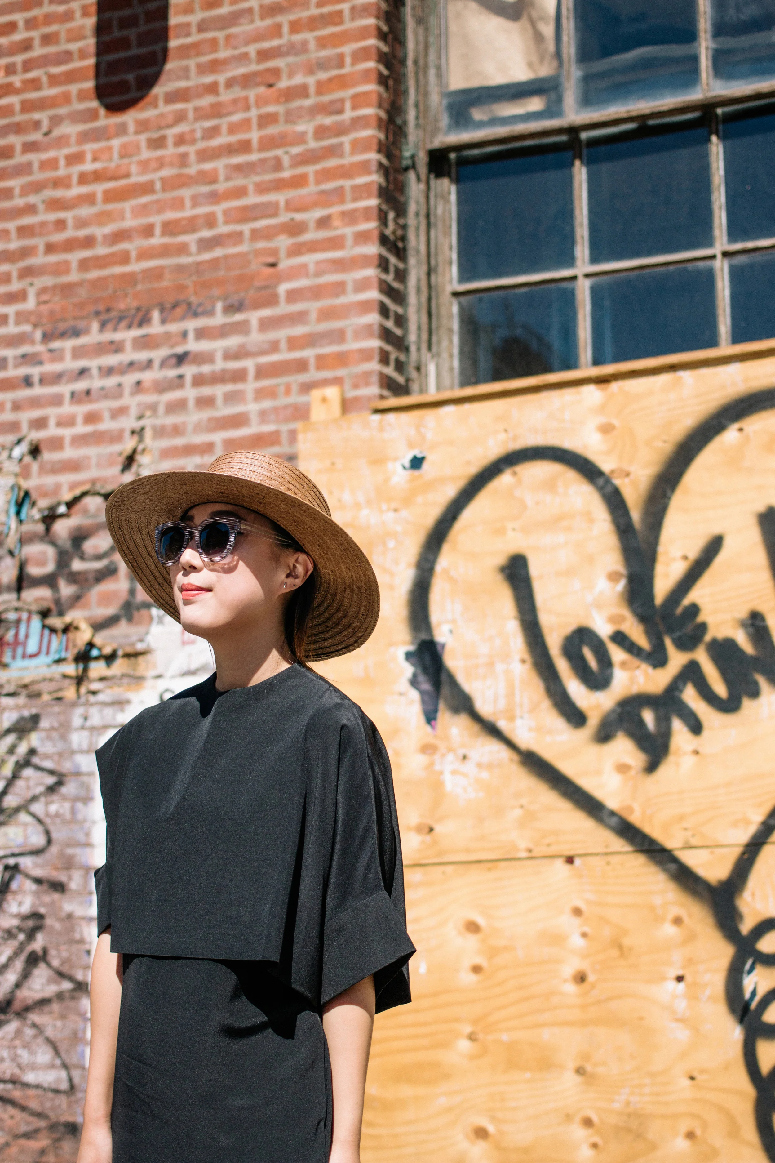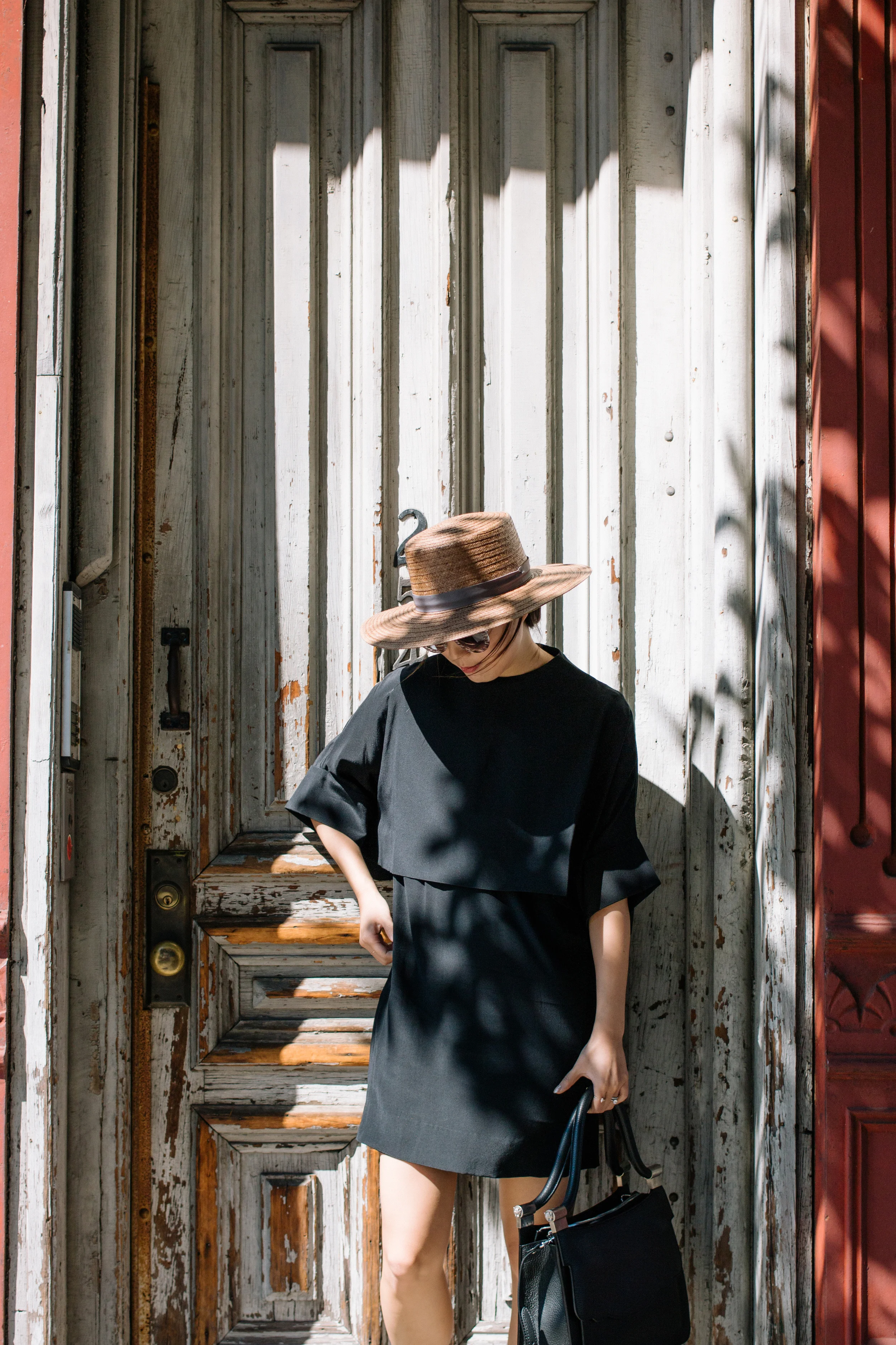 COS Dress, Adidas Sneakers, Thale Blanc Bag, Janessa Leone Hat, Thierry Lasry Sunglasses