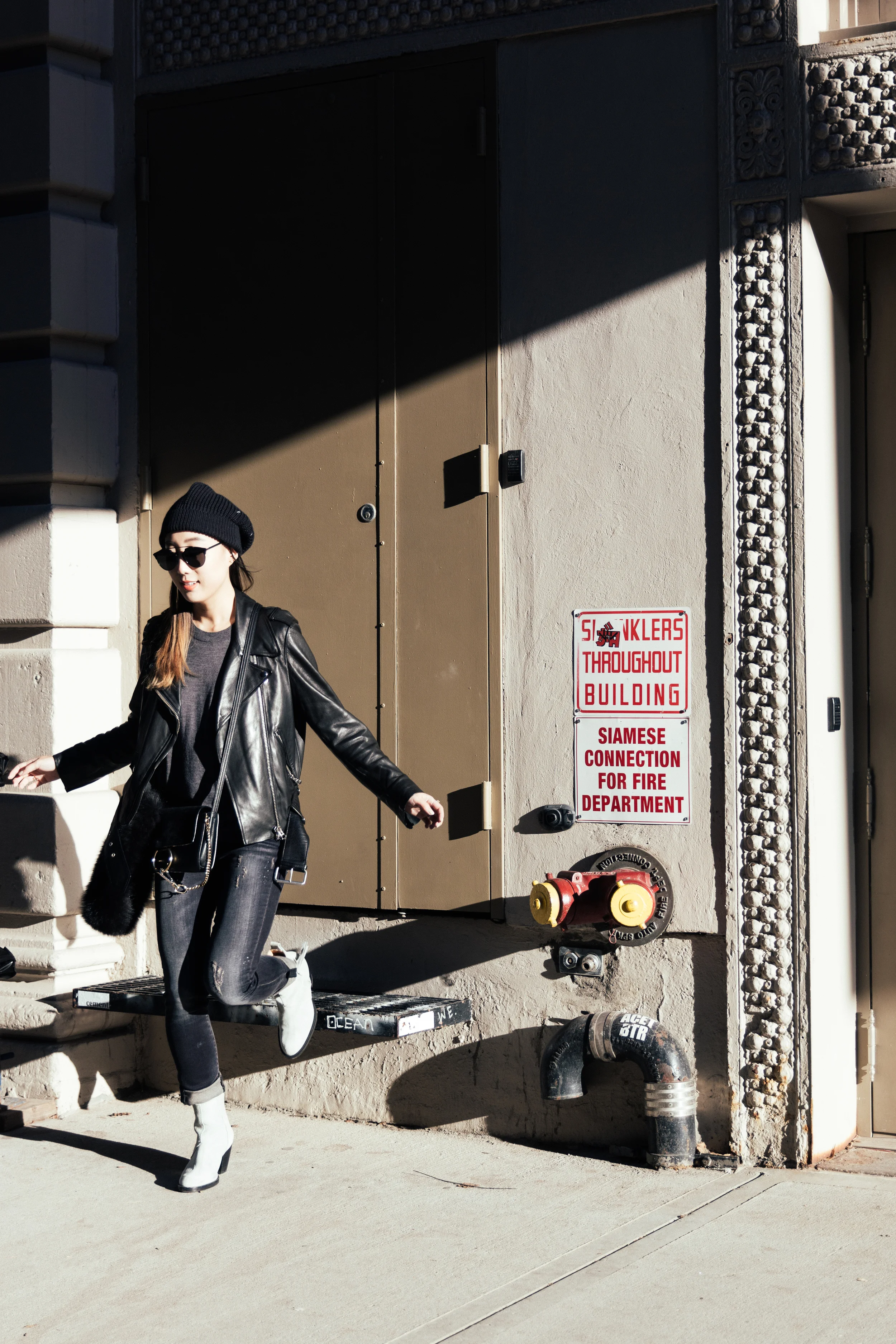 Acne Studios Jacket, Candy and Caviar Sweater, Frame Denim, Chanel Bag, Isabel Marant Boots, Janessa Leone Hat