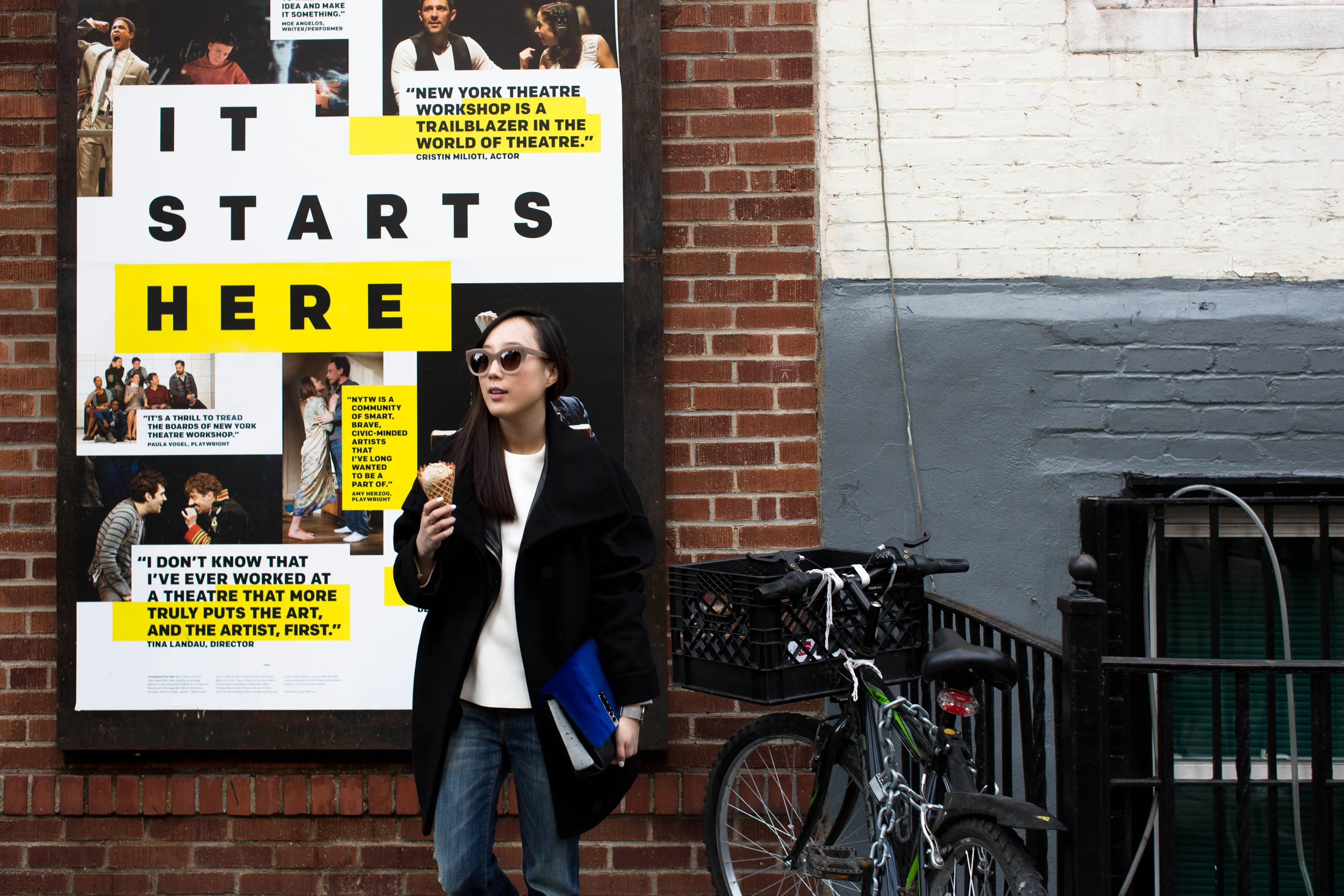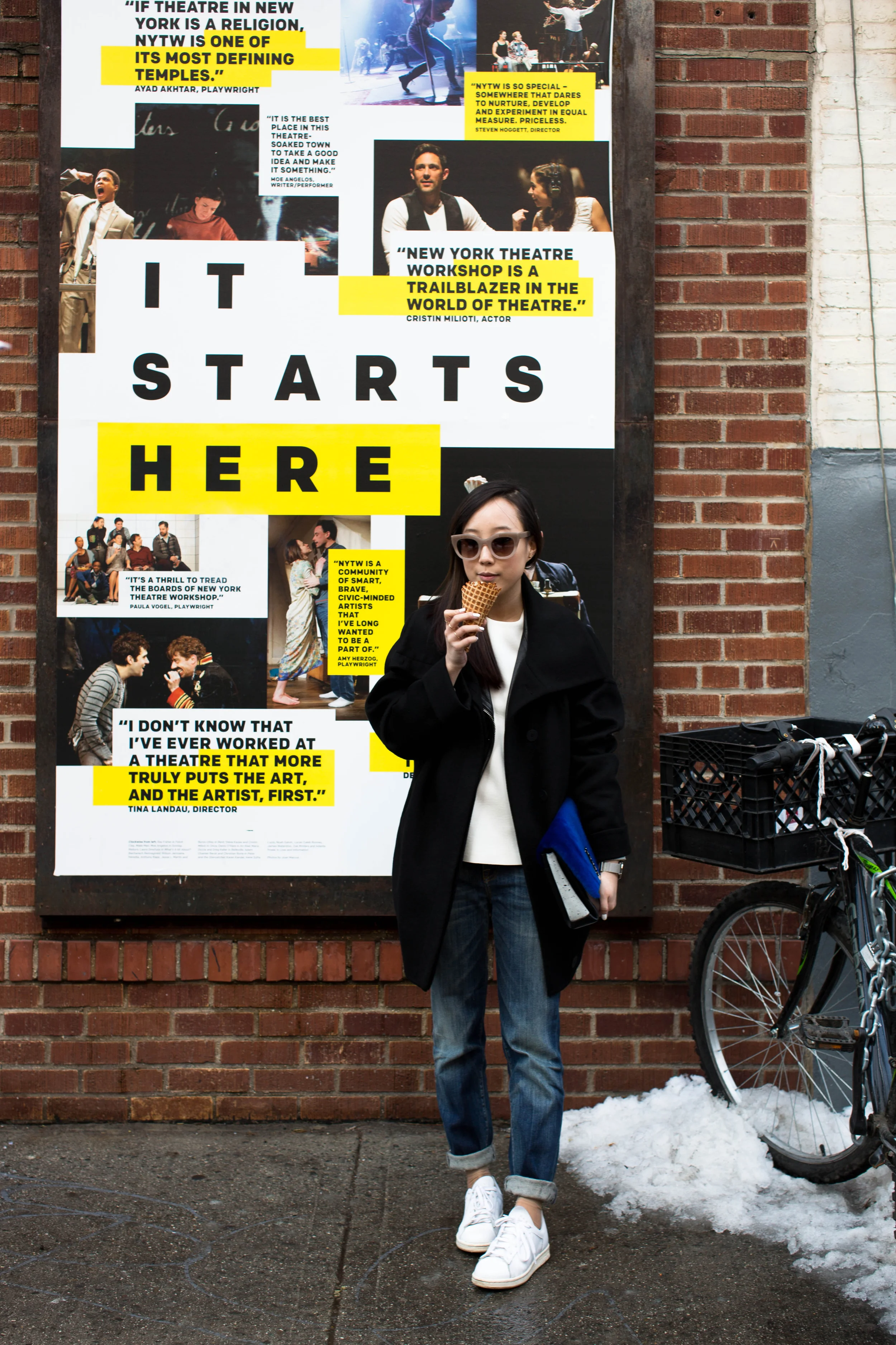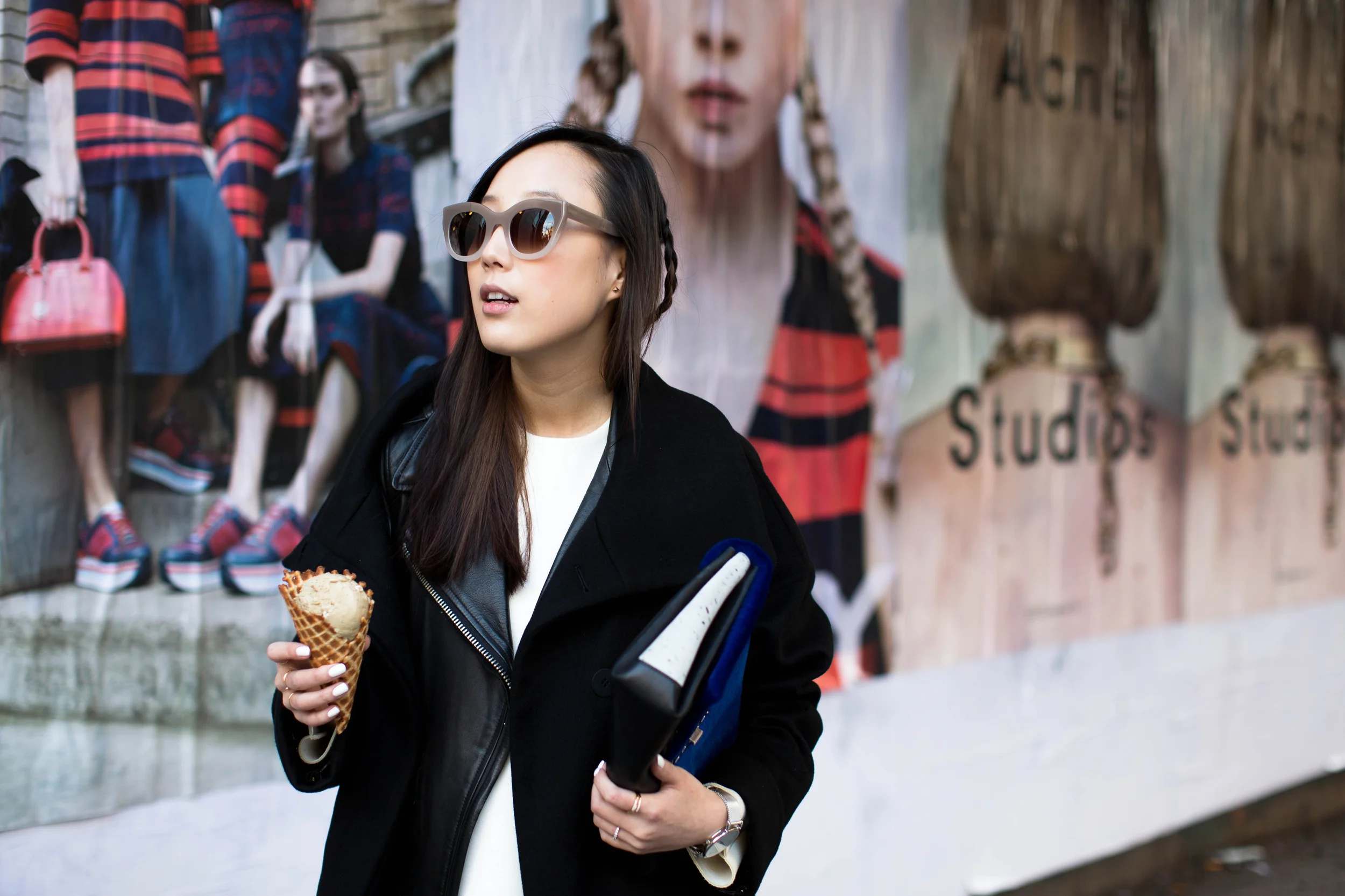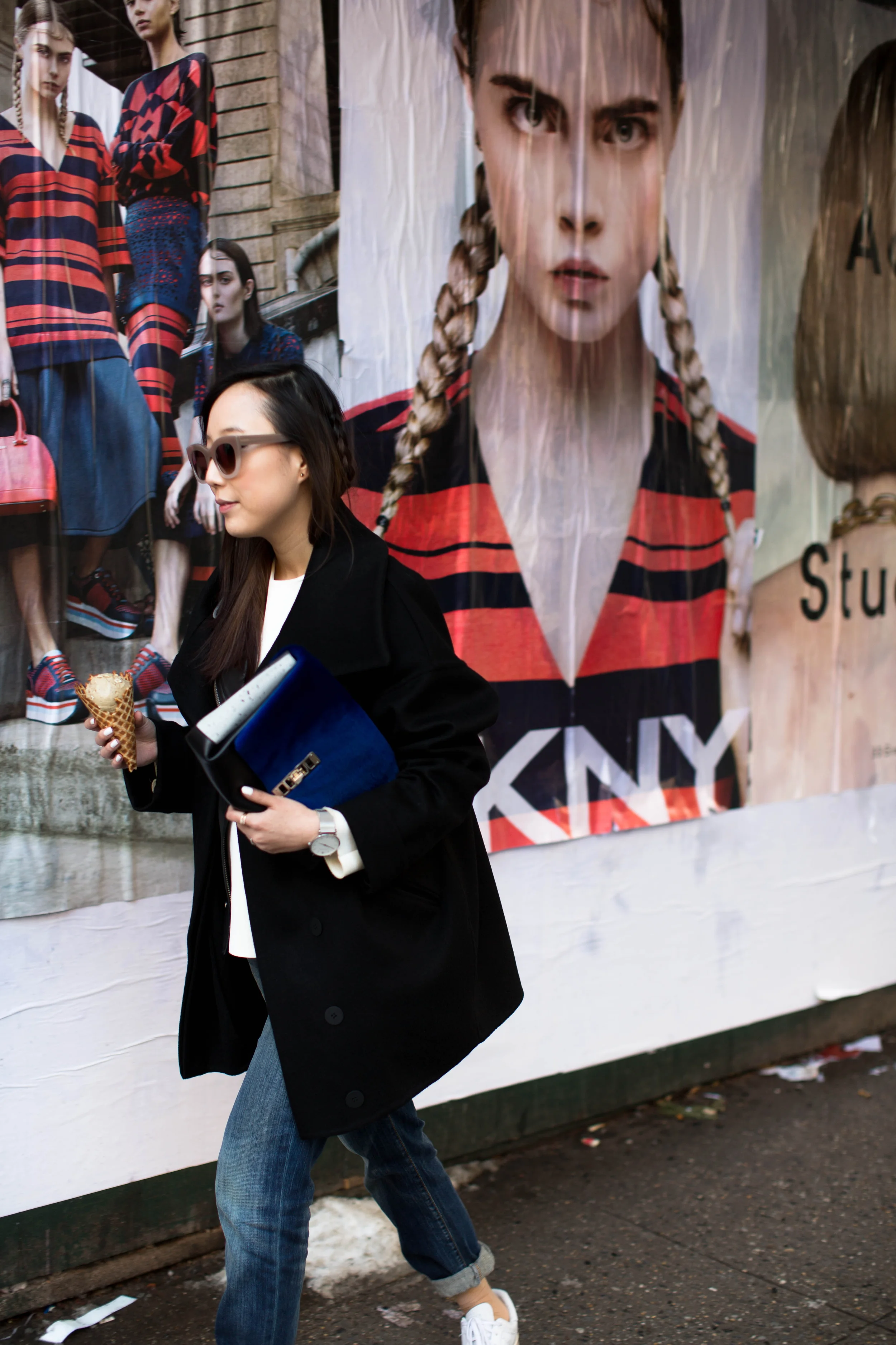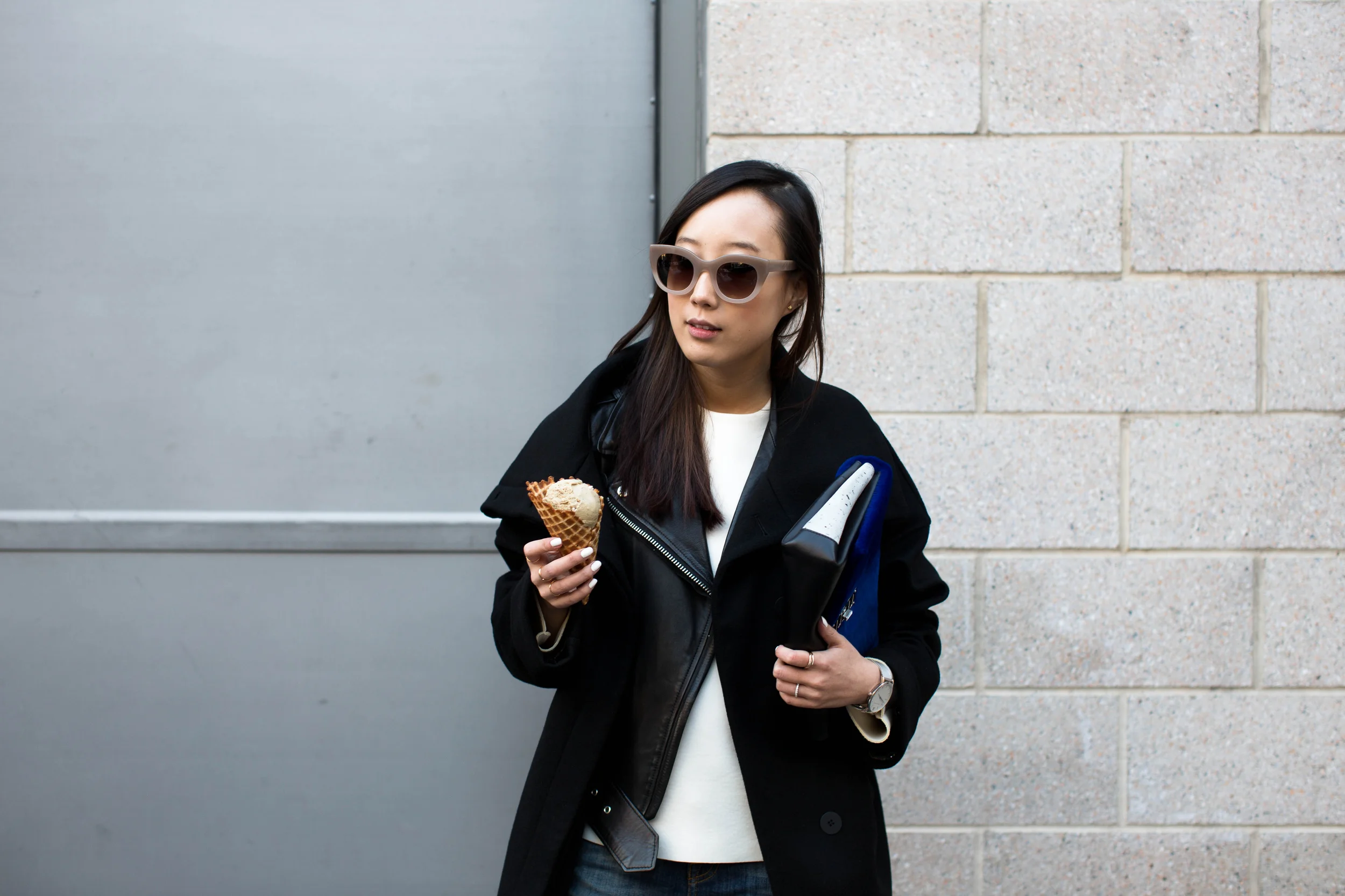 Michelle Waugh Coat, Acne Studios Jacket, COS Top, R13 Denim, Adidas Sneakers, Proenza Schouler Clutch, Thierry Lasry Sunglasses, Larsson & Jennings Watch