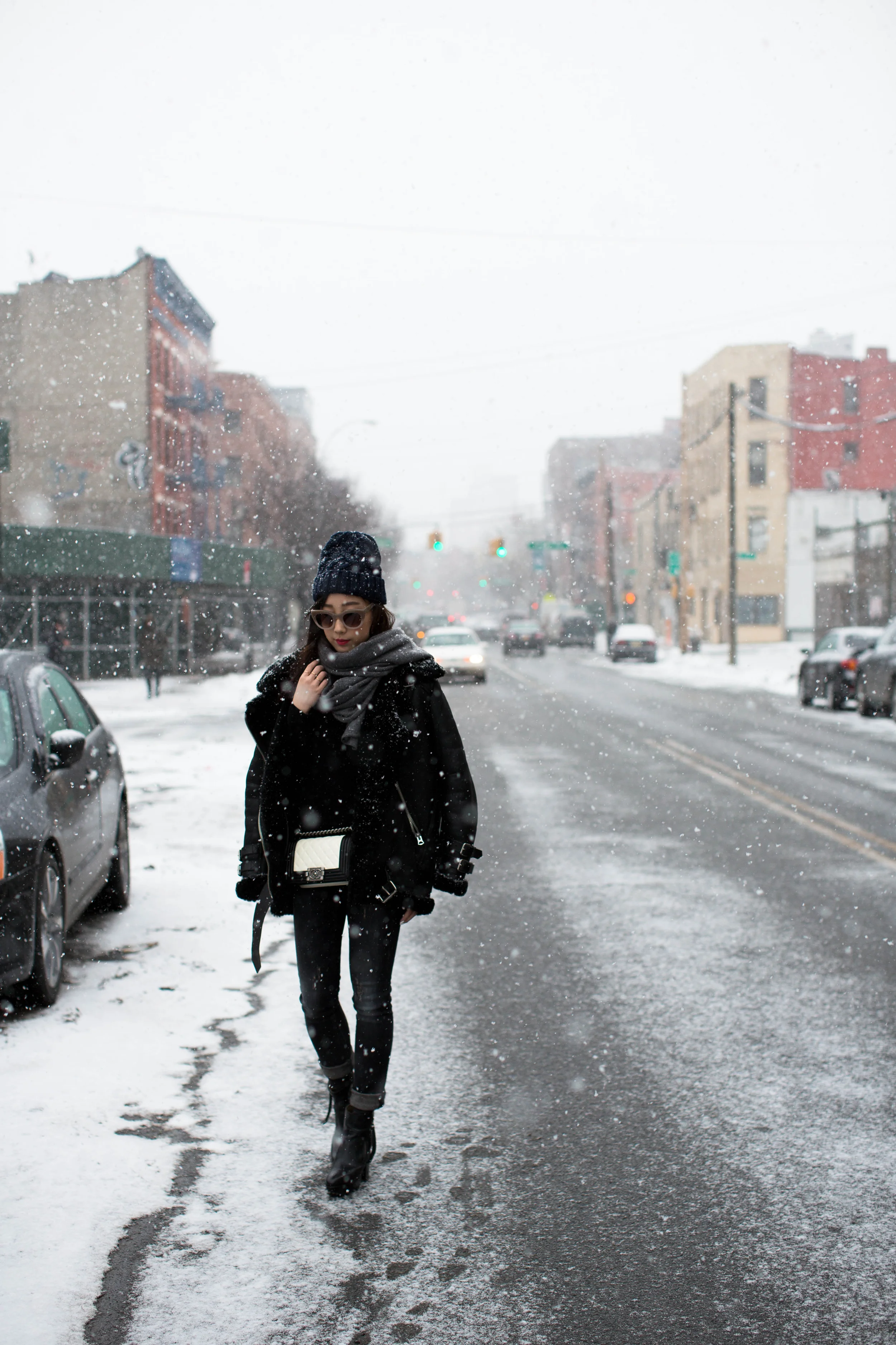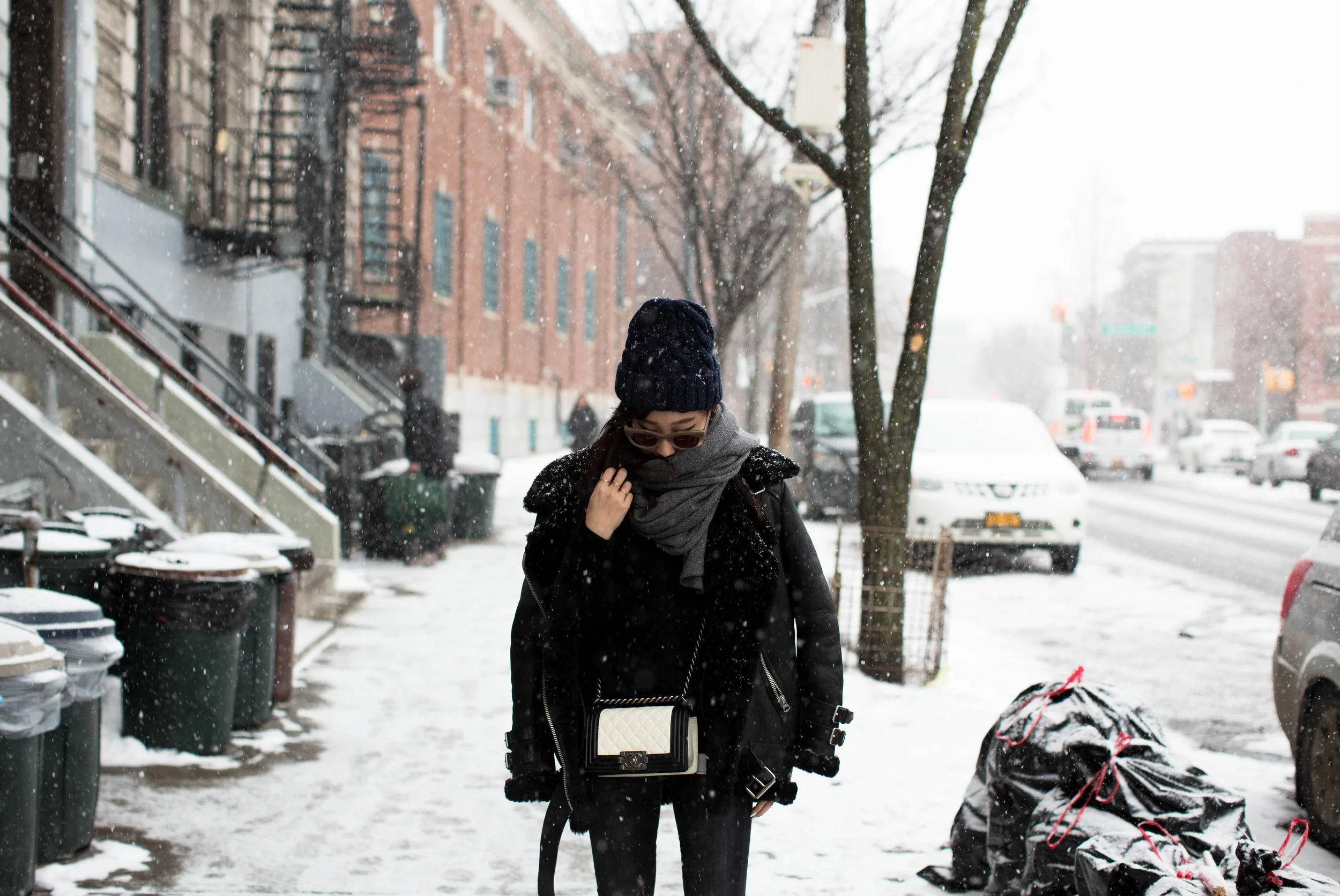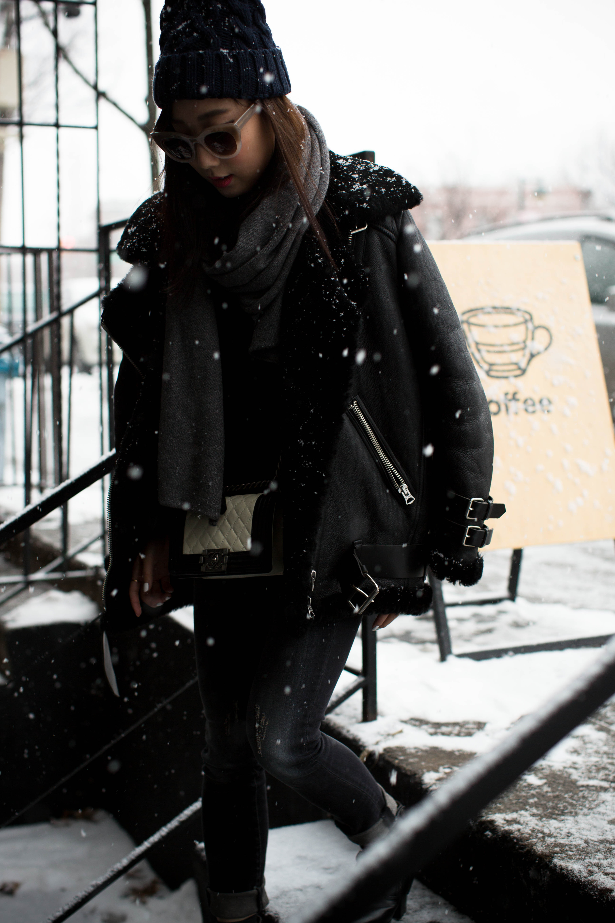 Acne Velocite Coat, Everlane Sweater, Proenza Schouler Top, R13 Denim, Acne Studios Boots, Chanel Bag, COS Scarf, & Other Stories Hat, Thierry Lasry Sunglasses