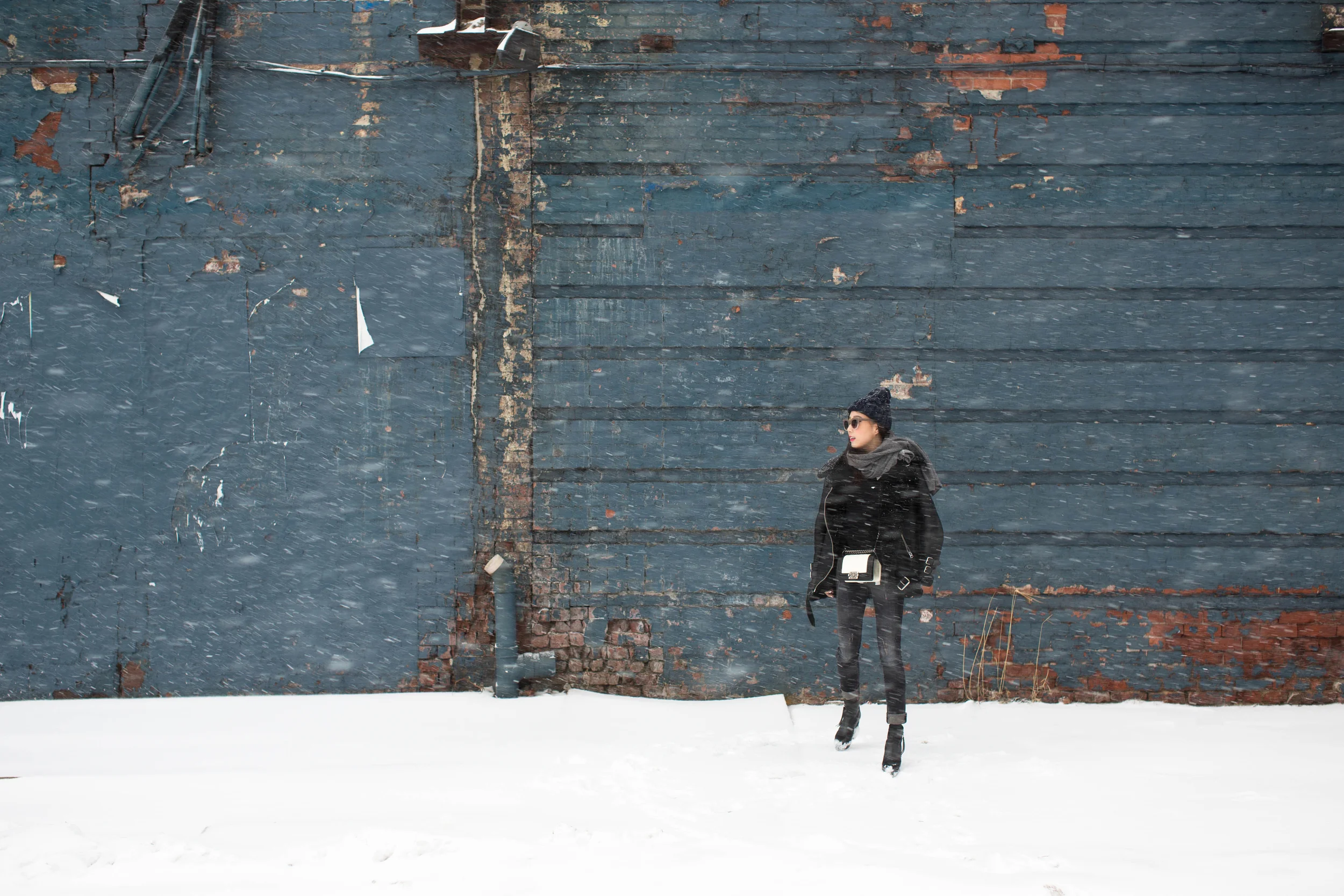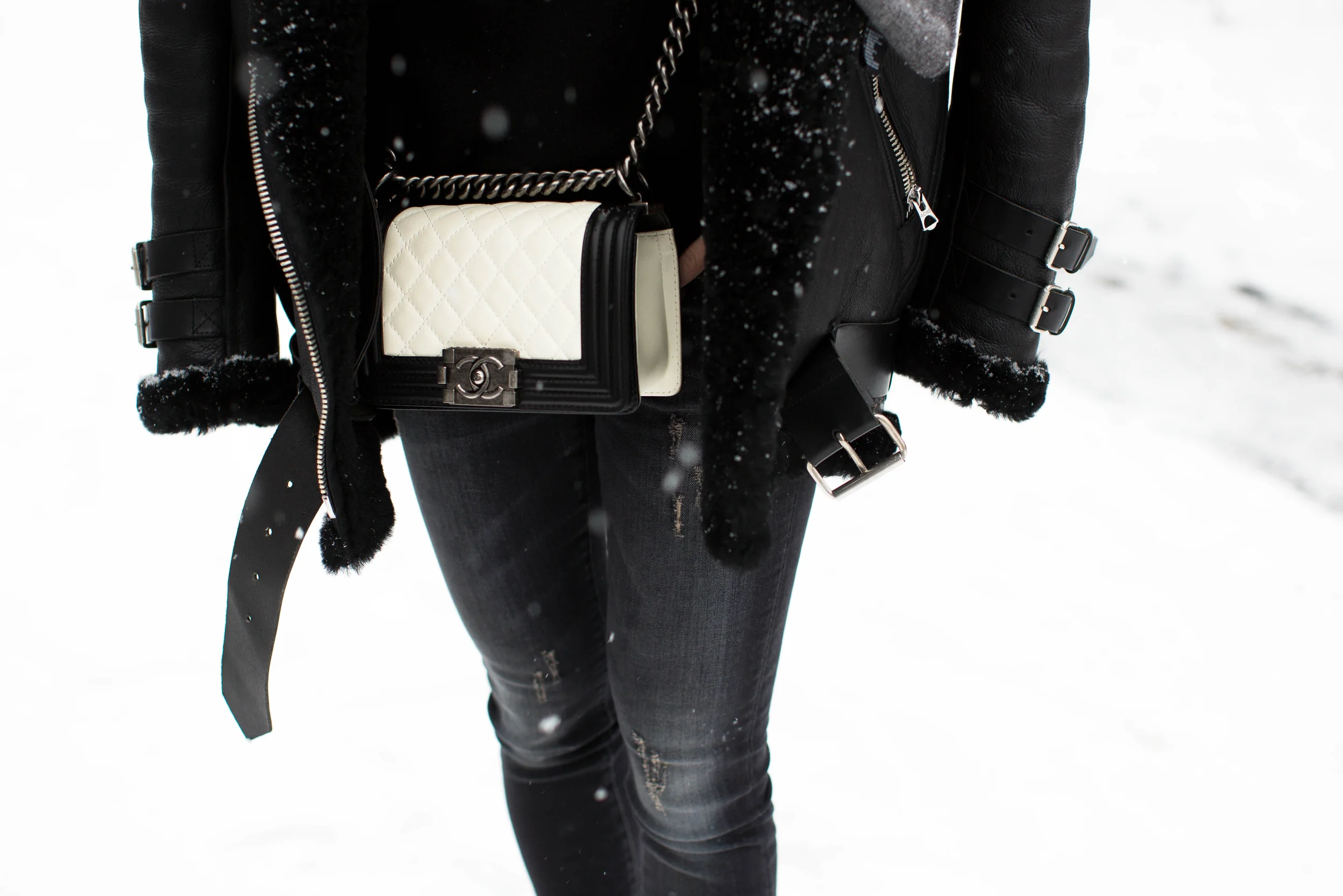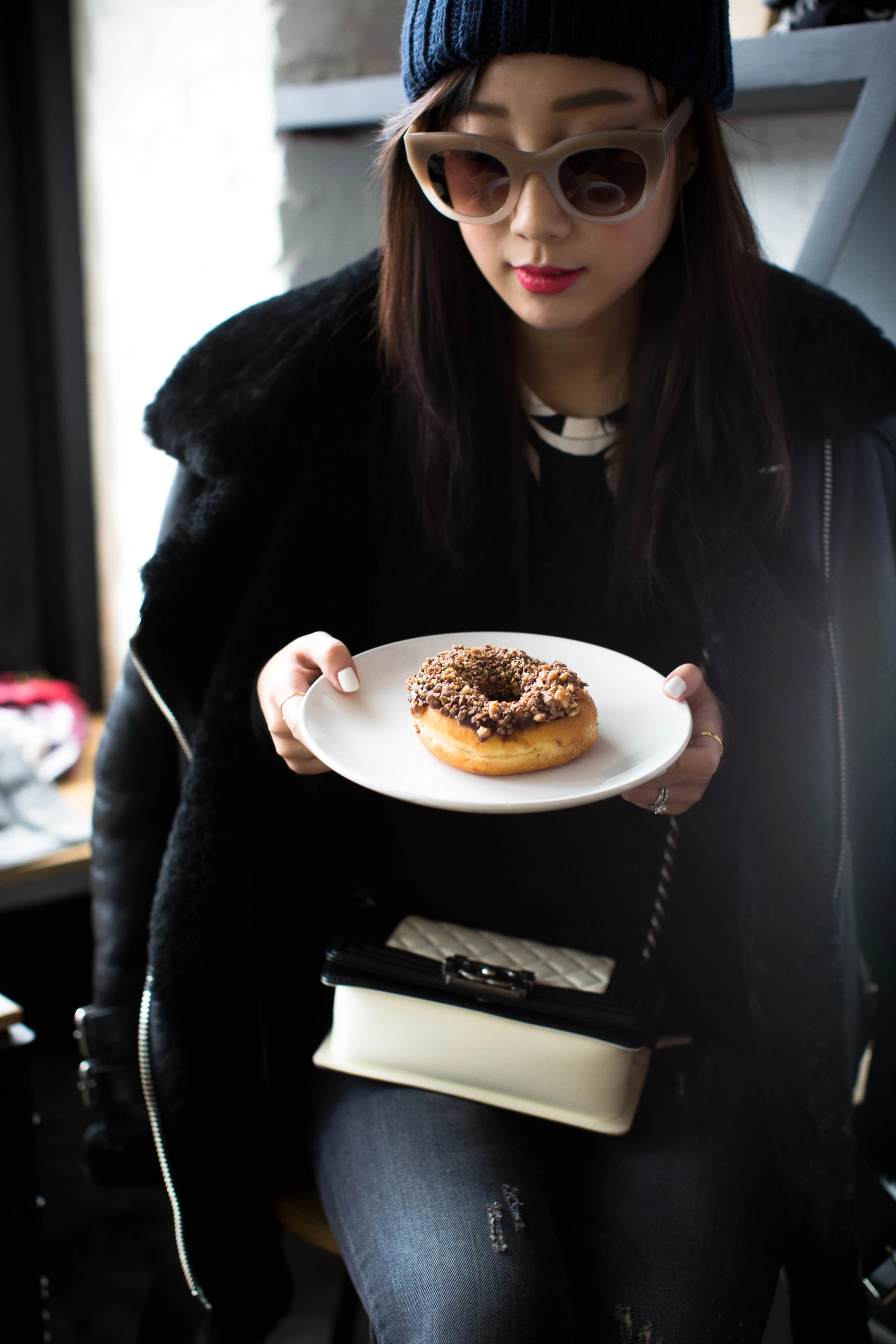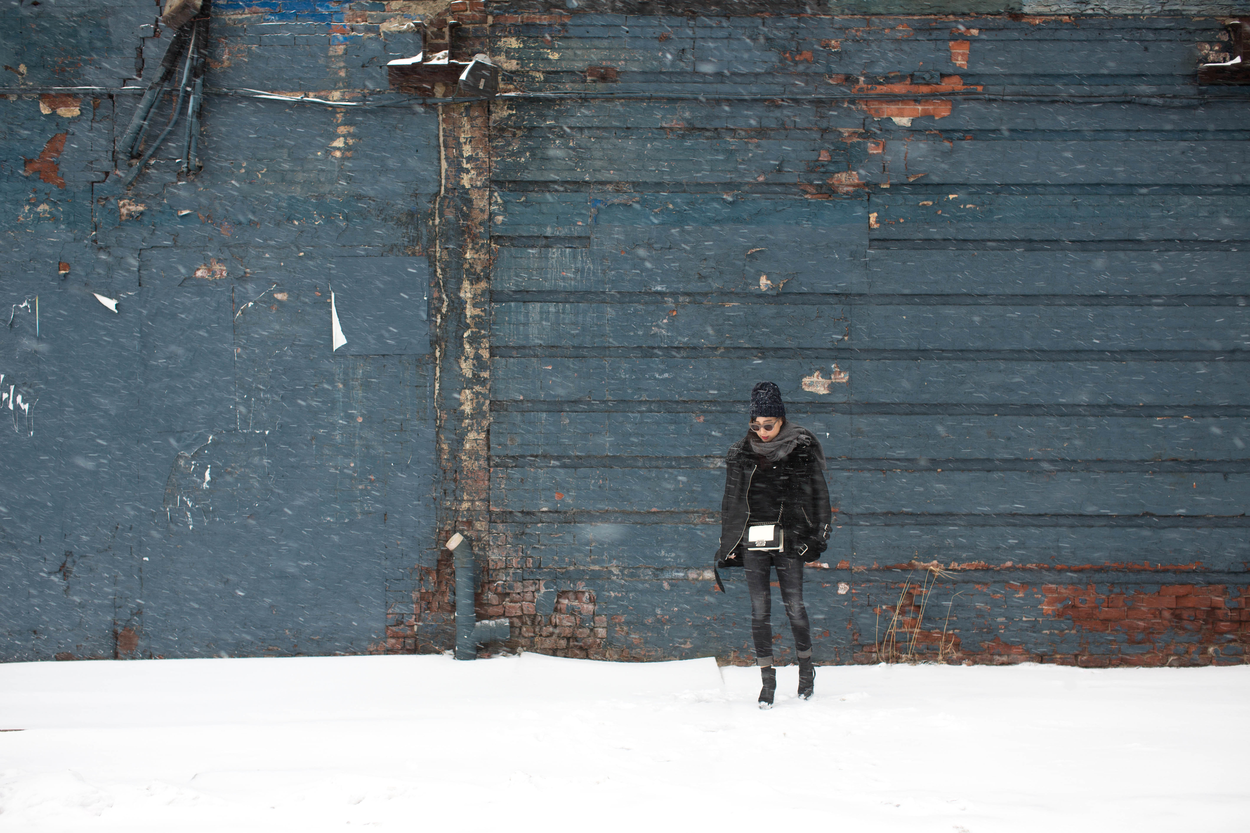 Acne Velocite Coat, Everlane Sweater, Proenza Schouler Top, R13 Denim, Acne Studios Boots, Chanel Bag, COS Scarf, & Other Stories Hat, Thierry Lasry Sunglasses