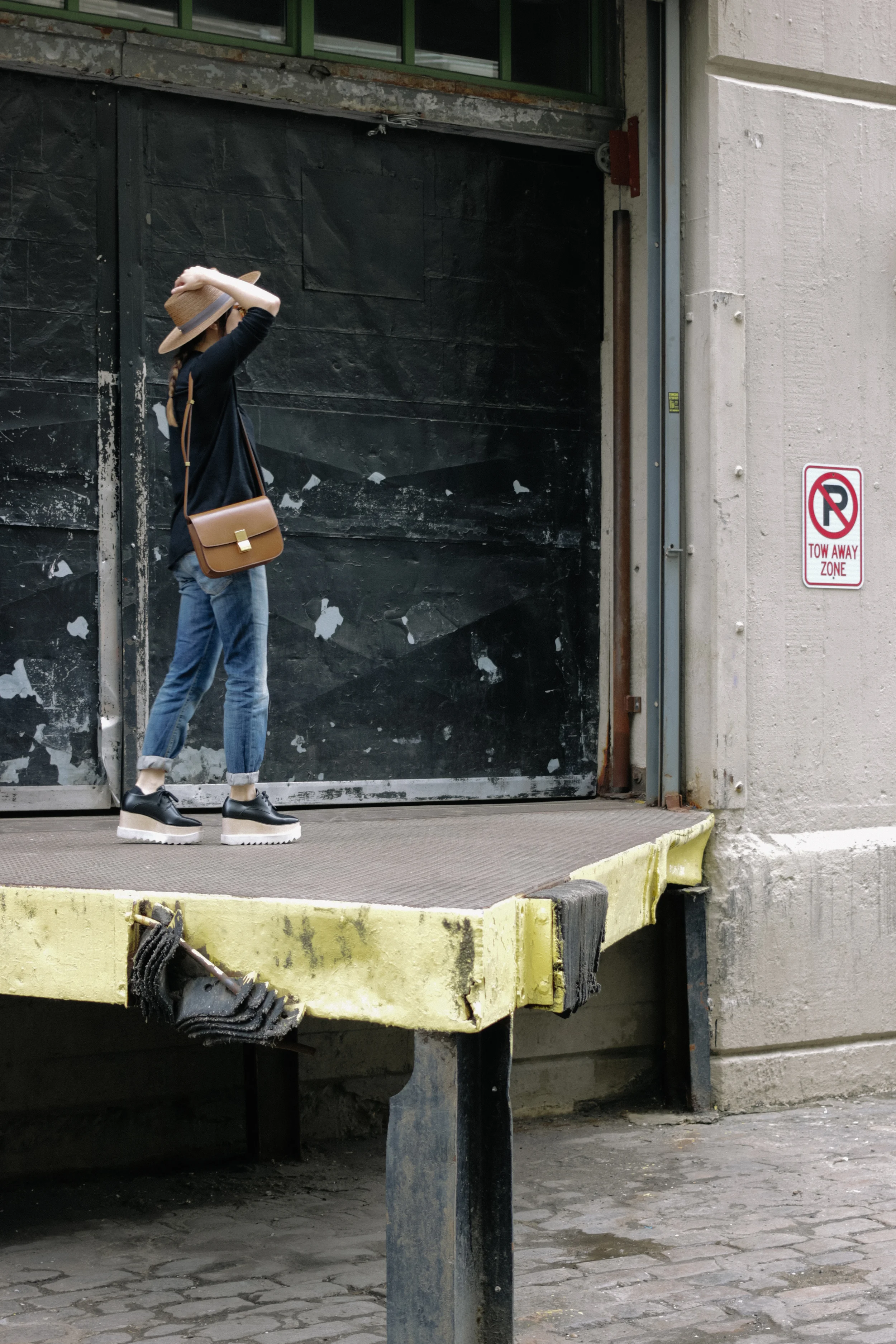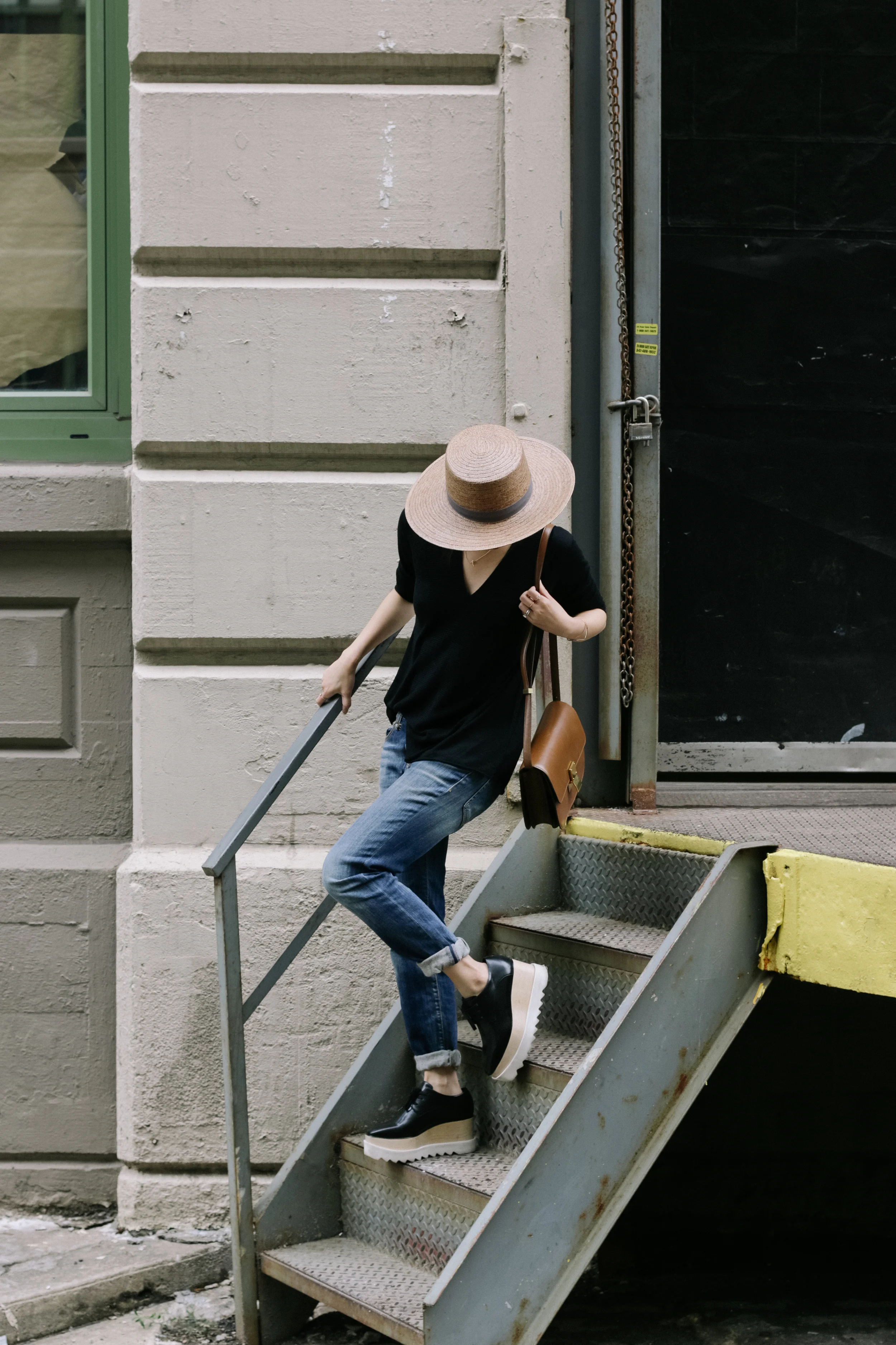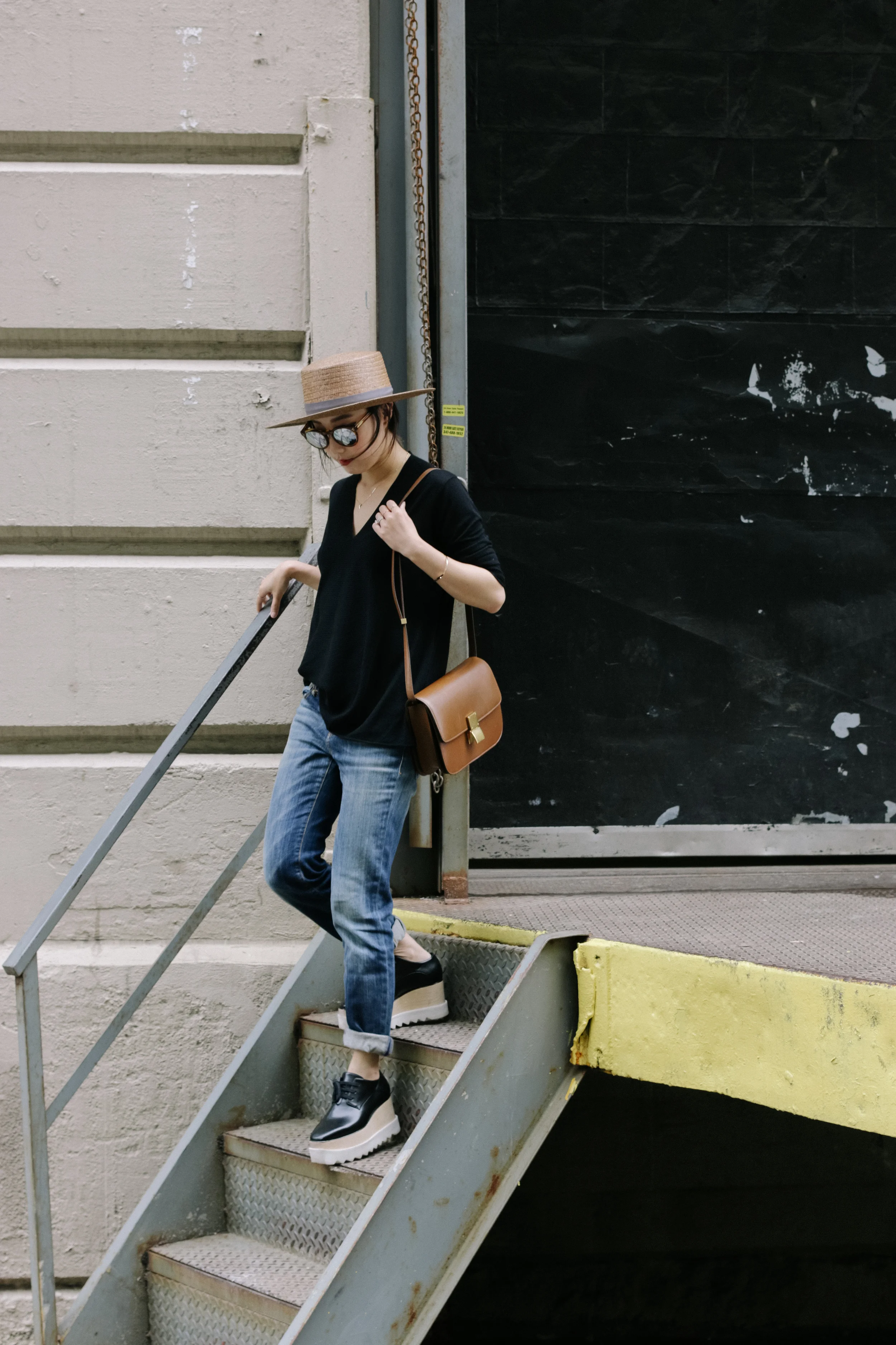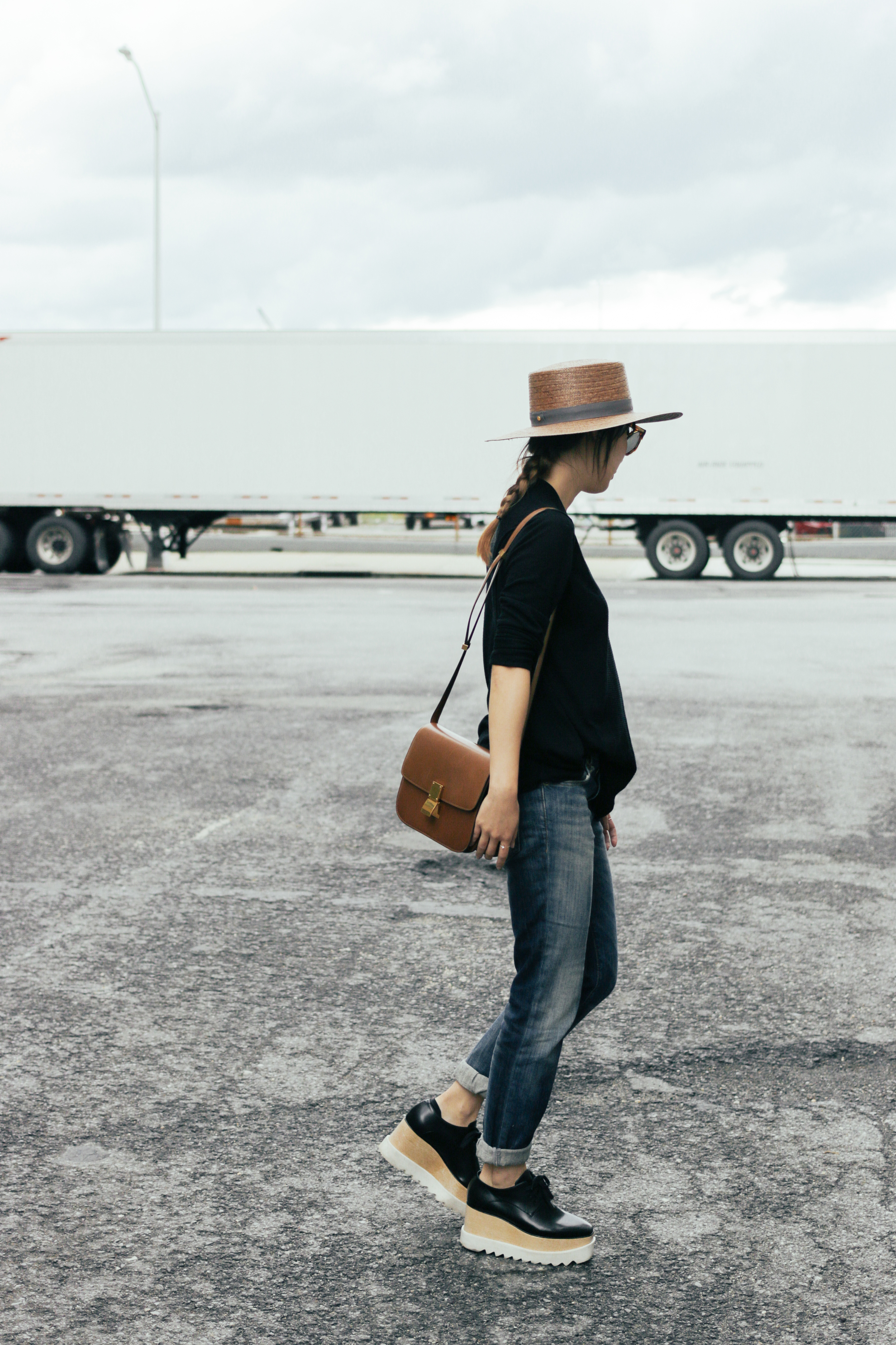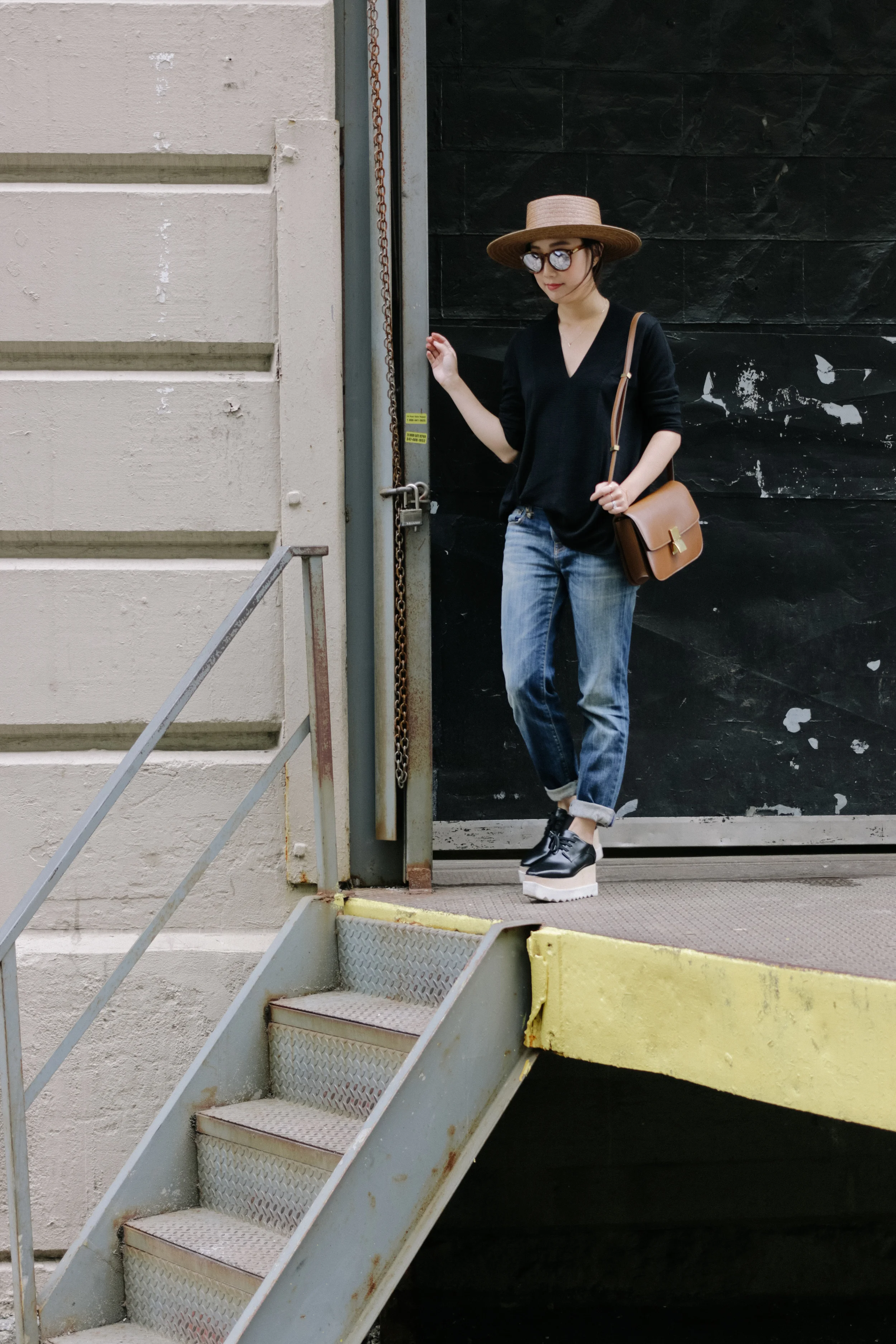 Kokun Knit, R13 Denim, Stella McCartney Shoes, Céline Bag, Janessa Leone Hat, Illesteva Sunglasses (Dark Frames), Mirlo Jewelry
