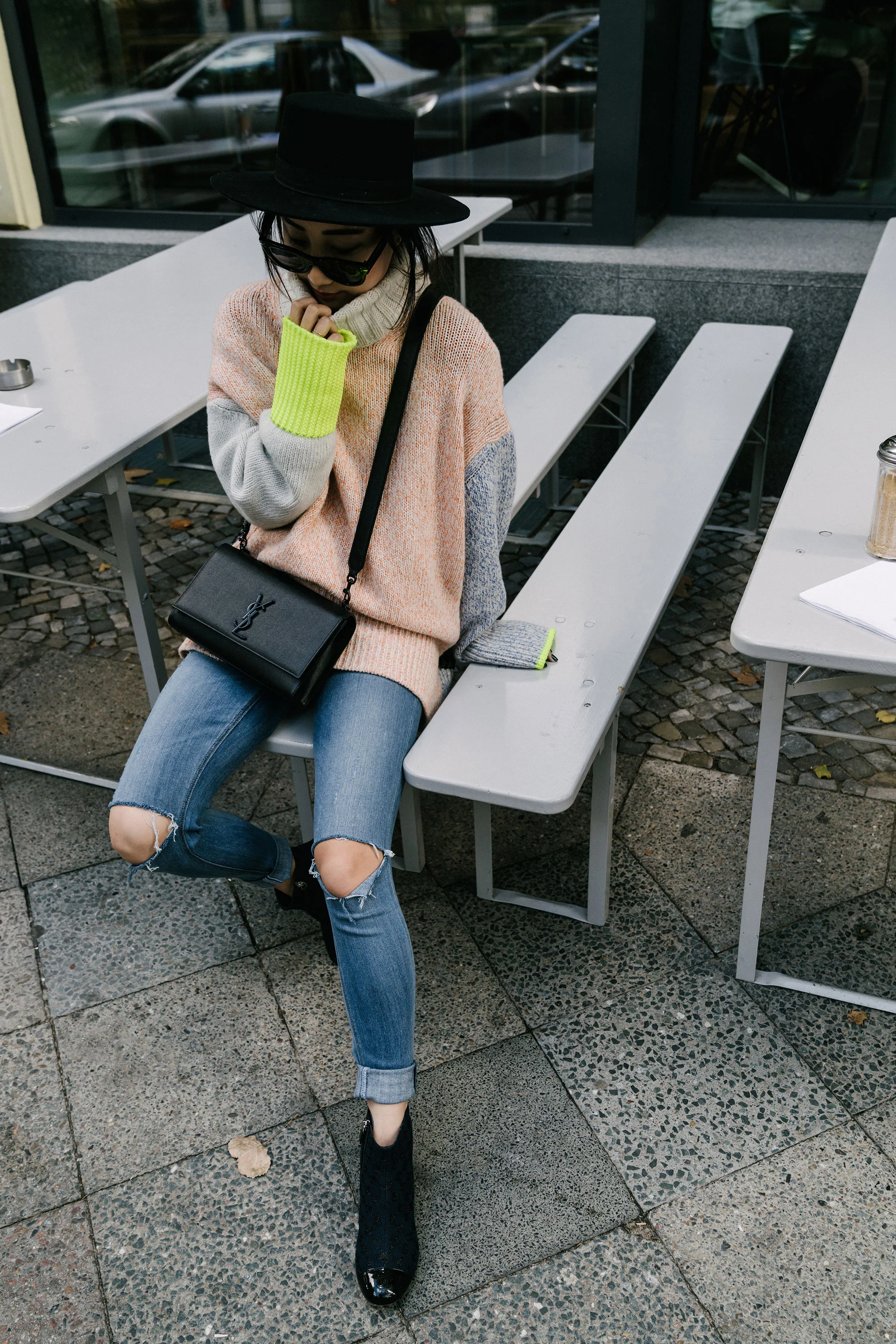 Tomorrowland Sweater, GRLFRND Denim, Chanel Shoes, Saint Laurent Bag, Janessa Leone Hat, Céline Sunglasses