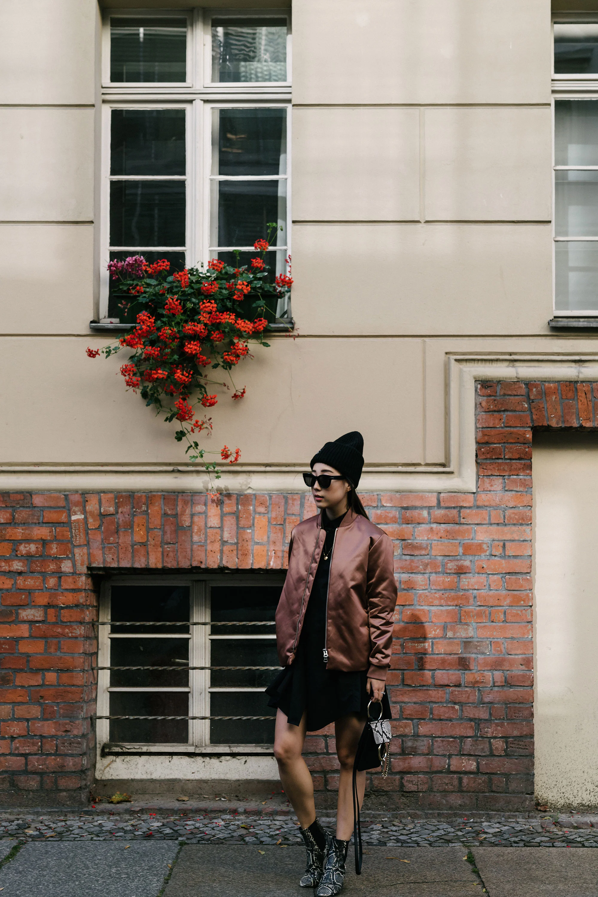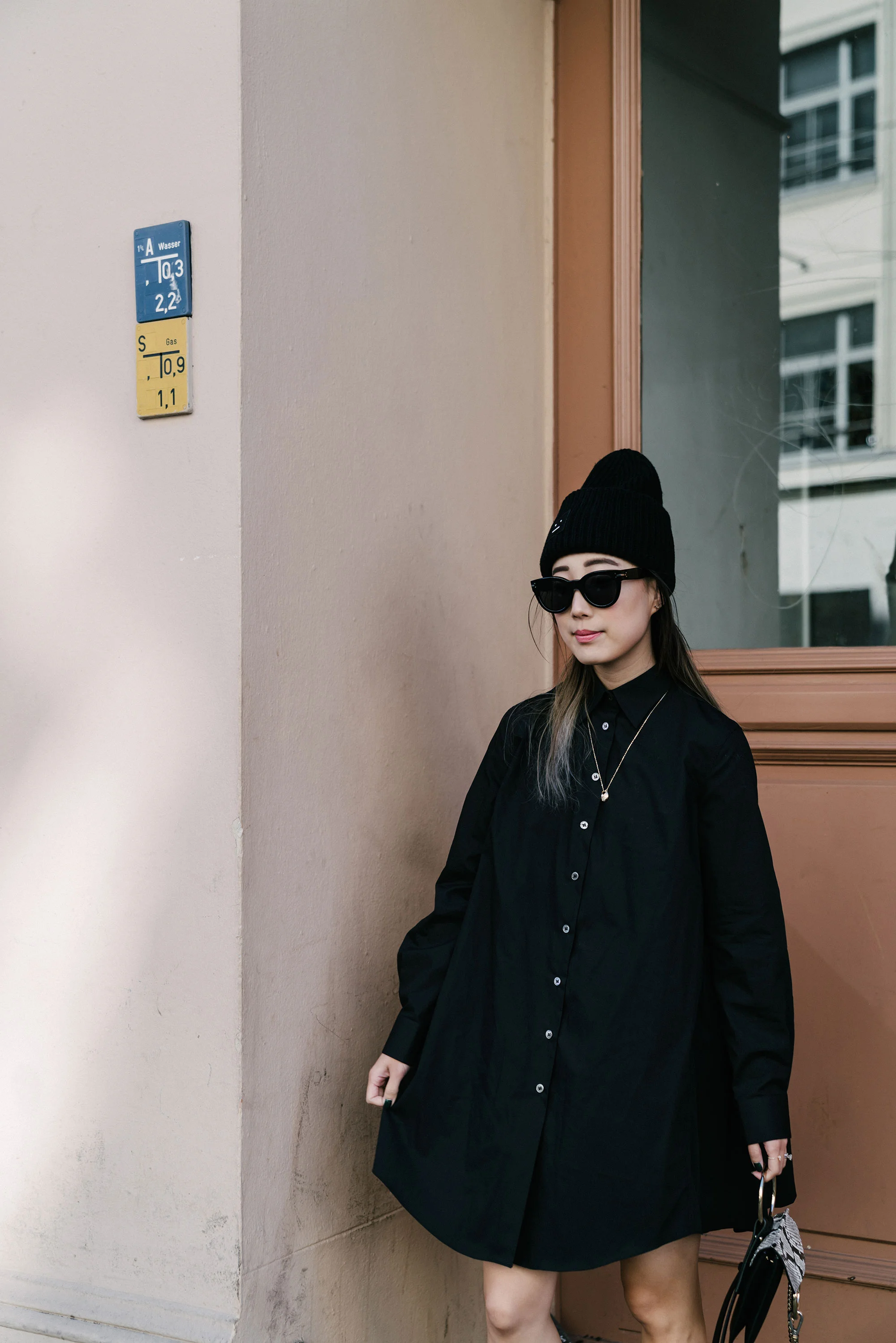 Acne Studios Jacket, Jourden Dress, Chloé Bag, Isabel Marant Shoes, Acne Studios Beanie, Céline Sunglasses, Cartier Necklace