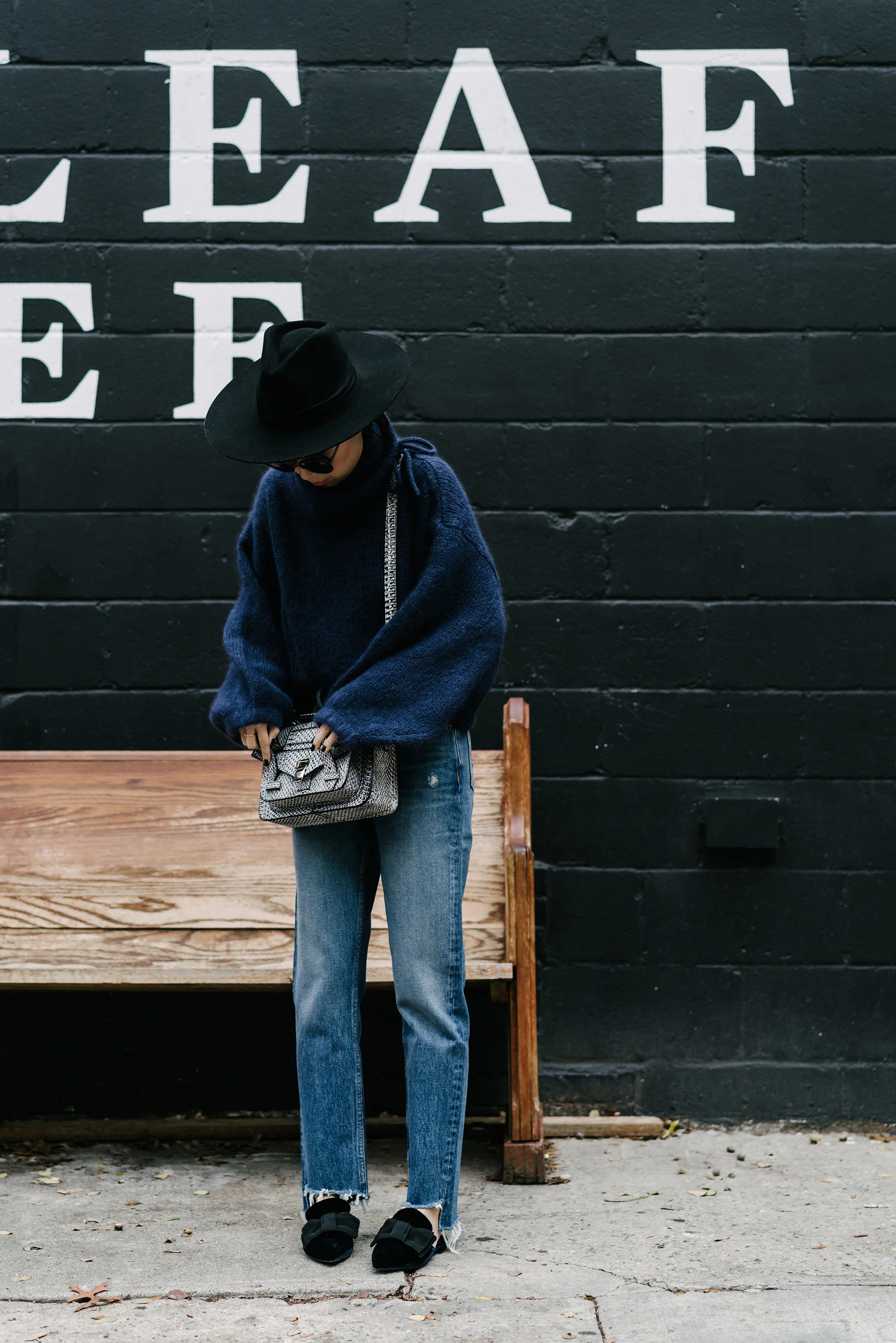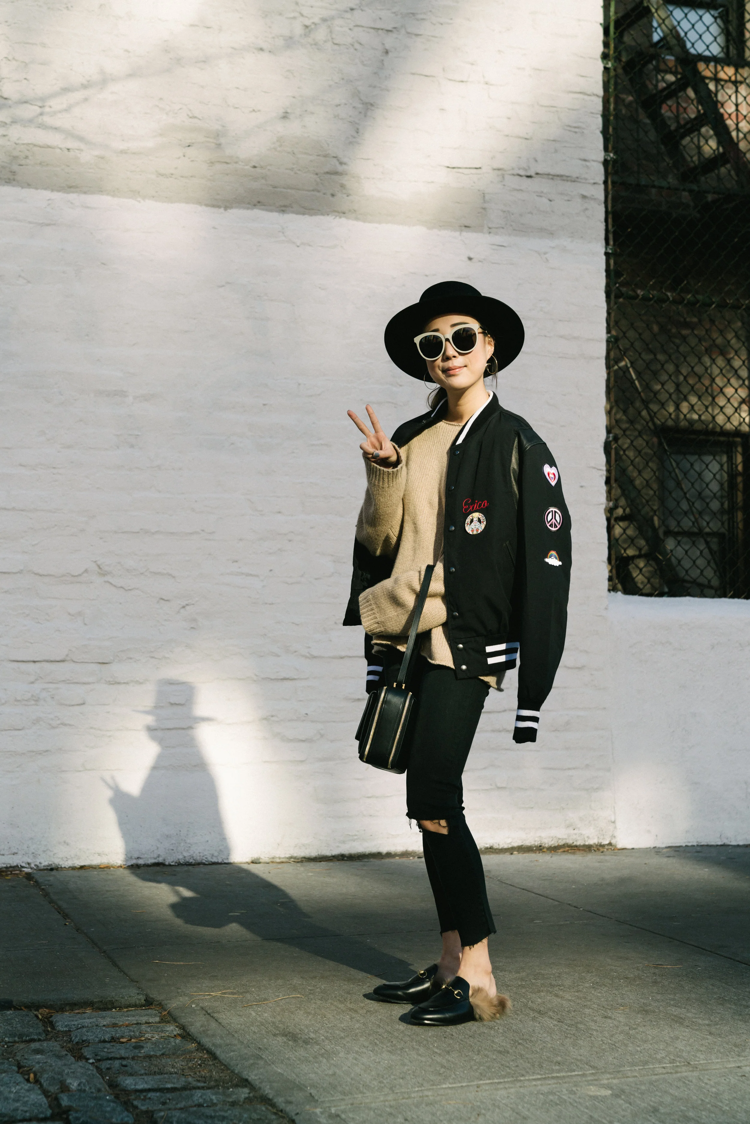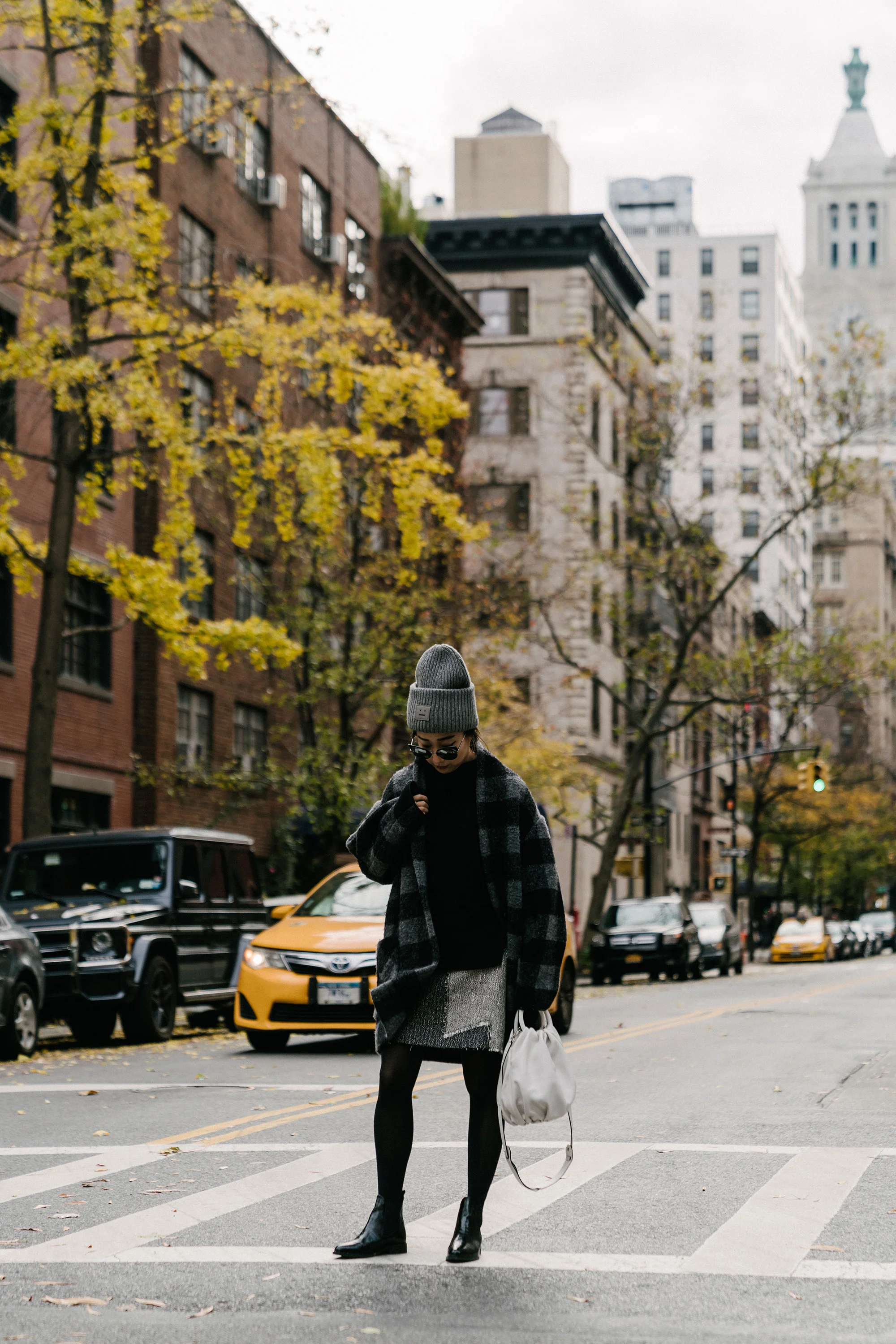 Isabel Marant Jacket, AYR Sweater, Proenza Schouler Skirt, Freda Salvador Boots, Loewe Bag, Fendi Sunglasses, Acne Studios Beanie