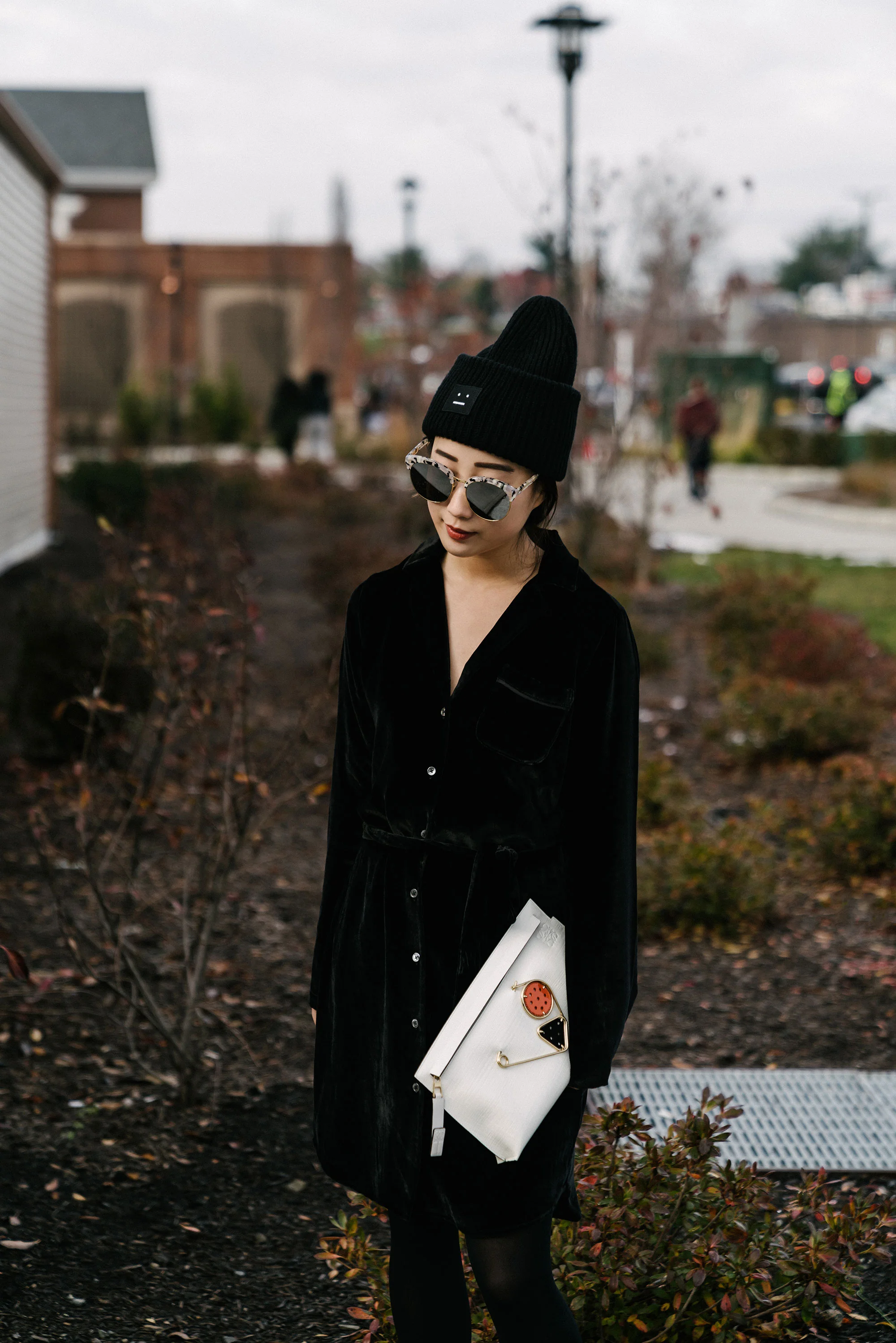 AG Jeans Dress, Loewe Clutch, Gentle Monster Sunglasses, Acne Studios Beanie