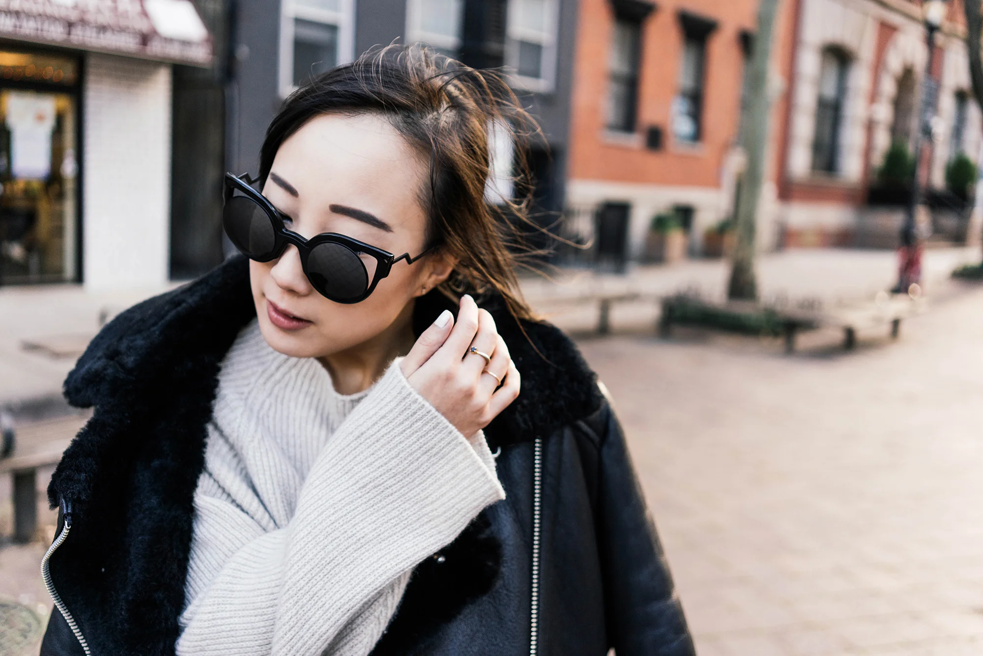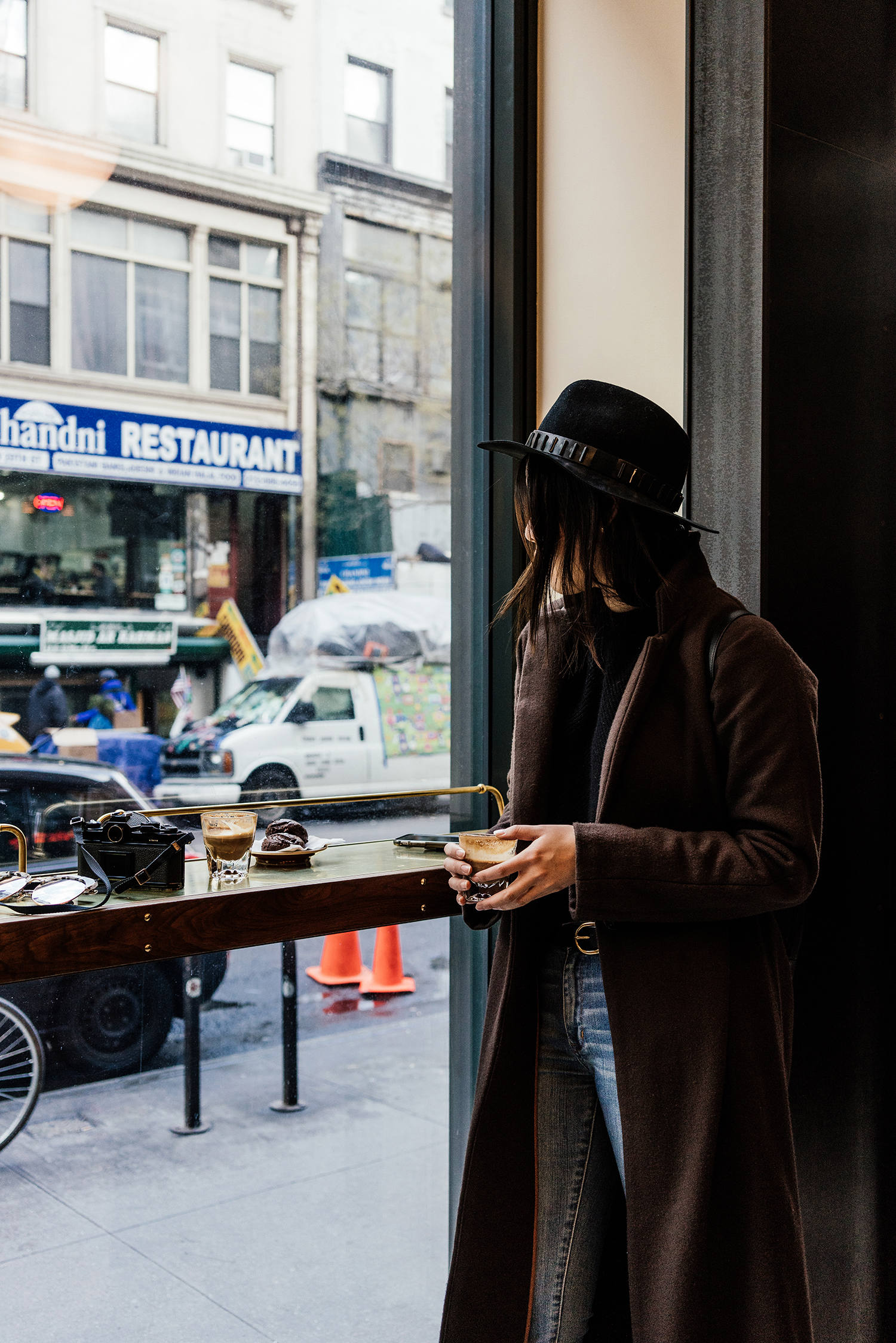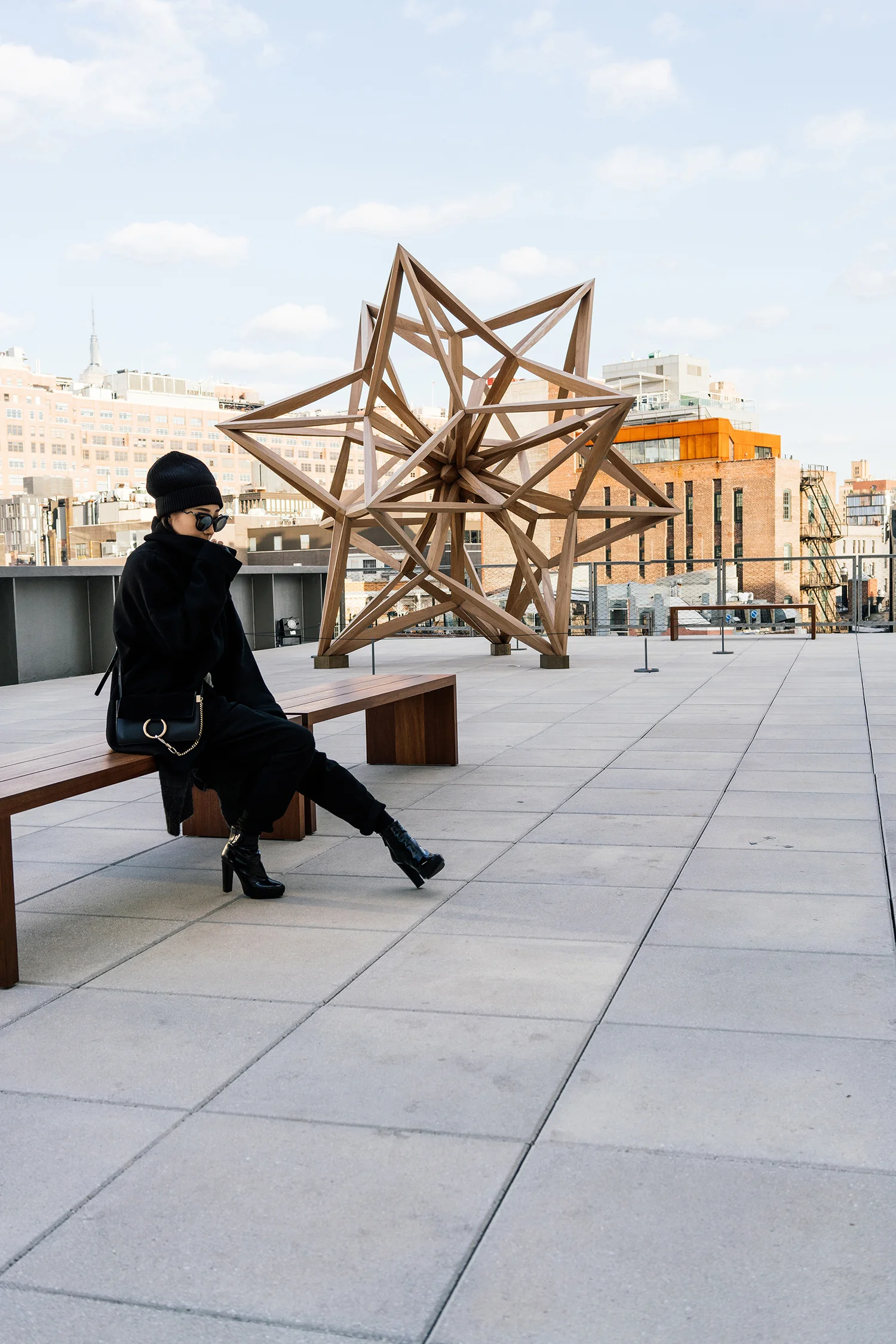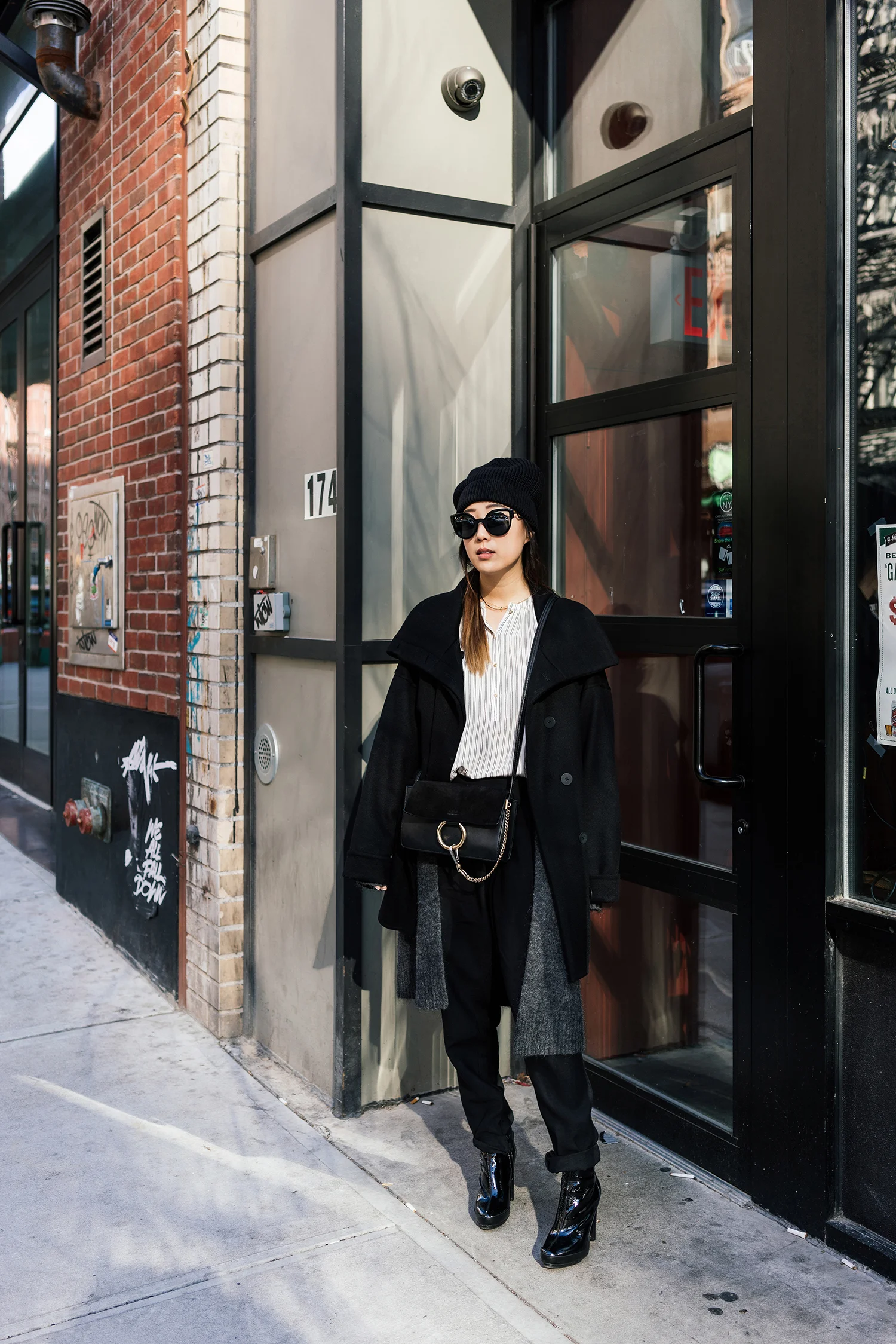 Michelle Waugh Coat, Acne Studios Cardigan, Ulla Johnson Shirt, Finders Keepers Pants, Balenciaga Boots, Chloe Bag, Stella McCartney Beanie, Fendi Sunglasses