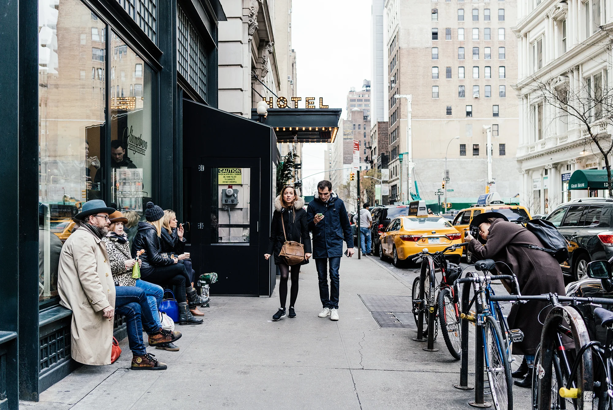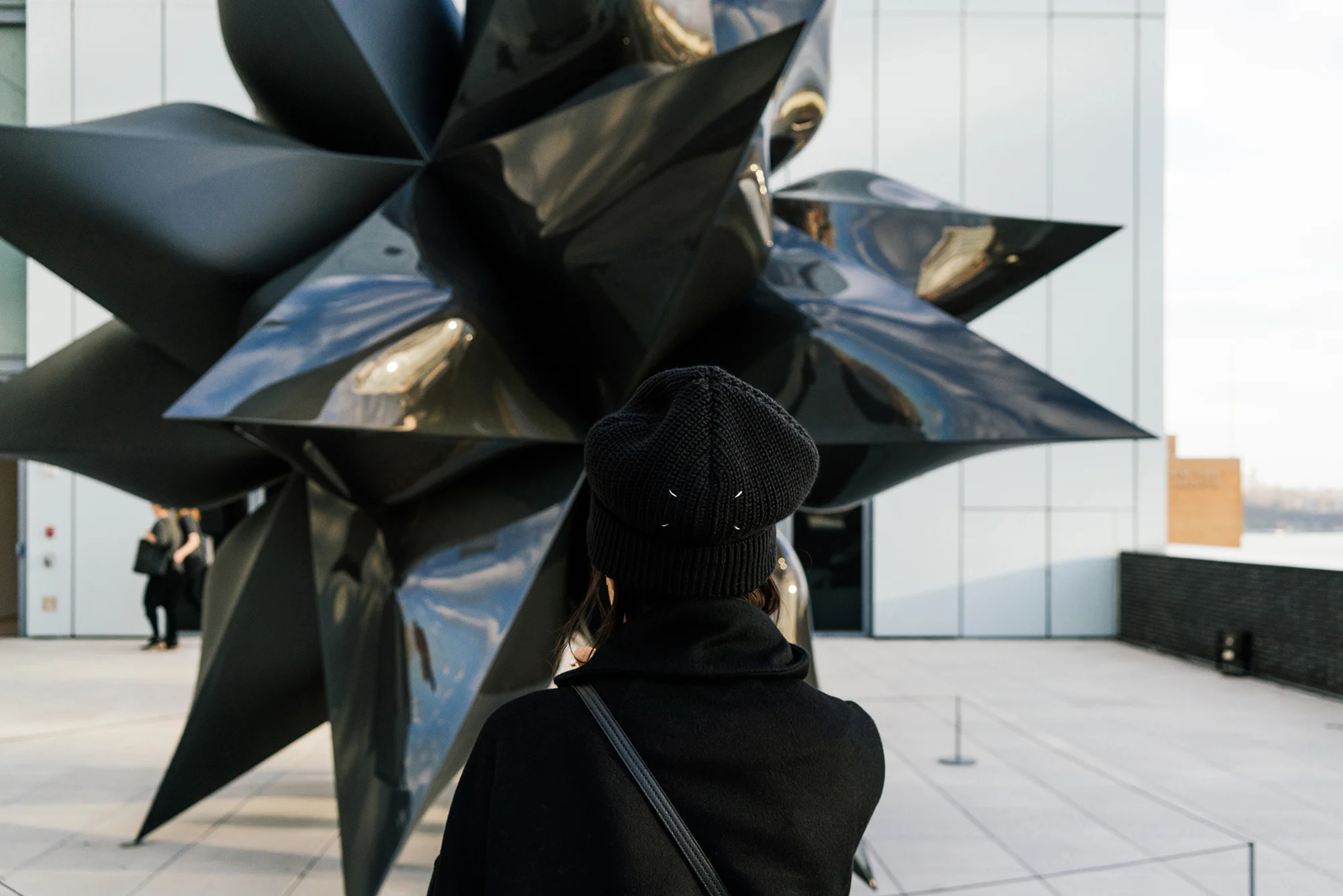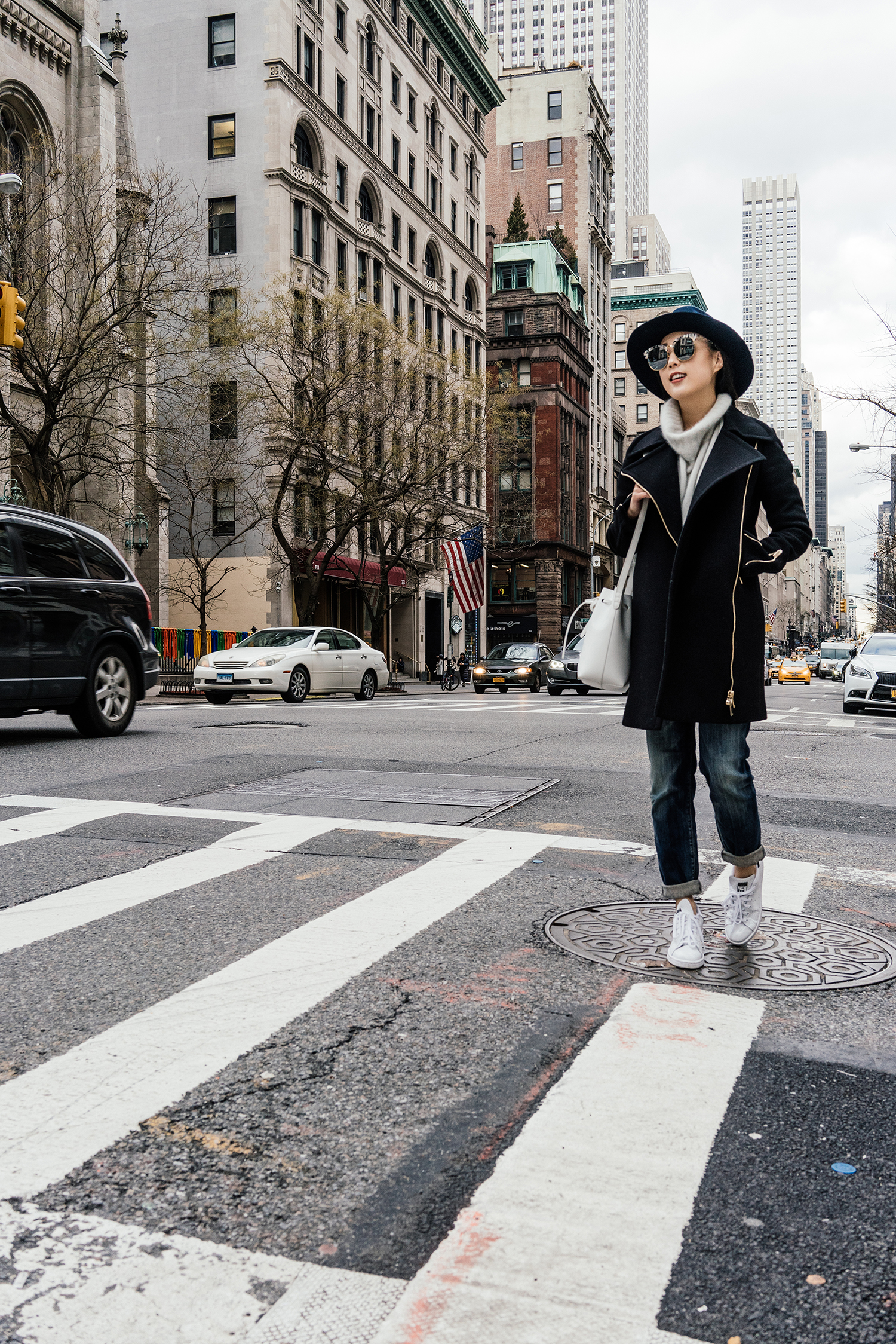 Stella McCartney Coat, Pas de Calais Sweater, R13 Denim, Adidas Sneakers, Janessa Leone Hat, Mansur Gavriel Bag, Gentle Monster Sunglasses