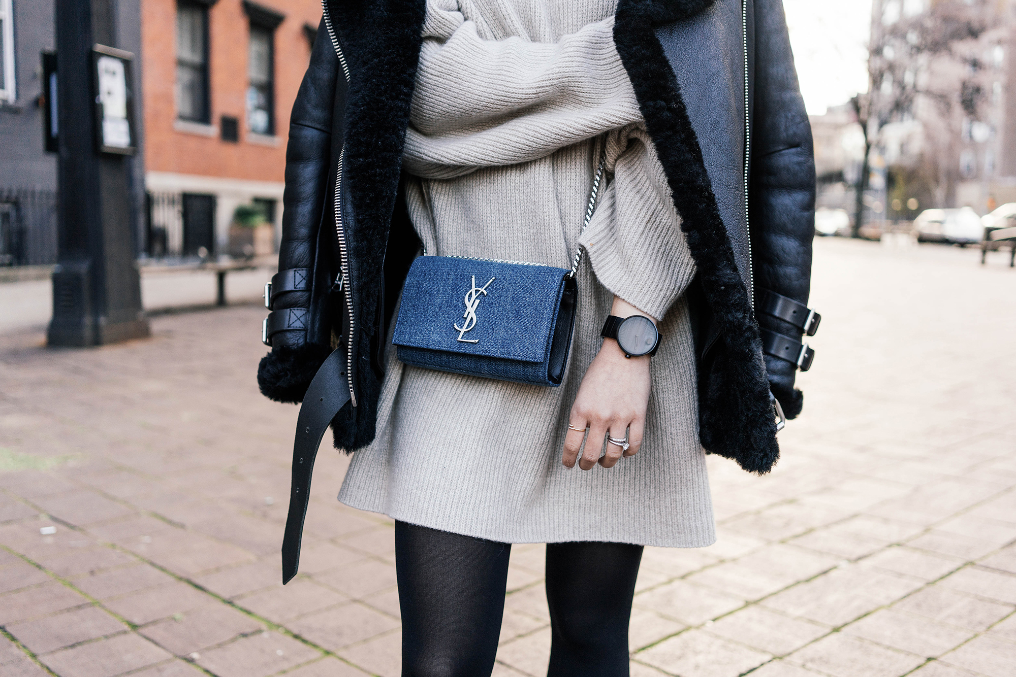 Acne Studios Coat, The Row Sweater, Saint Laurent Bag, Fendi Sunglasses, Adidas Sneakers, Movado Watch, Euna Joyce Jewelry, AVEC New York Jewelry