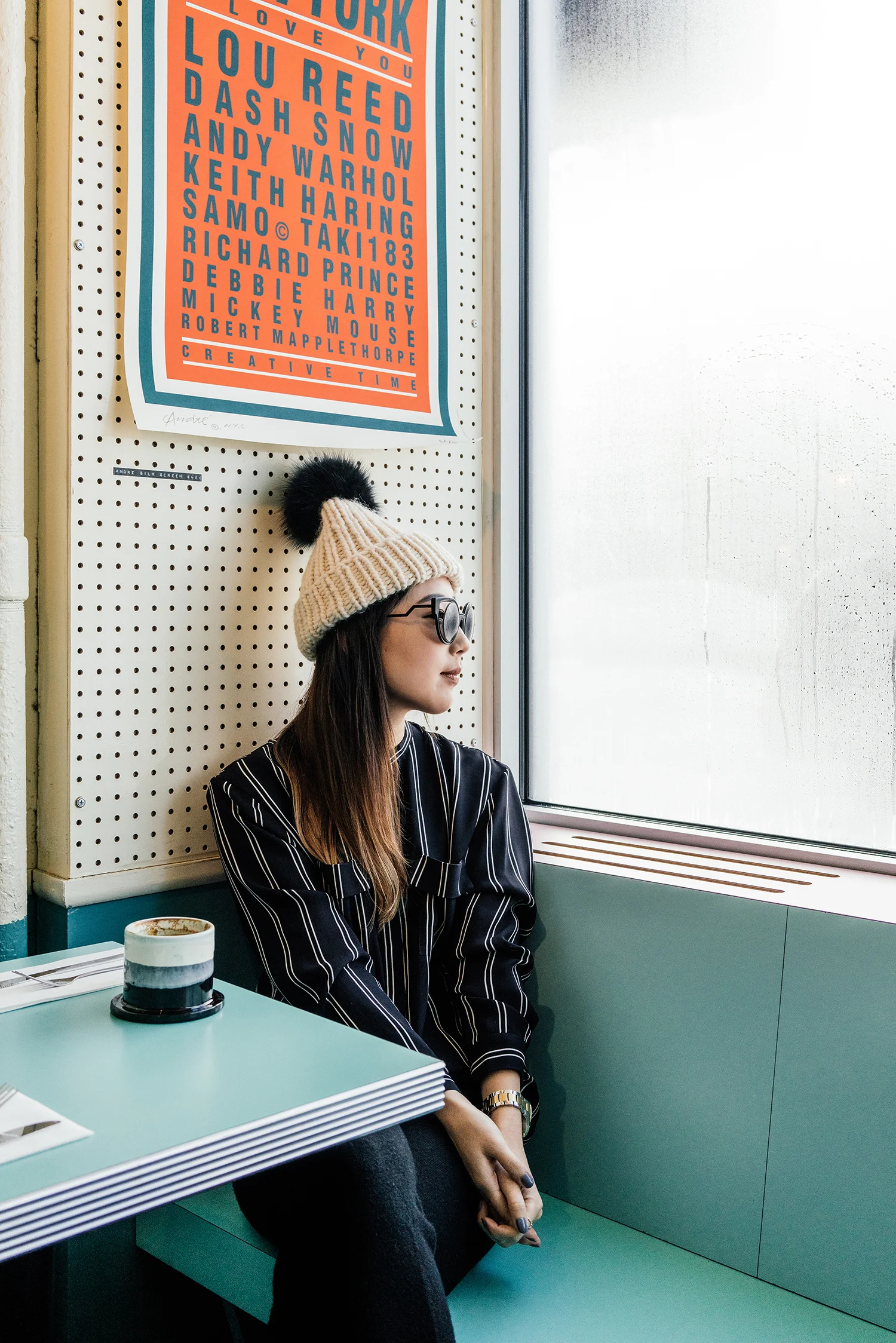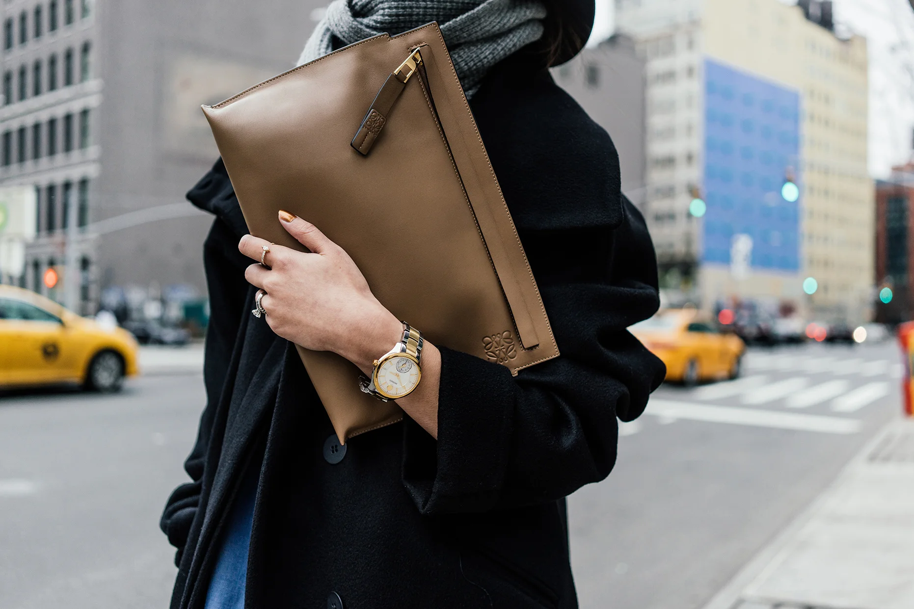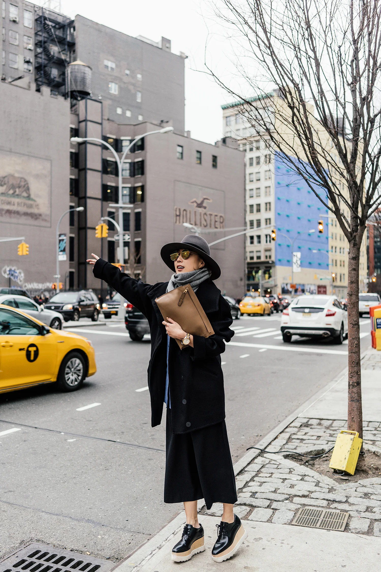 Movado Watch, Michelle Waugh Coat, C/meo Collective Top, COS Pants, Stella McCartney Shoes, Loewe Clutch, Saint Laurent Hat, Candy & Caviar Scarf, Gentle Monster Sunglasses