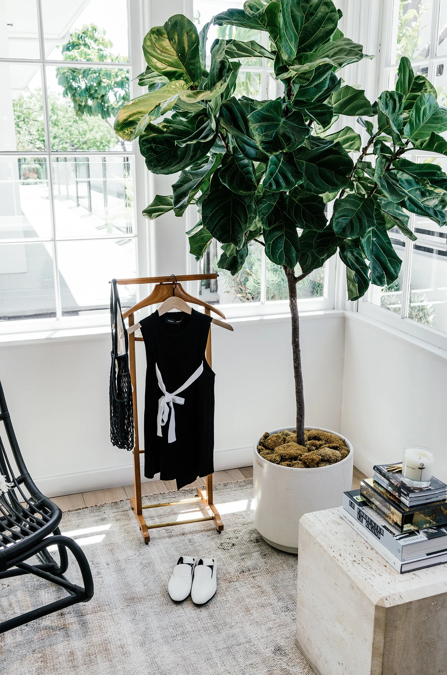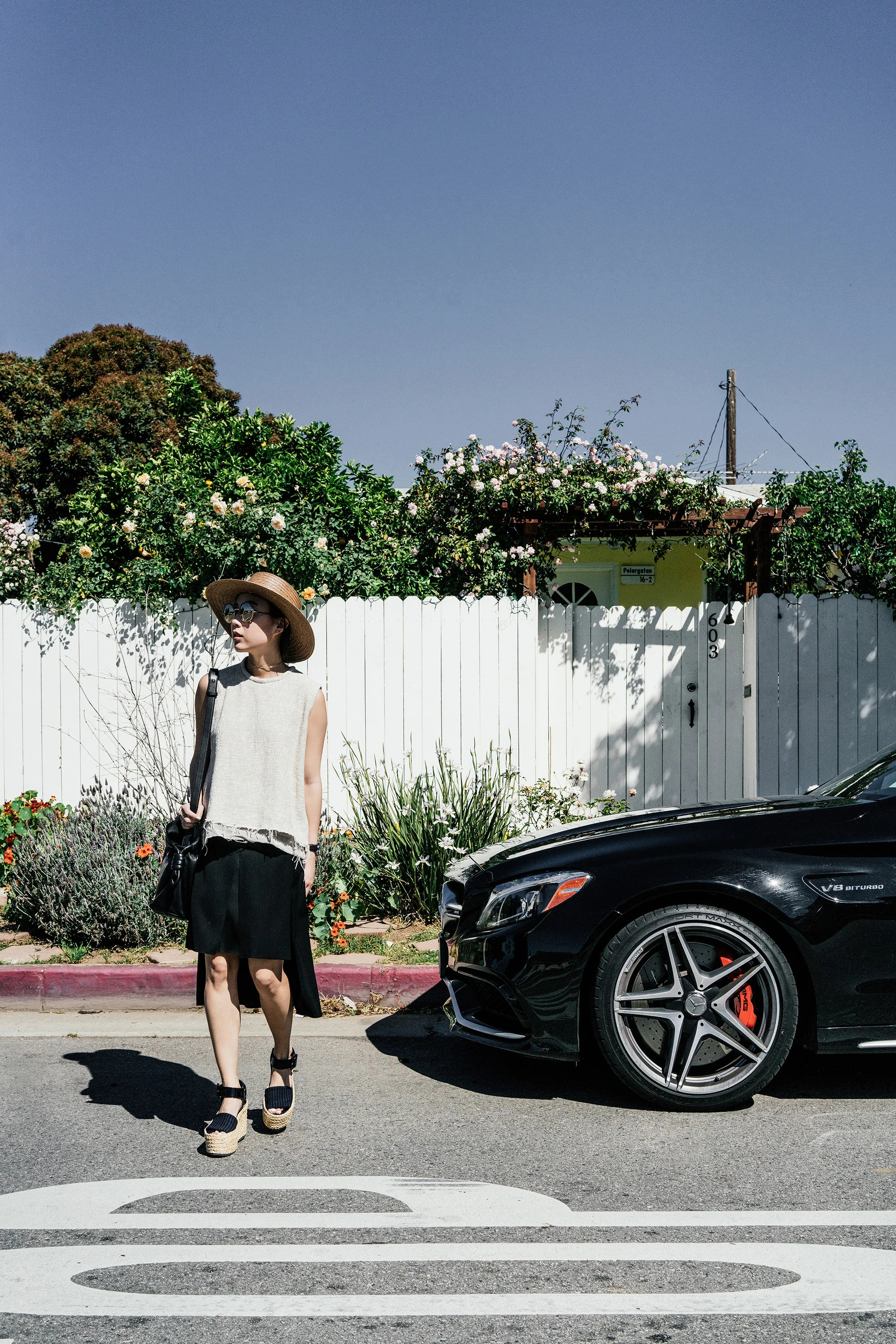 Simon Miller Top, COS Skirt, Céline Sandals, Loewe Bag, Janessa Leone Hat, Cutler and Gross Sunglasses, Larsson & Jennings Watch