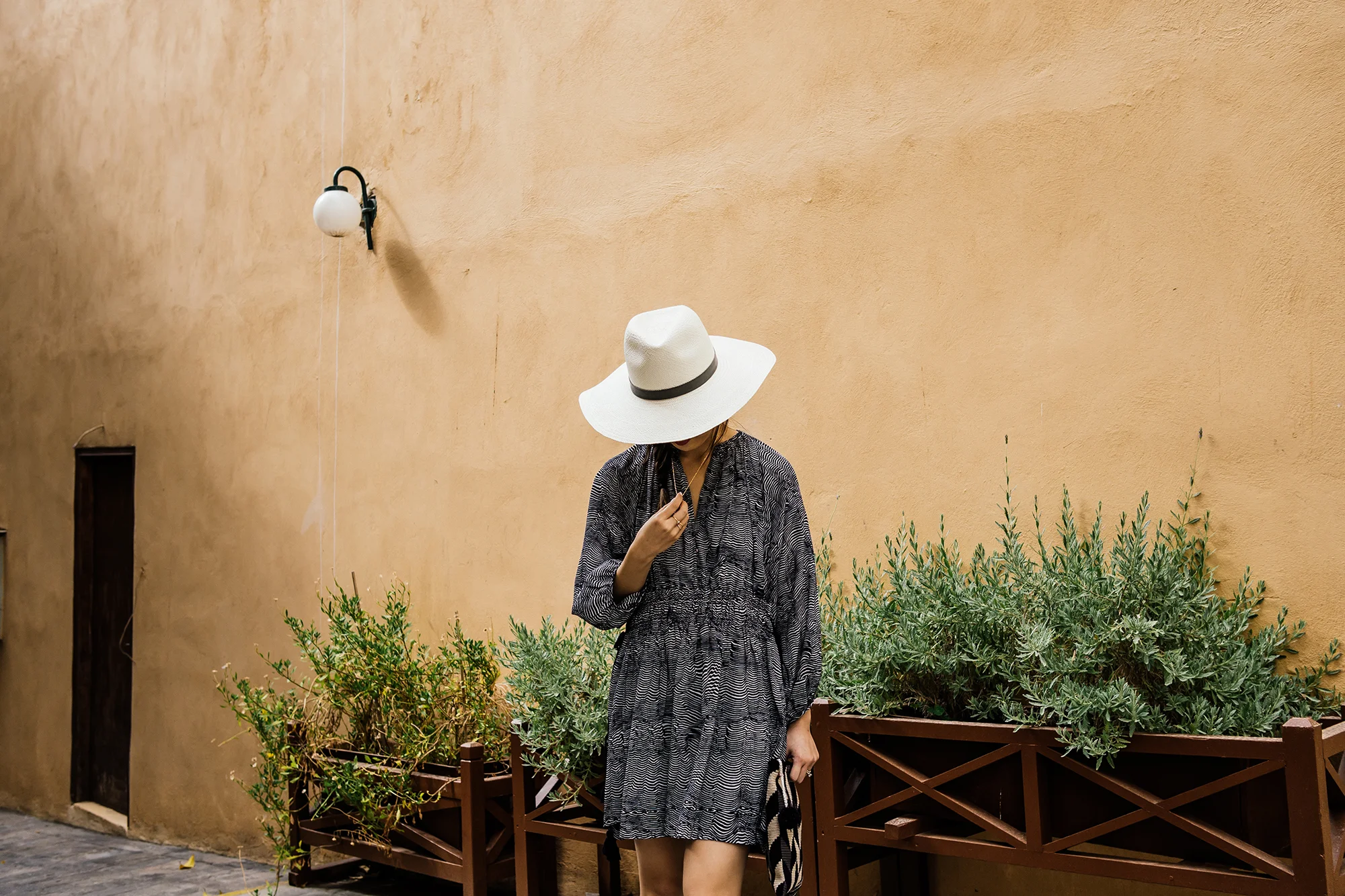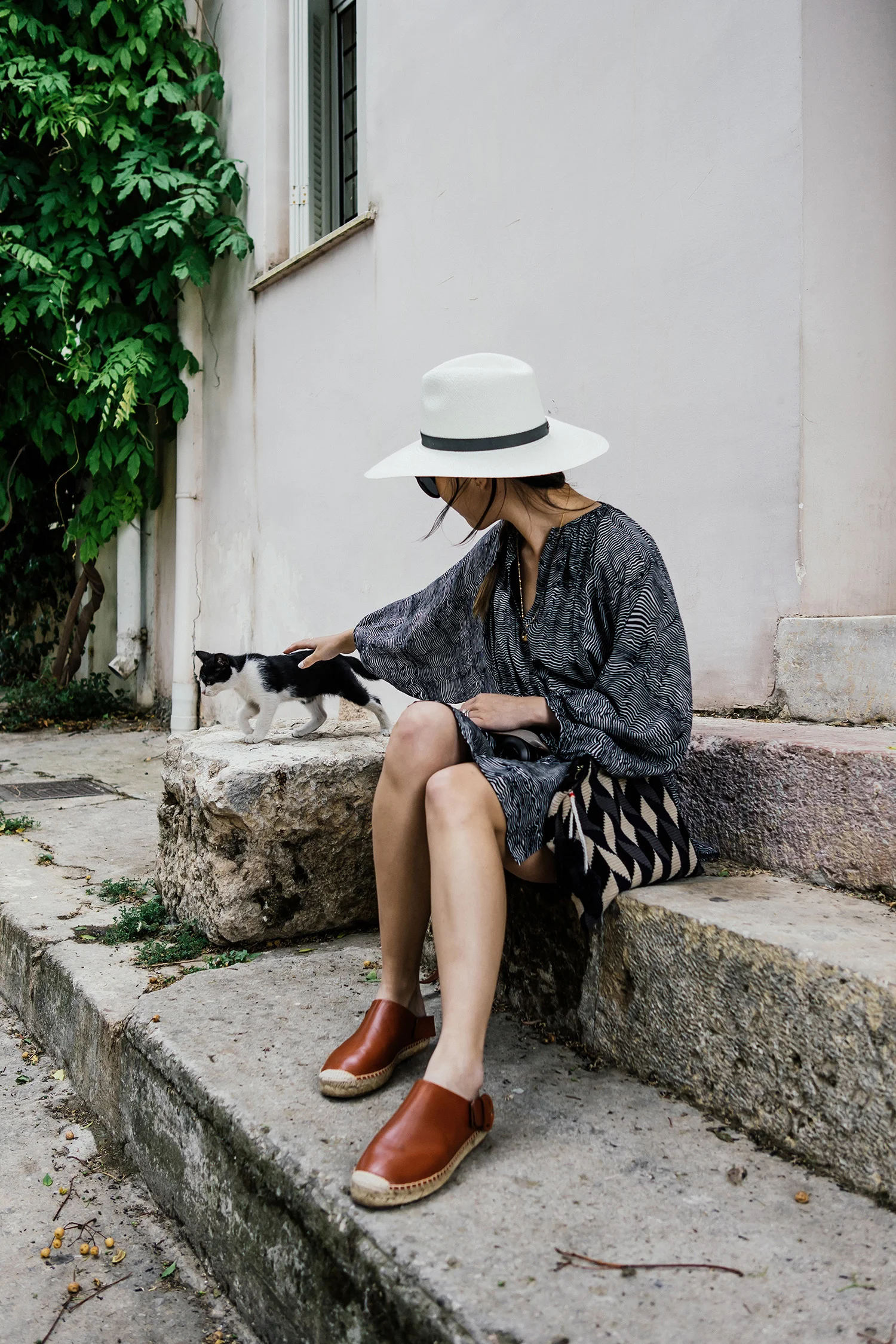 Apiece Apart Dress, Céline Sandals, Sophie Anderson Bag, Janessa Leone Hat, Fendi Sunglasses, Cartier Necklace