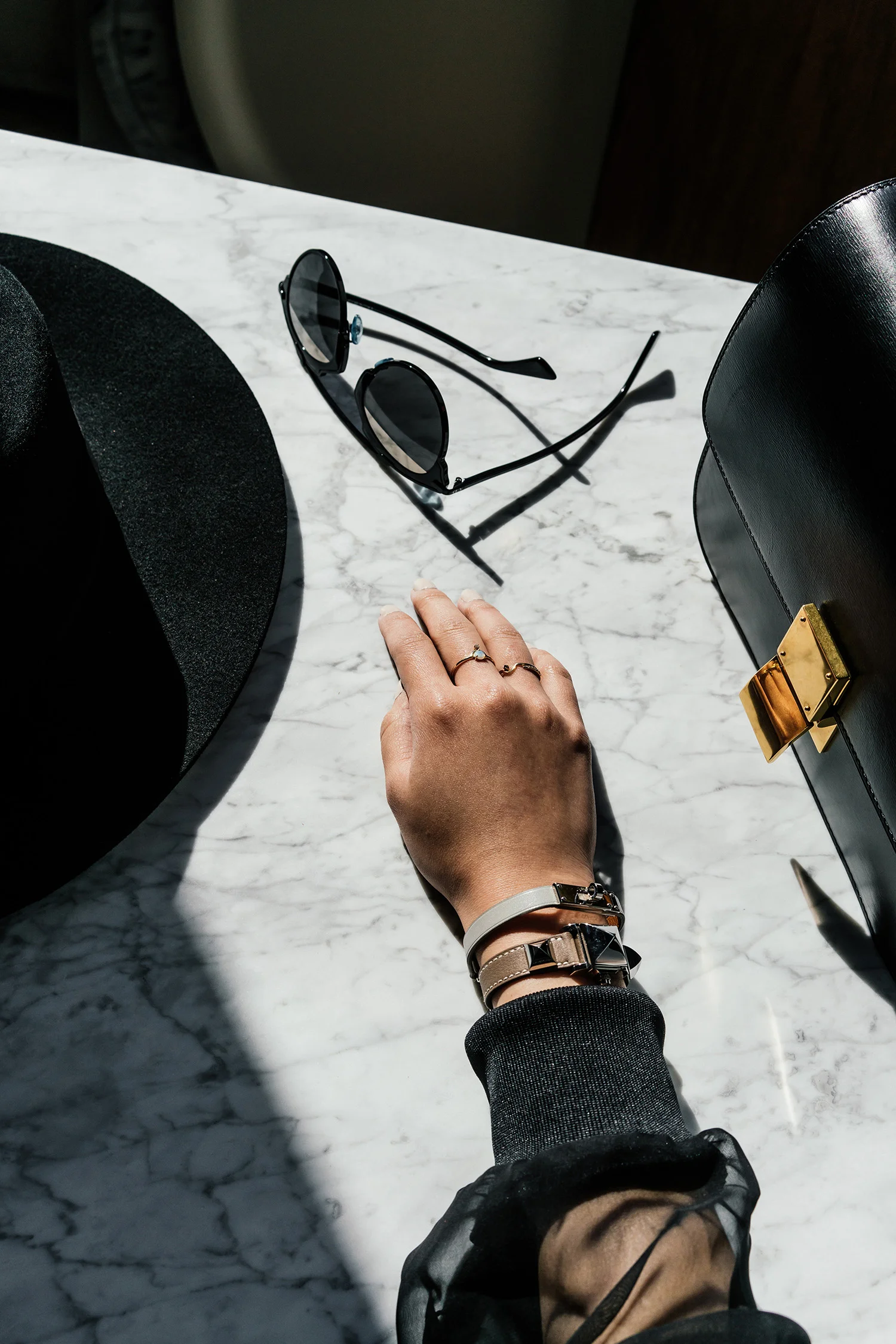 Janessa Leone Hat, Dior Sunglasses, Céline Bag, Hermes Bracelet and Watch, Wwake Rings