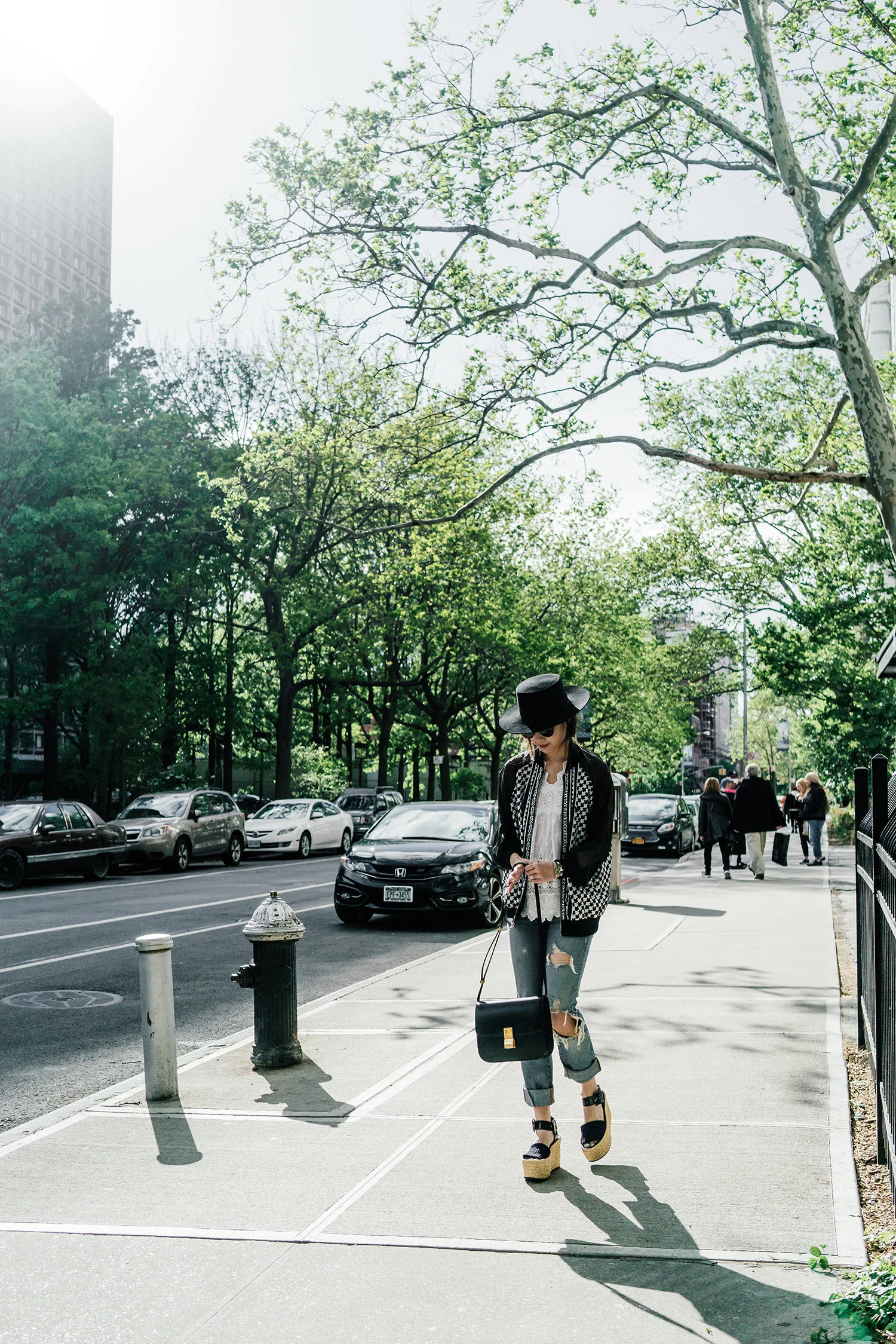 Adidas Originals Jacket, Ulla Johnson Top, Denim & Supply RL Denim, Céline Shoes, Céline Bag, Fendi Sunglasses, Janessa Leone Hat