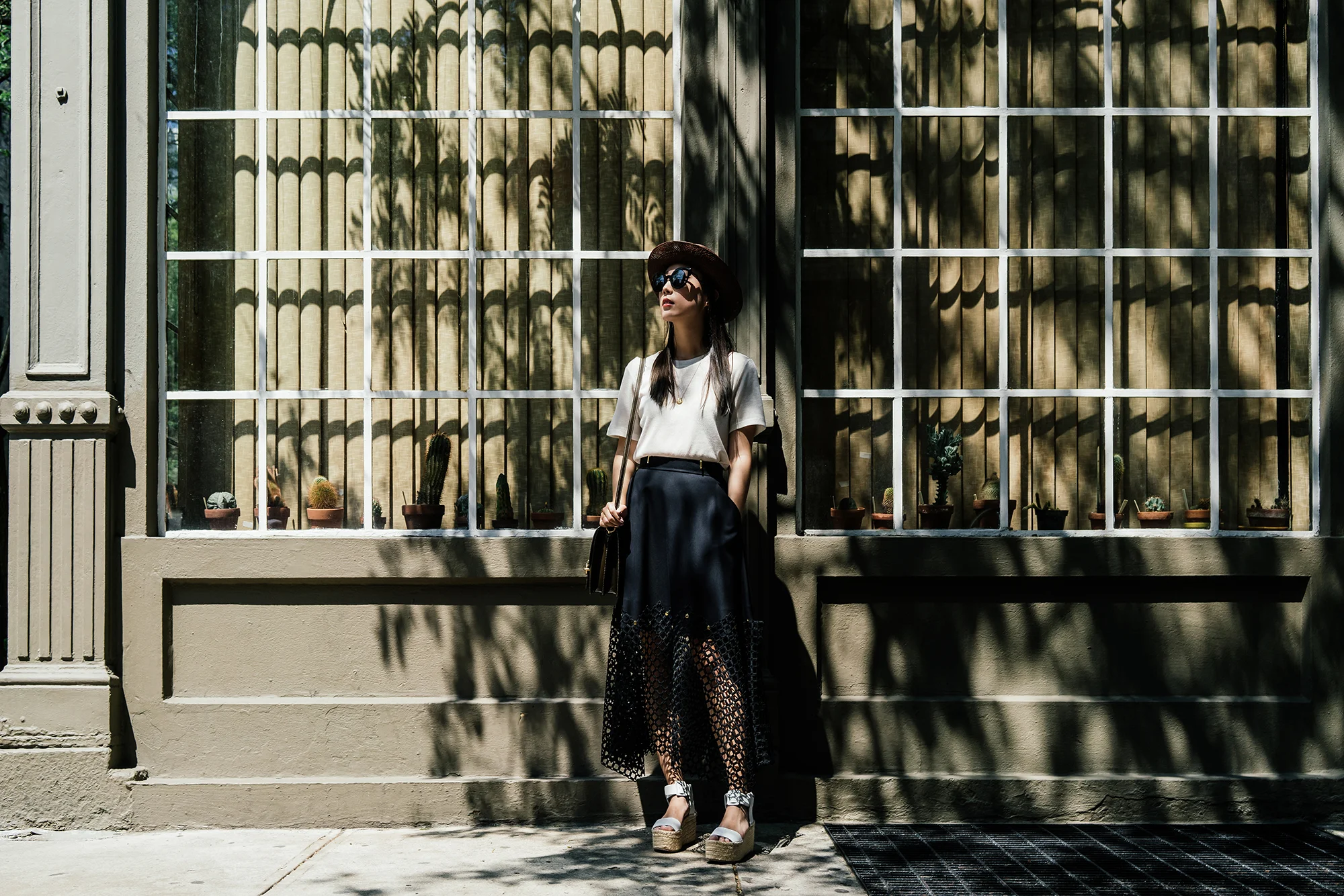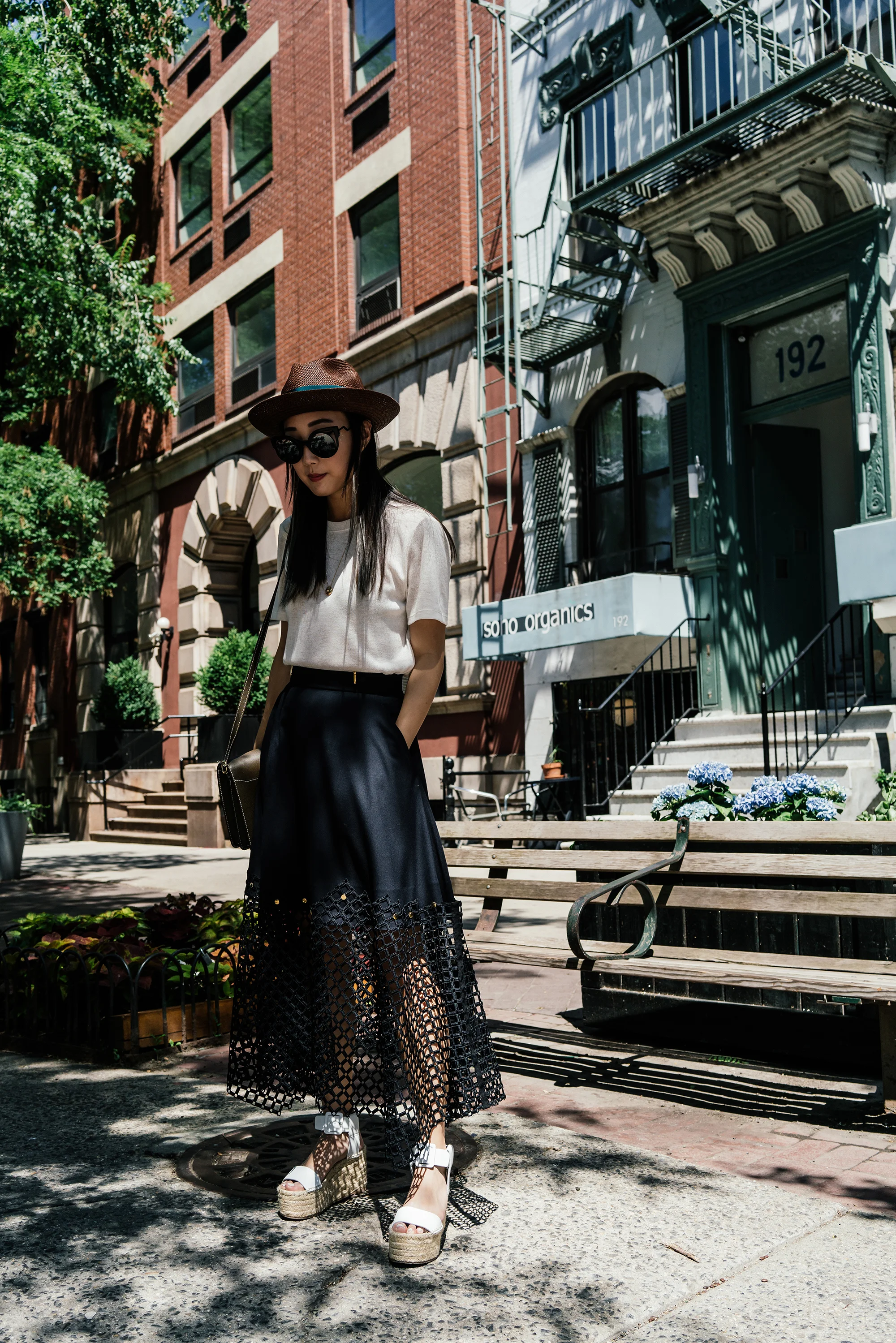 Lou and Grey Top, Kolor Skirt, Vince Sandals, Hermes Bag, Lanvin Hat, Fendi Sunglasses