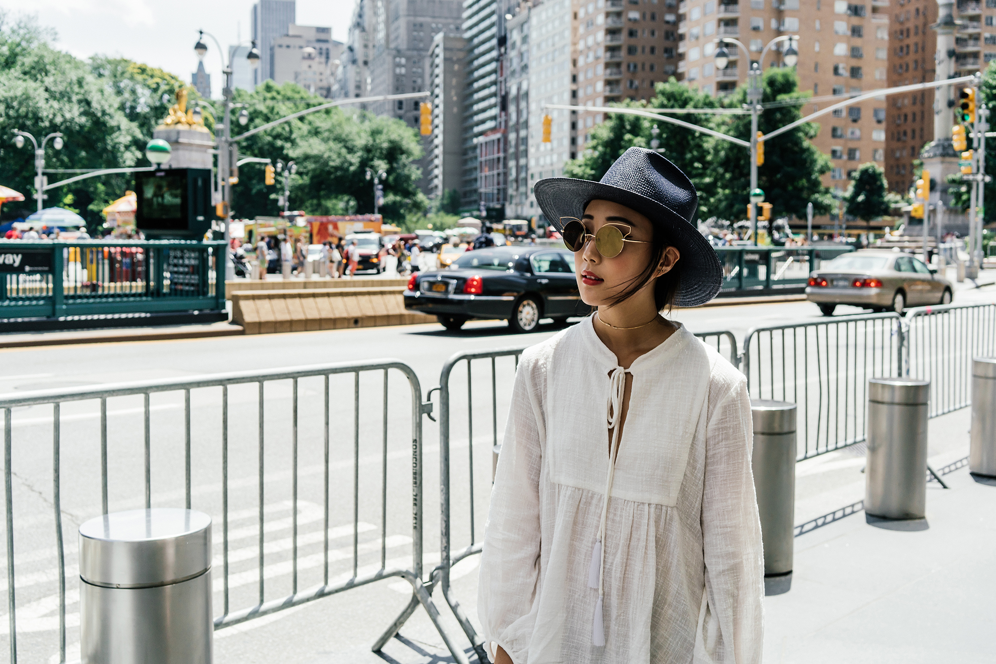 Natalie Martin Dress, Céline Shoes, Mark Cross Bag, Dita Sunglasses, Janessa Leone Hat, Jennie Kwon Choker