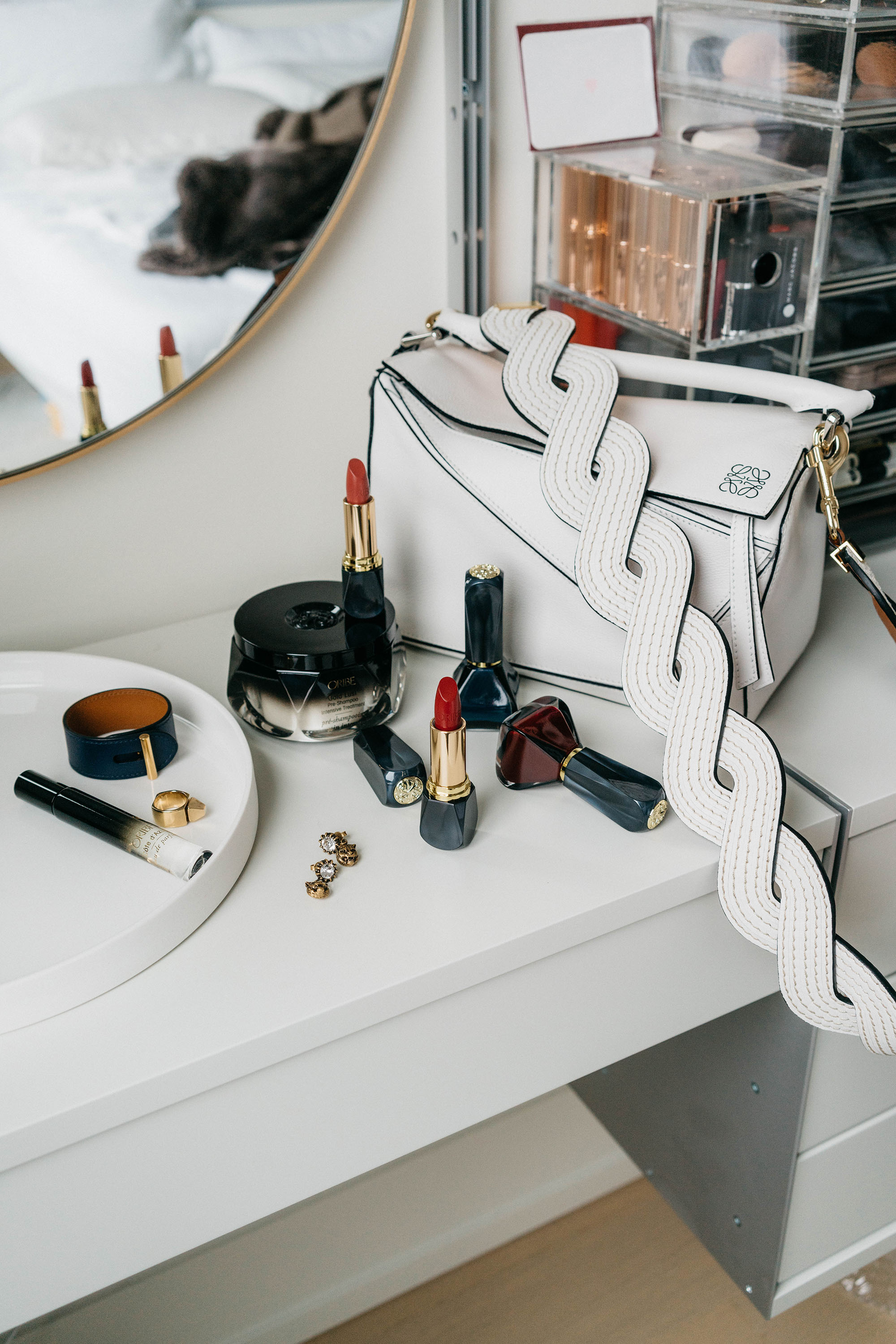 Hermes Bracelet, Saint Laurent Ring, Gucci Earrings, Oribe Beauty, Loewe Bag