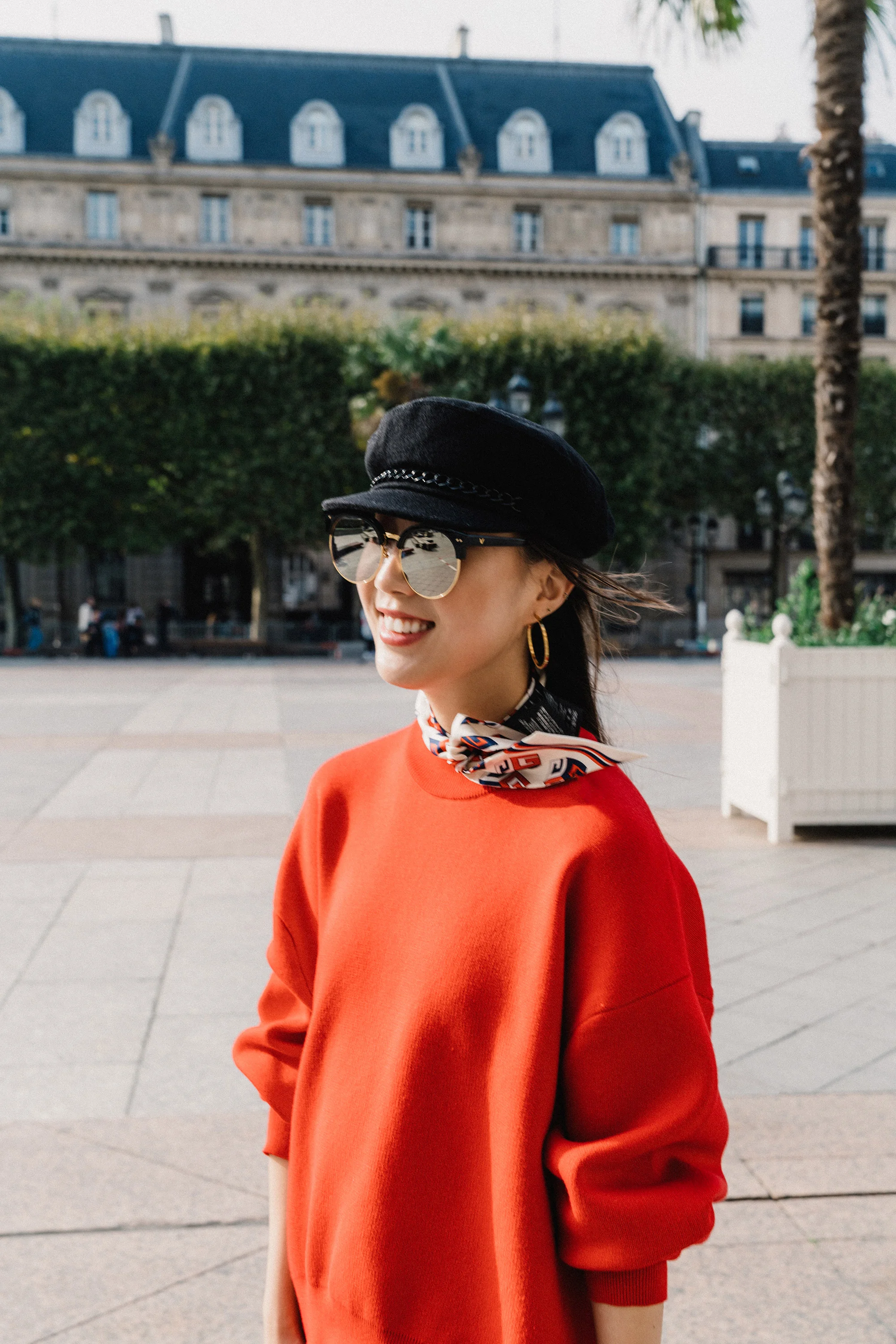 DKNY Pullover, Gucci Scarf, Eugenia Kim Hat, Gentle Monster Sunnies, Vita Fede Earrings