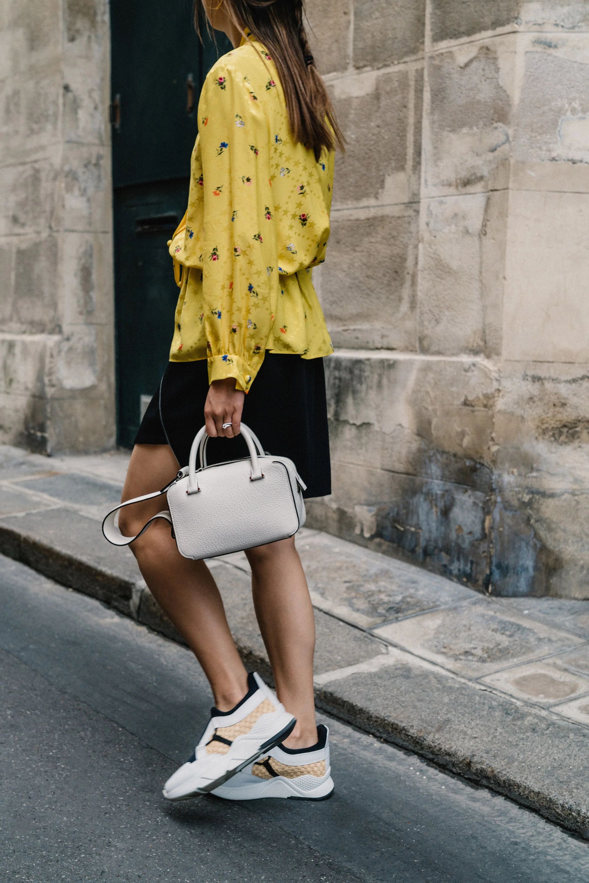 Balenciaga Top, Saint Laurent Skirt, Robert Clergerie Sneakers, Carolina Santo Domingo Bag, Hermes Hat, Gucci Sunglasses