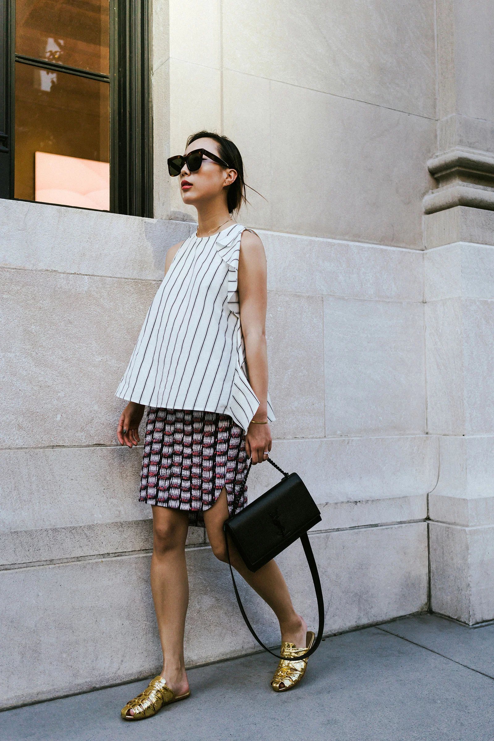 Yune Ho Top, COS Skirt, The Row Shoes, Saint Laurent Bag, Céline Sunglasses
