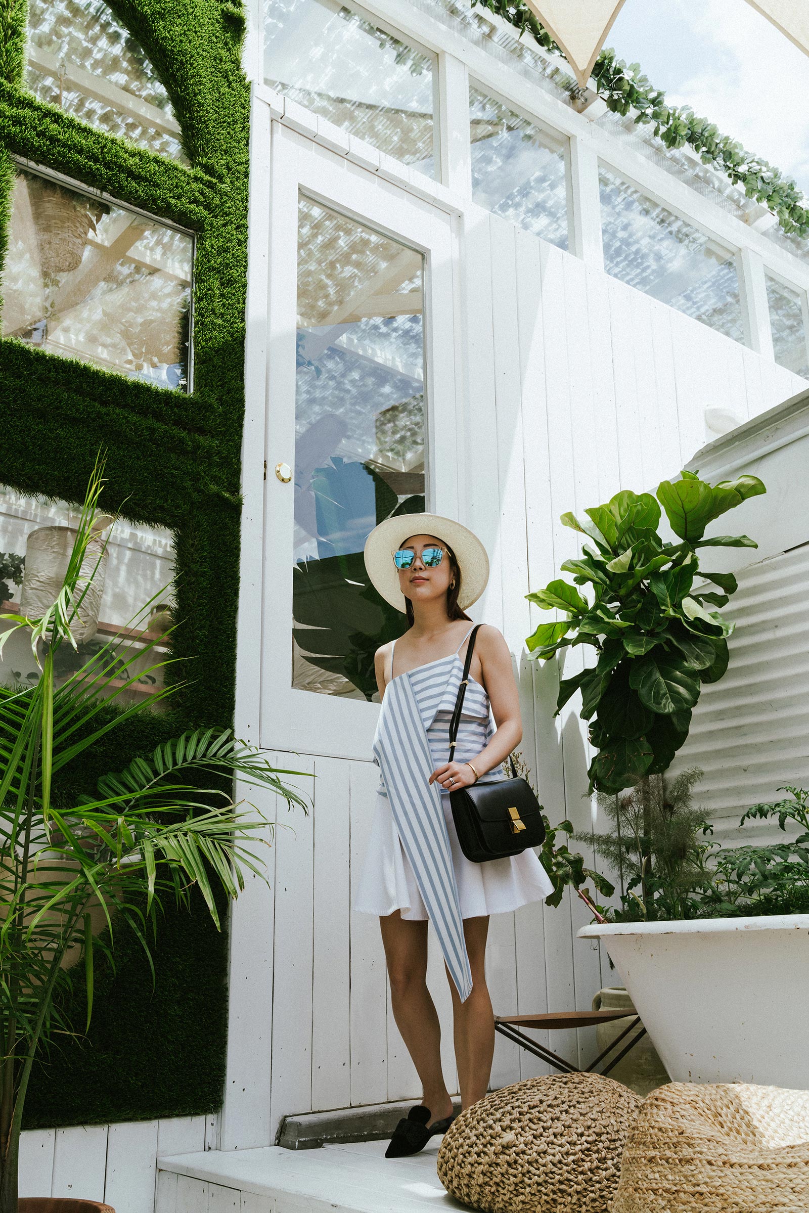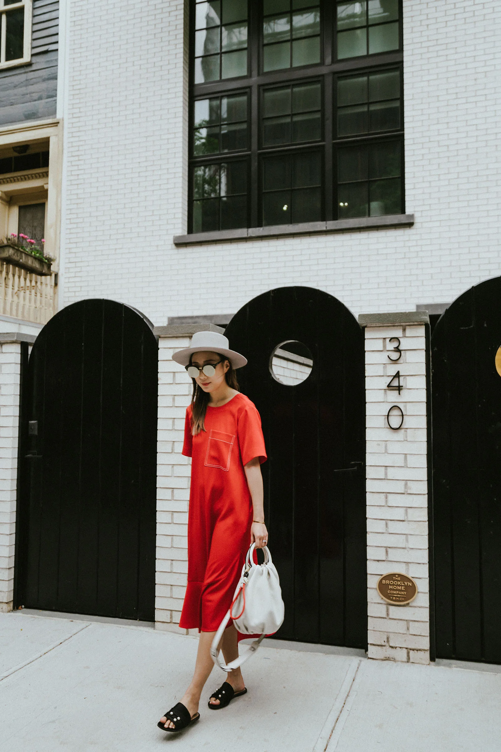 Yune Ho Dress, Dear Frances Slides, Loewe Bag, Janessa Leone Hat