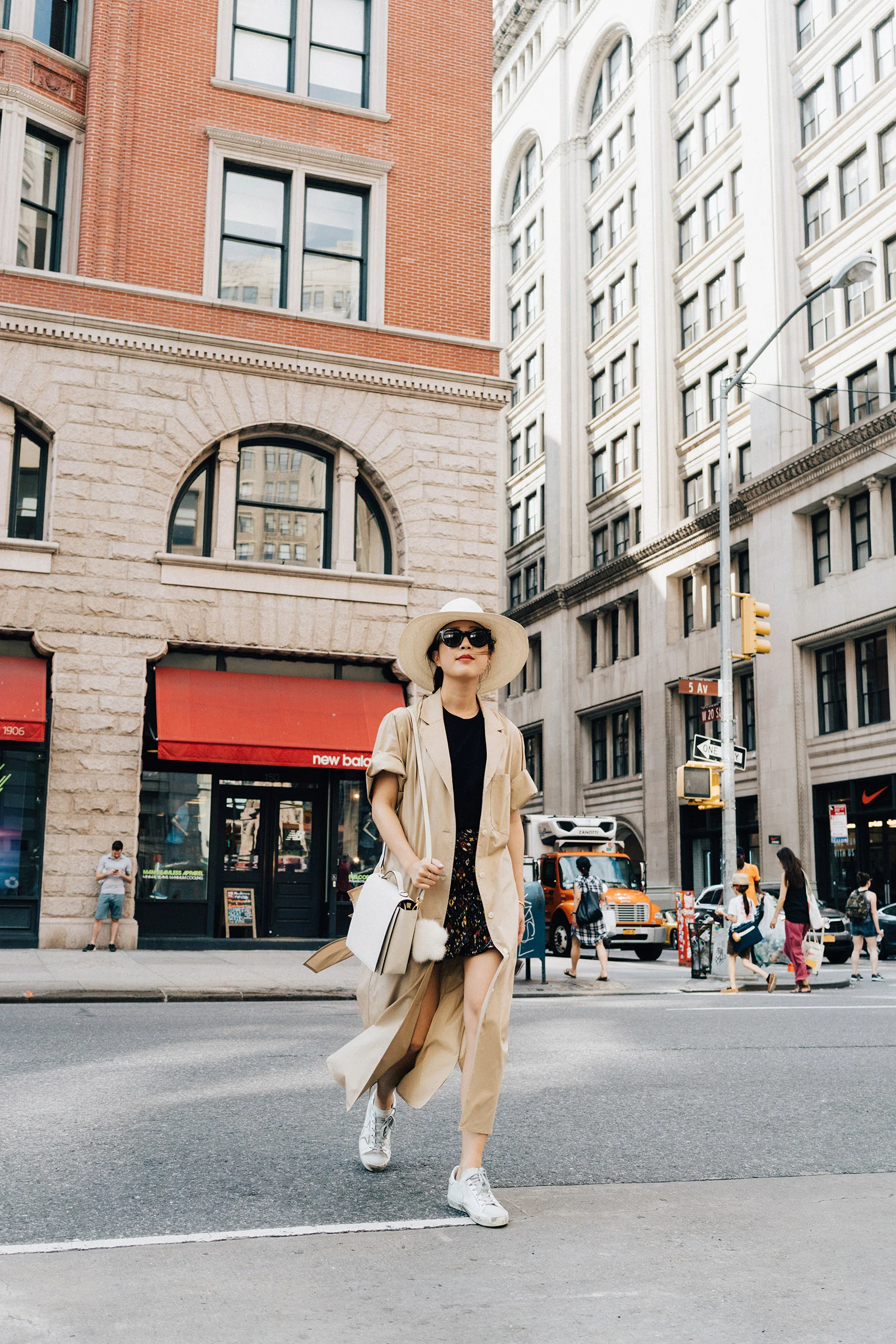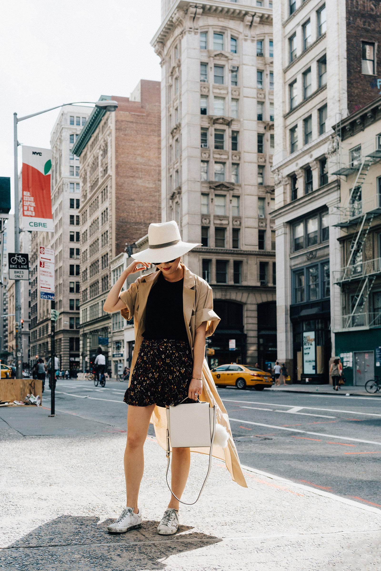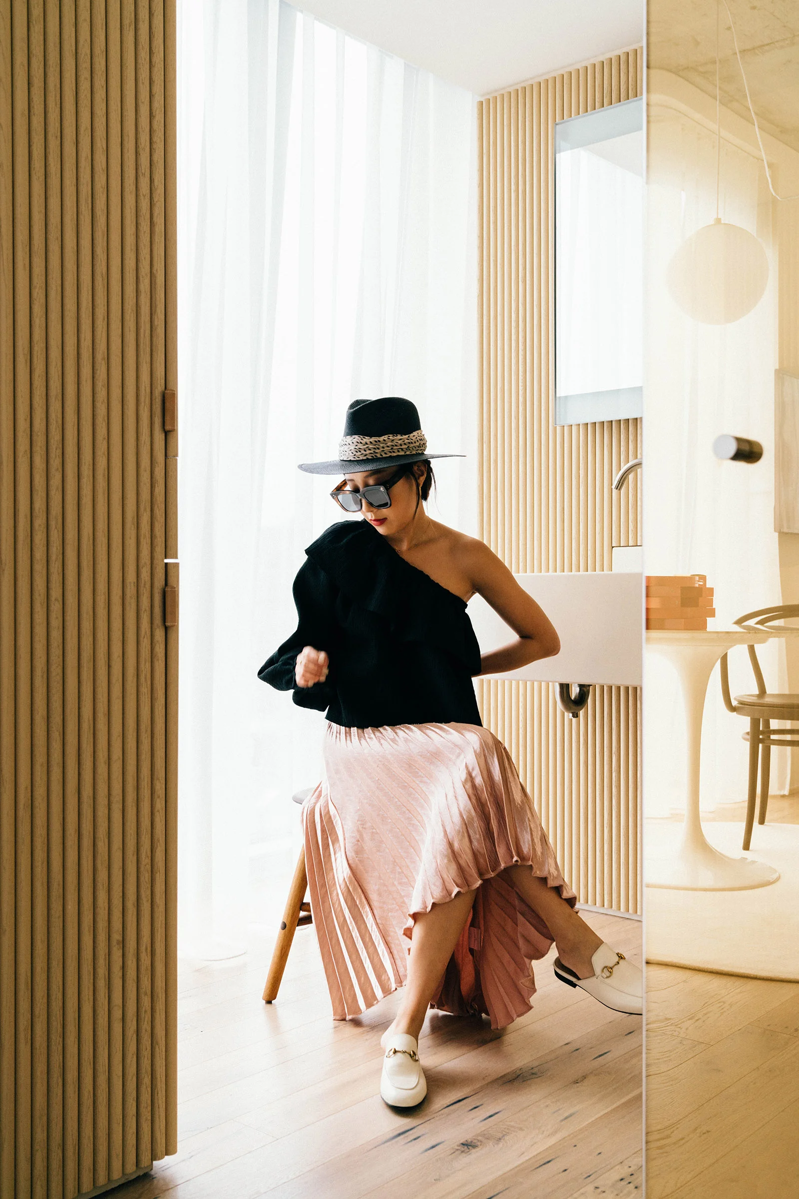Claudia Li Top, COS Skirt, Prada Slides, Céline Bag, Janessa Leone Hat