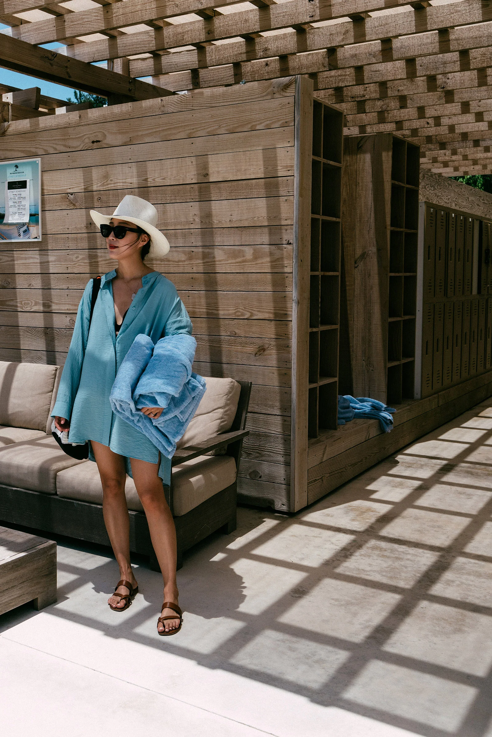 COS Top, Proenza Schouler Swimsuit, Manolo Blahnik Sandals, Sophie Anderson Bag, Janessa Leone Hat, Céline Sunglasses