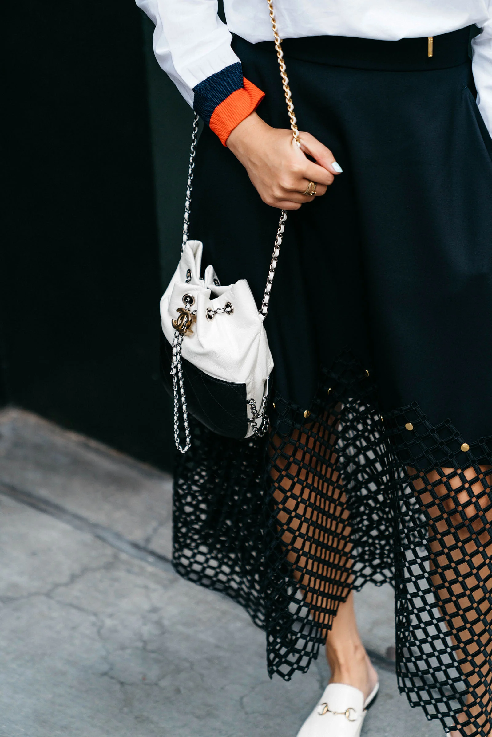 Kule Stripes Top, Kolor Skirt, Gucci Shoes, Chanel Bag, Hirotaka Earrings