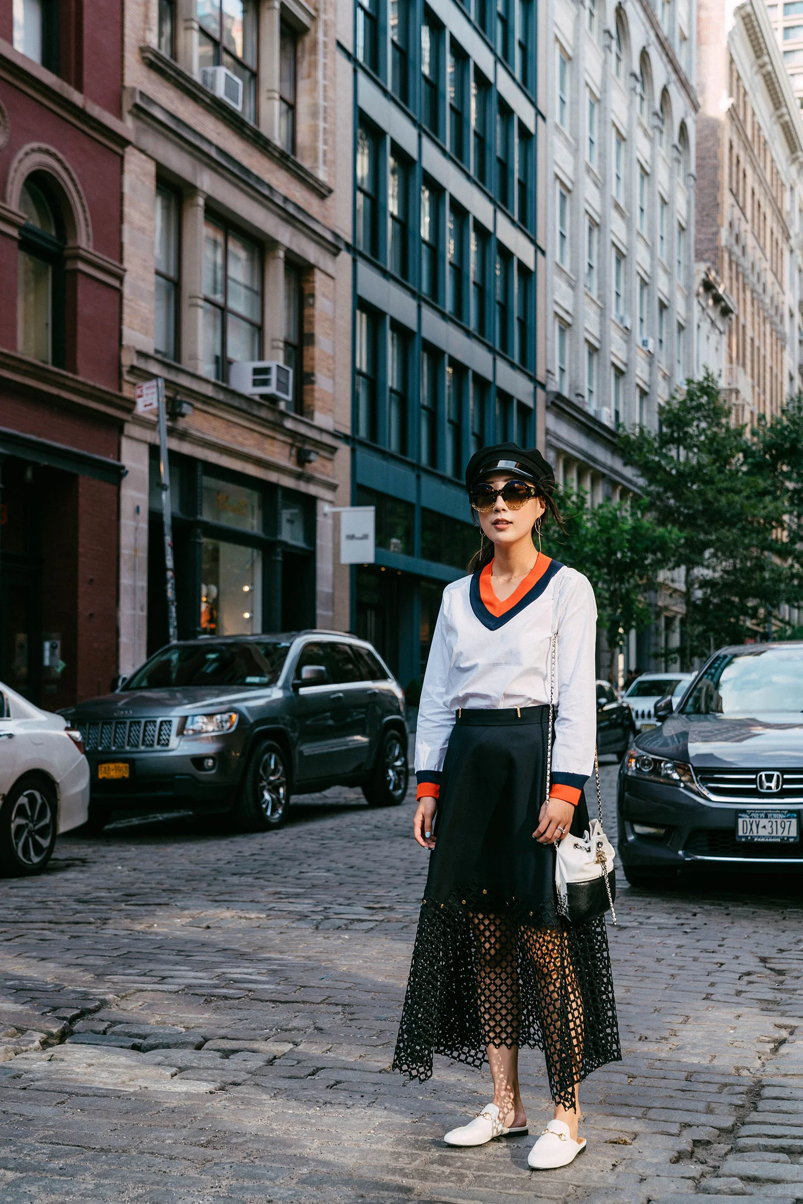 COS Top, J.W. Anderson Skirt, Seven All Around Sandals, Trademark Bag, Gucci Hat