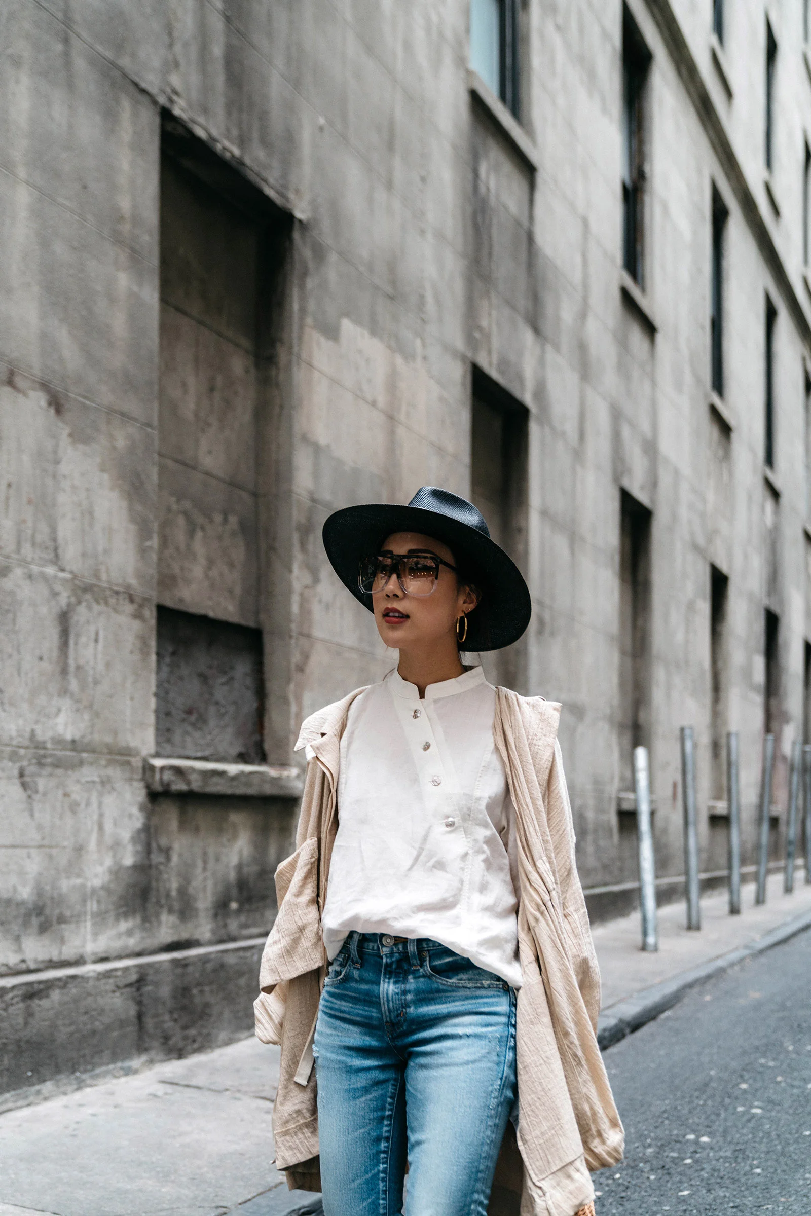 Loewe Jacket, Akro Top, Moussy Denim, Janessa Leone Hat, Vita Fede Earrings