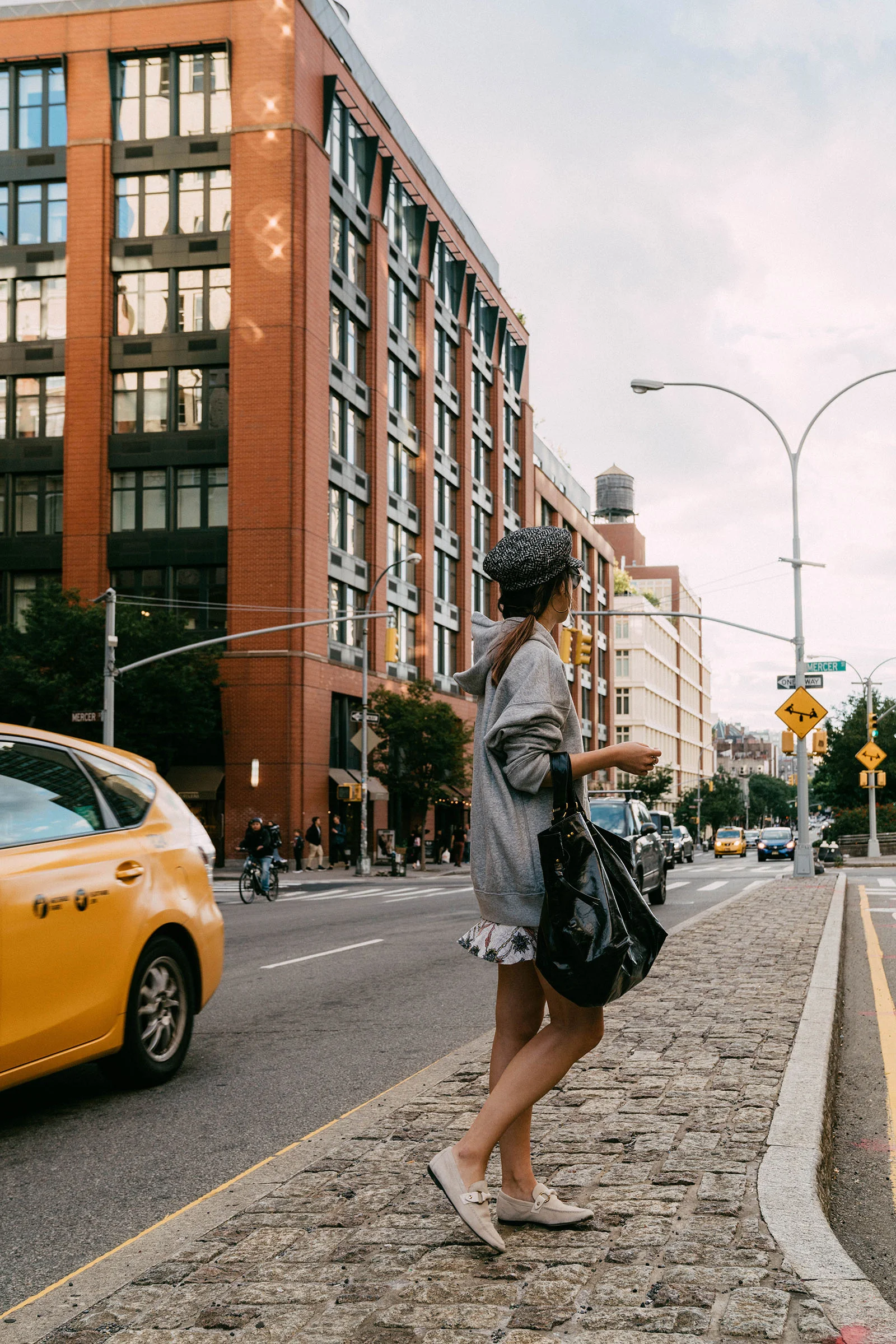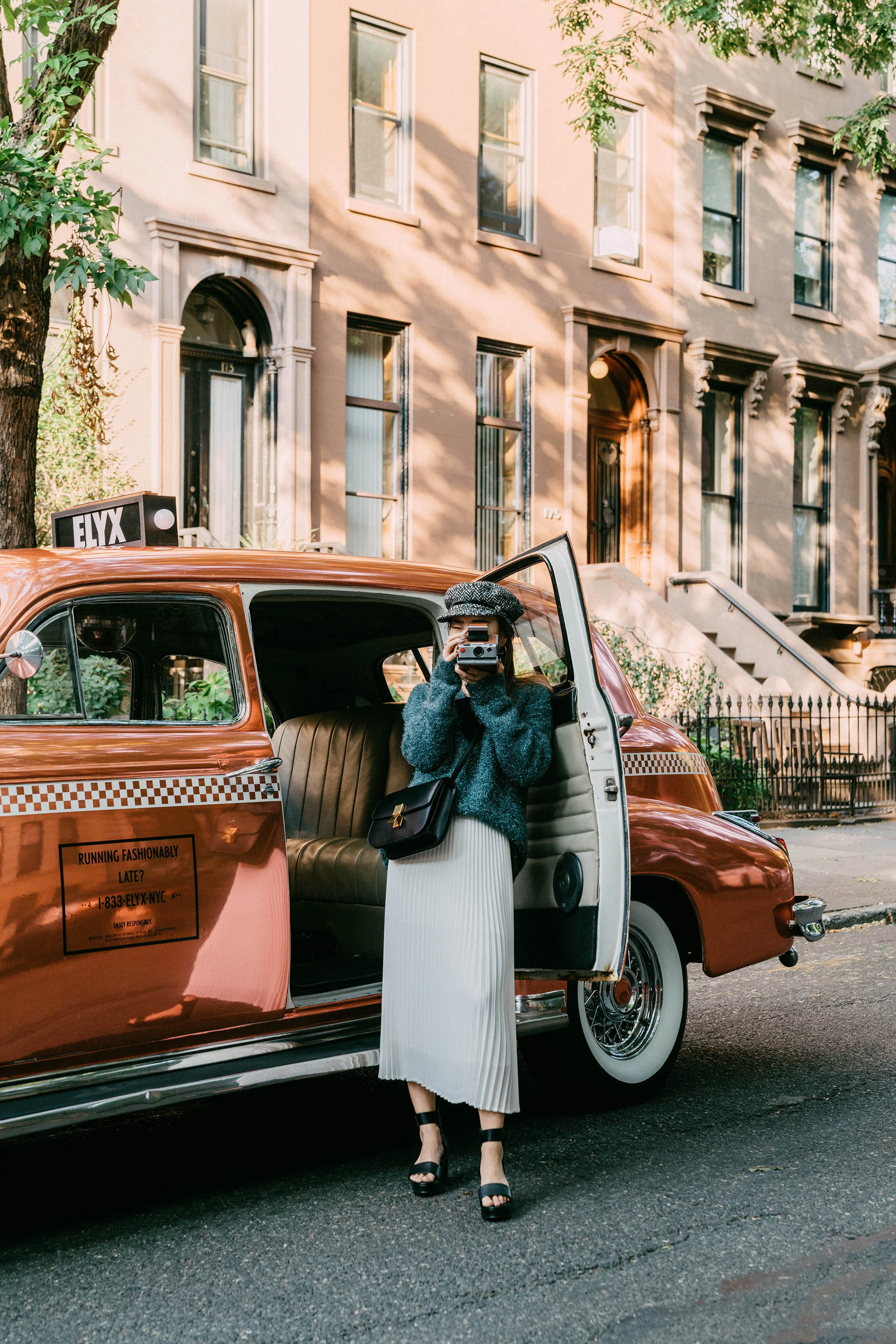 Sies Marjan Sweater (Similar), Aritzia Skirt, Seven All Around Sandals, Eugenia Kim Hat, Céline Bag