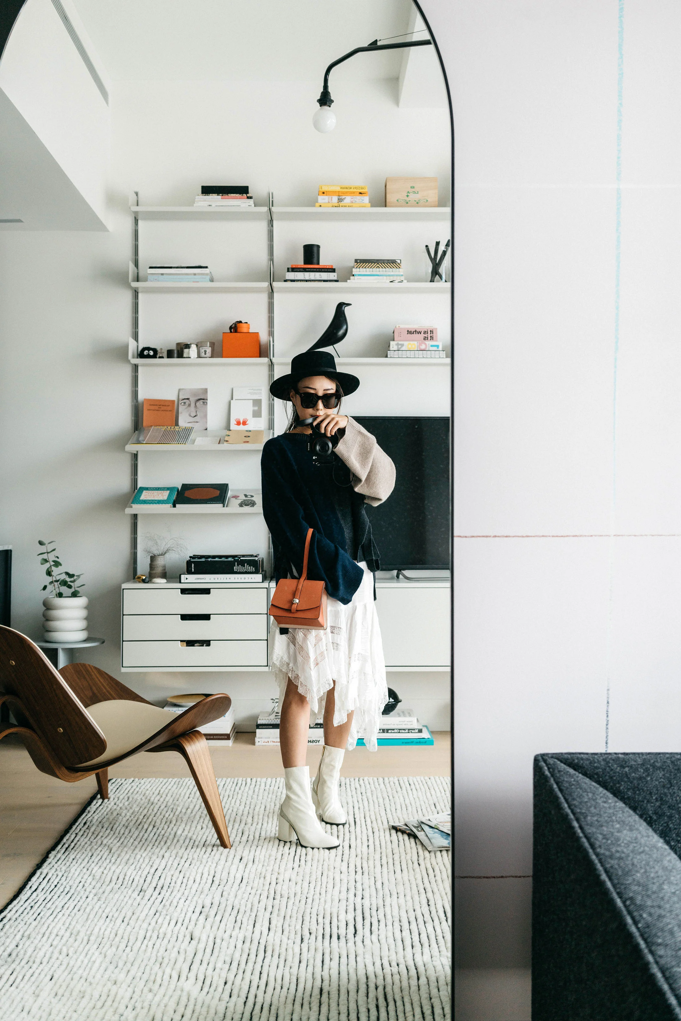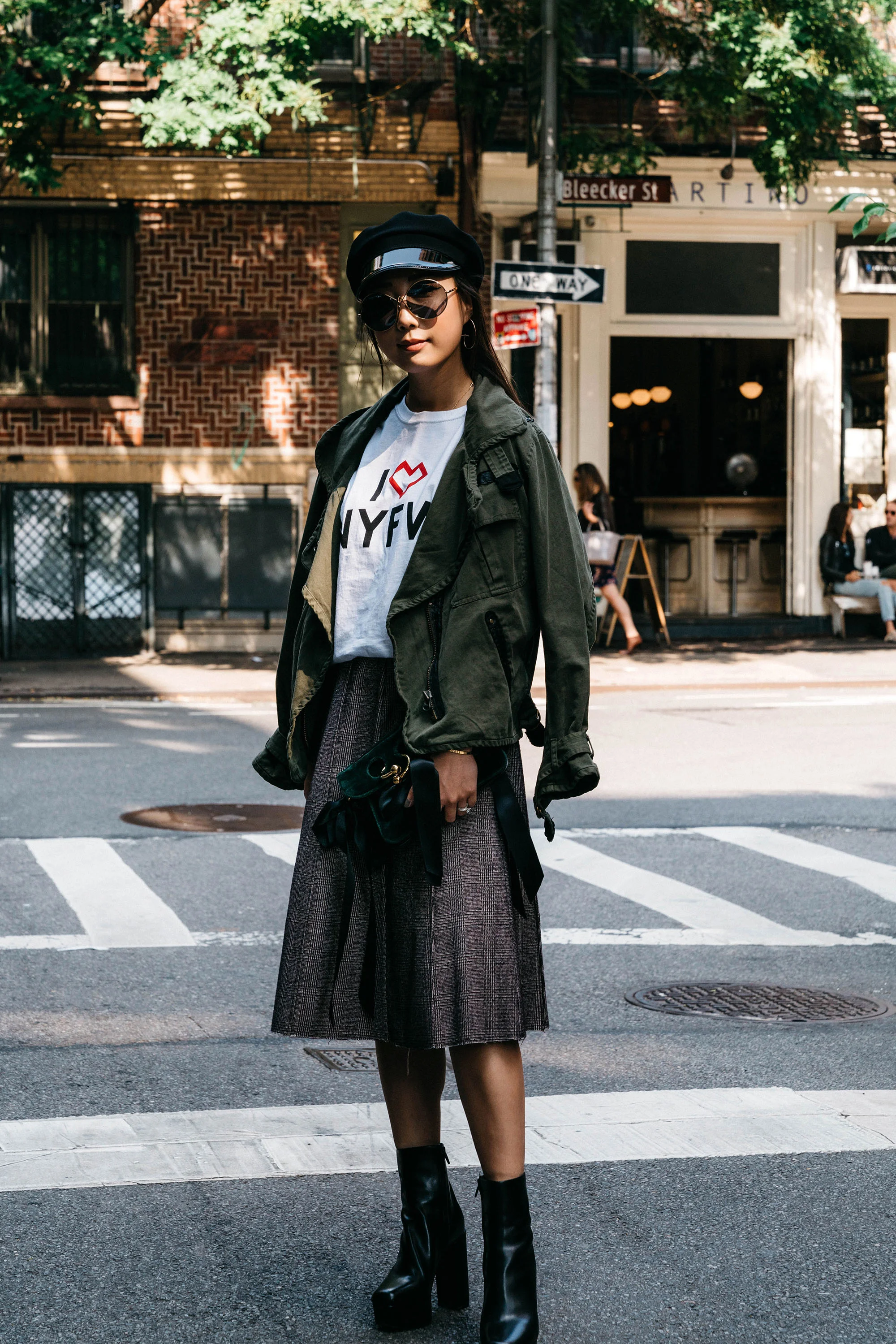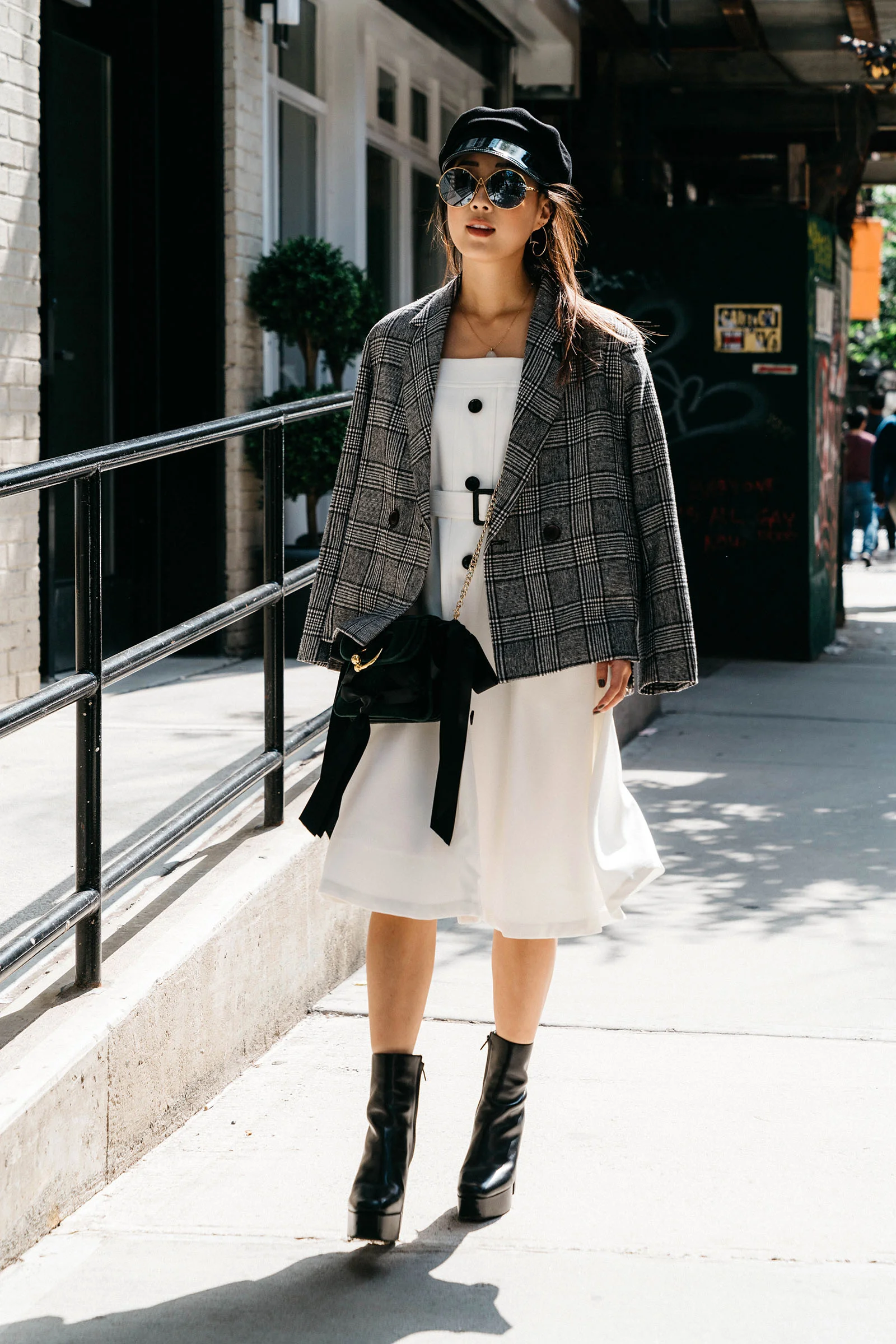 Petite Studio Jacket and Dress, J.W. Anderson Bag, Alexander Wang Boots, Altuzarra Sunglasses