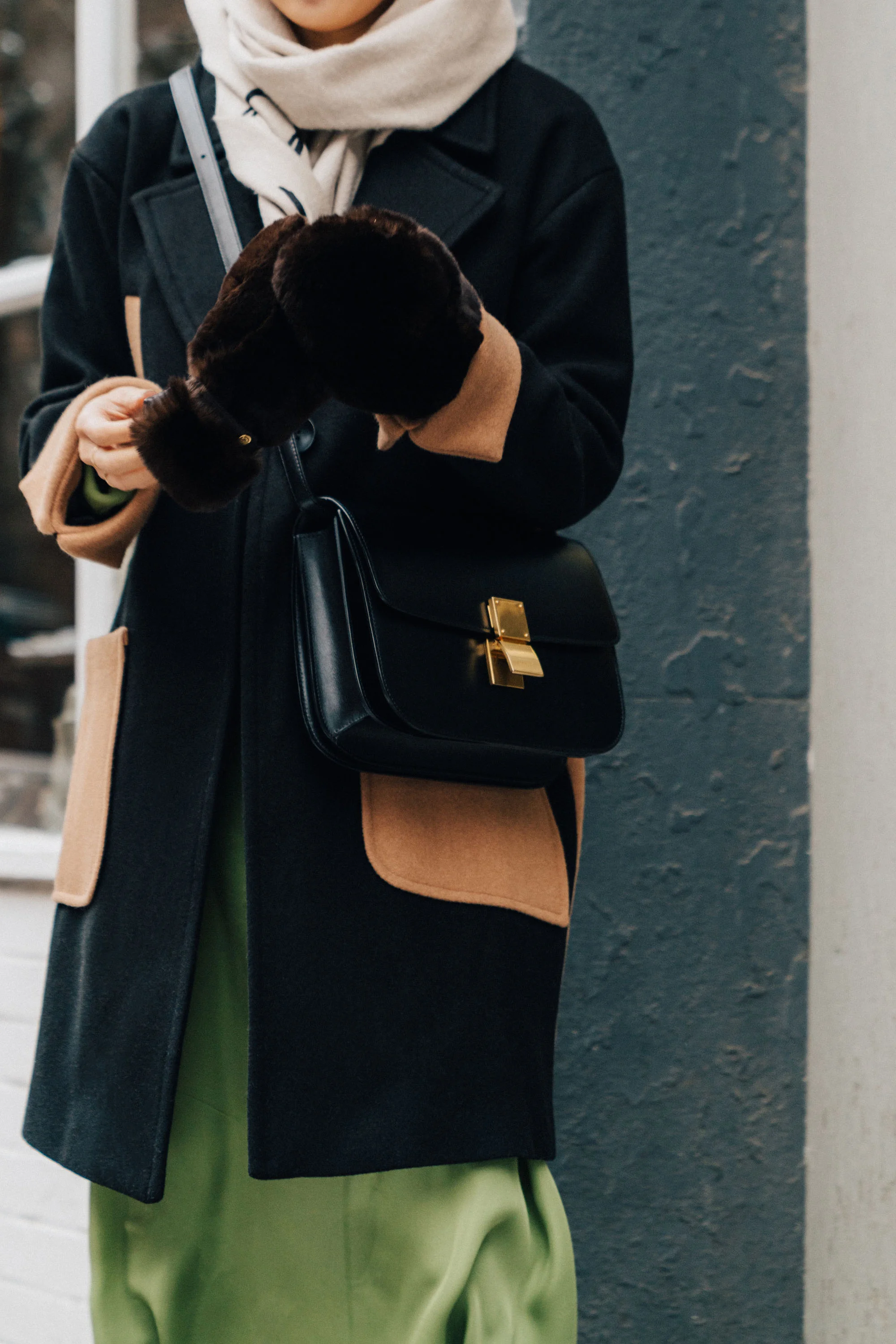 Petite Studio Coat, Yune Ho Dress, The Row Boots, Celine Bag, Eugenia Kim Beanie
