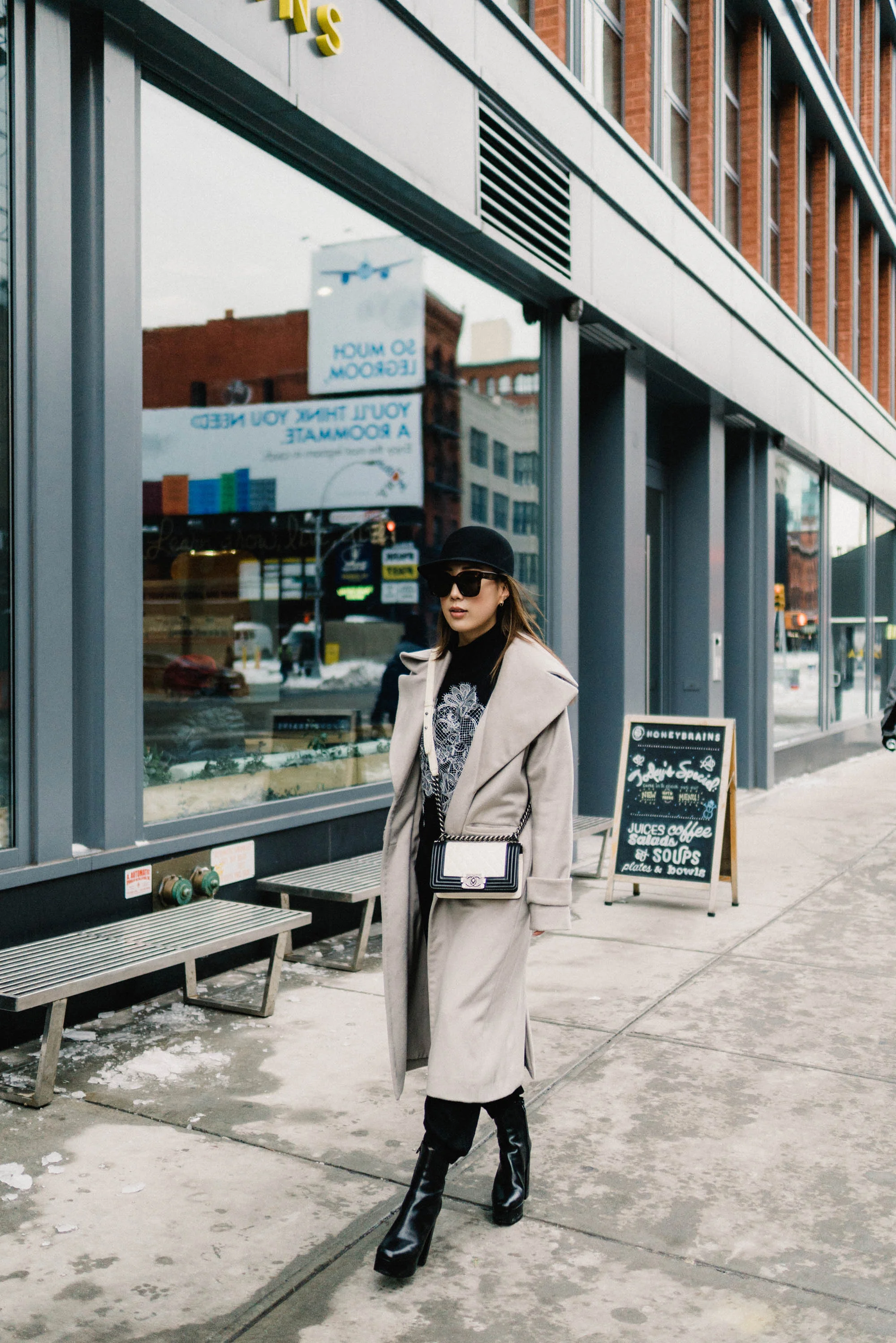 Michelle Waugh Coat, Lie Sang Bong Top, Vince Trousers, Alexander Wang Boots, Chanel Bag