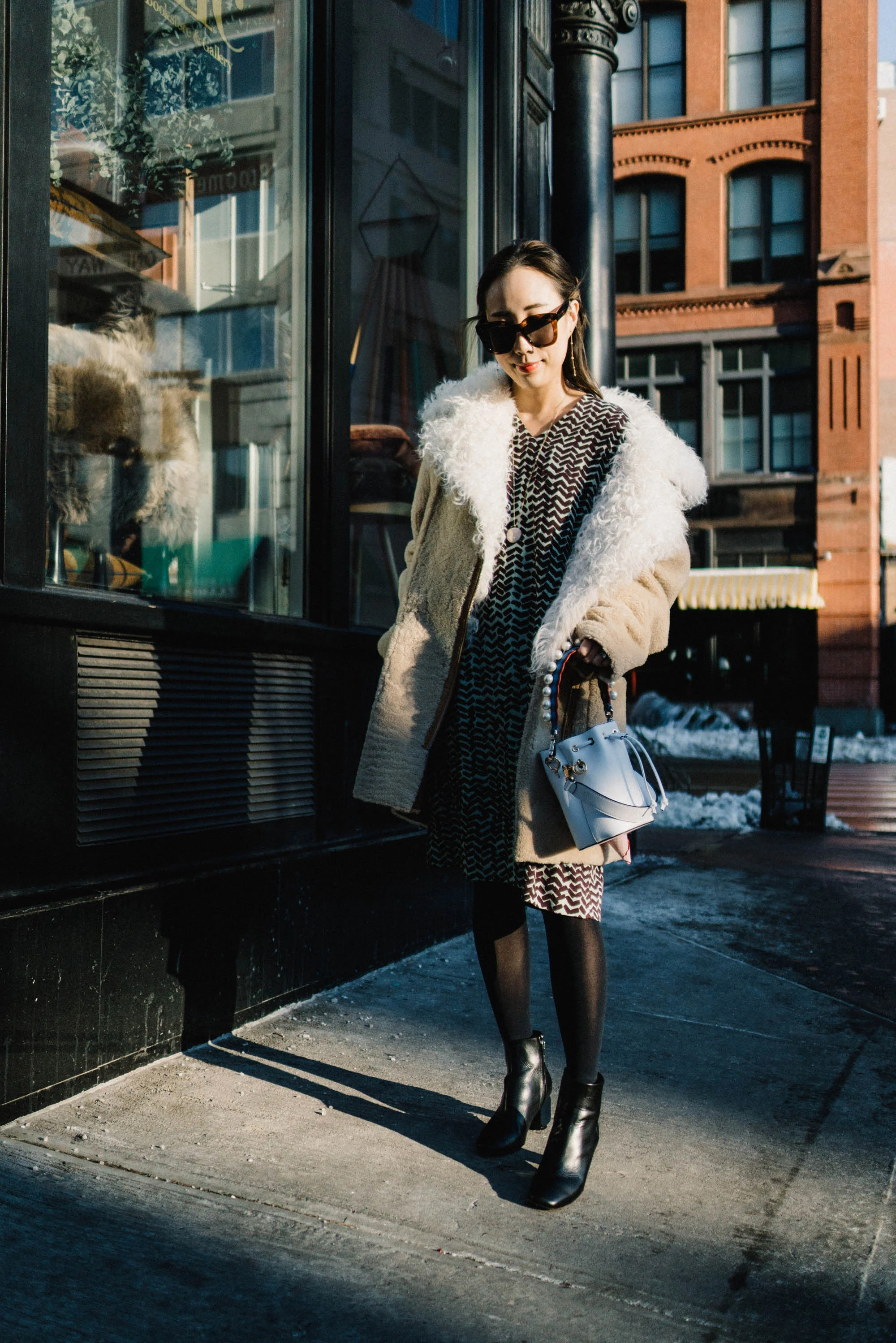 Michelle Waugh Coat, Sézane Dress, Fendi Boots, Givenchy Bag, Kate Spade Sunglasses, Hirotaka Earrings