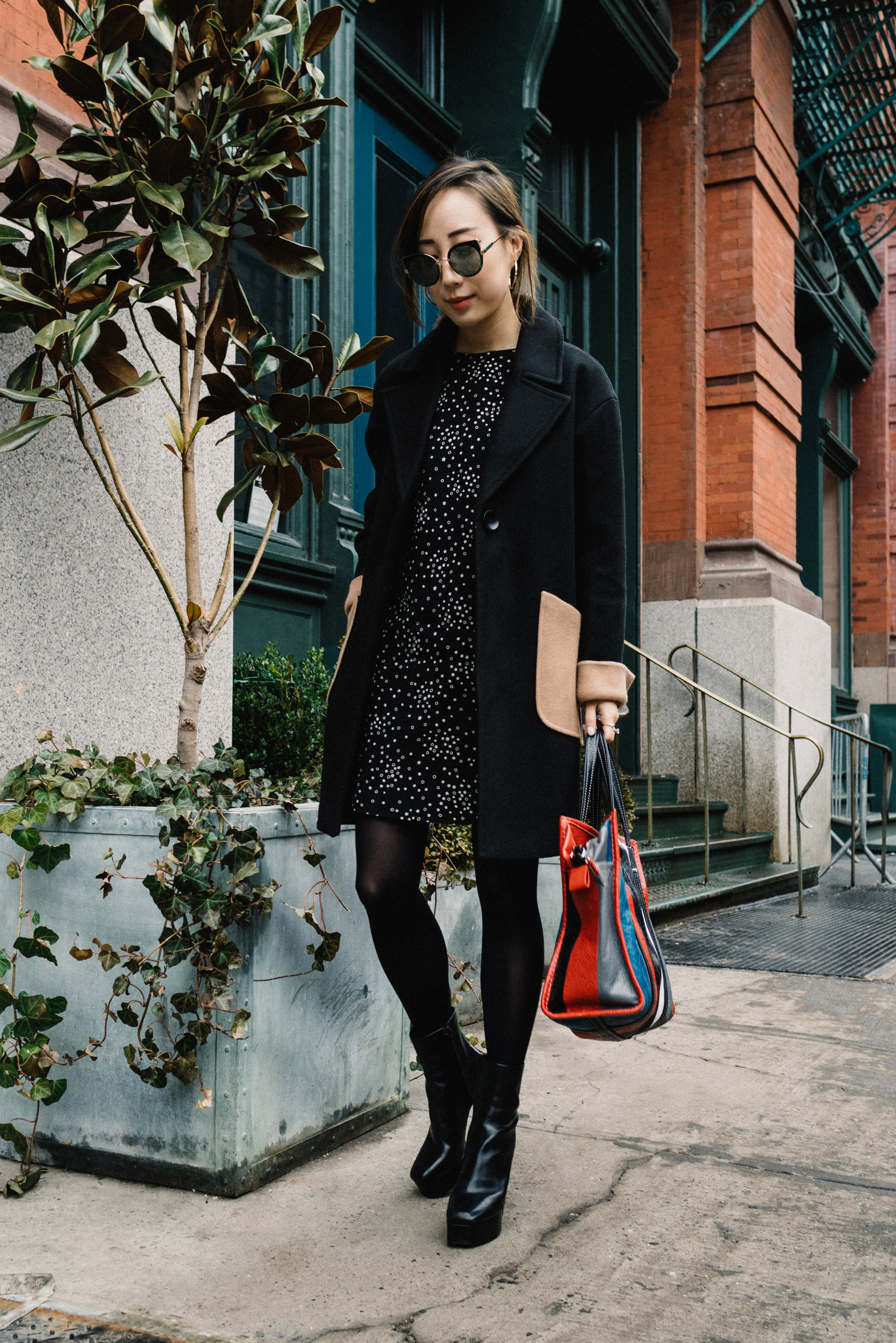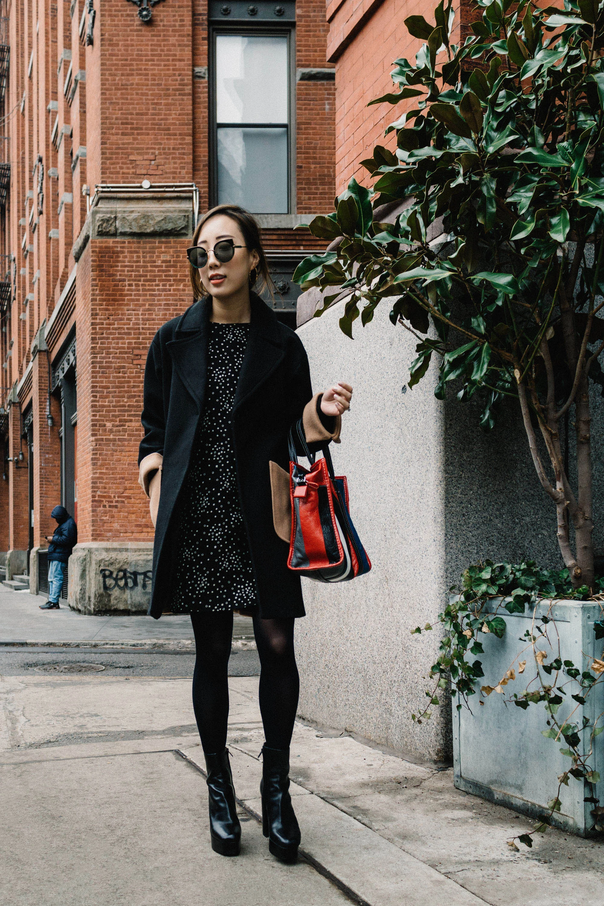 Petite Studio Coat, Saint Laurent Dress, Alexander Wang Boots, Balenciaga Bag, Gentle Monster Sunglasses