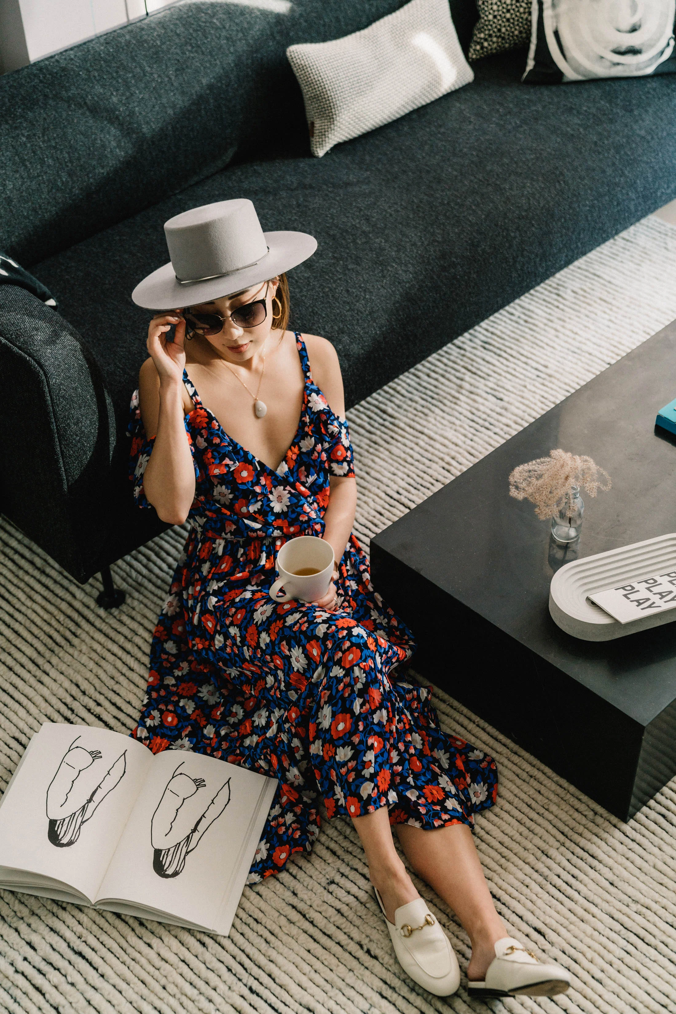 Kate Spade Dress, Gucci Slides, Kate Spade Sunglasses, Janessa Leone Hat, CVC Stones Necklace