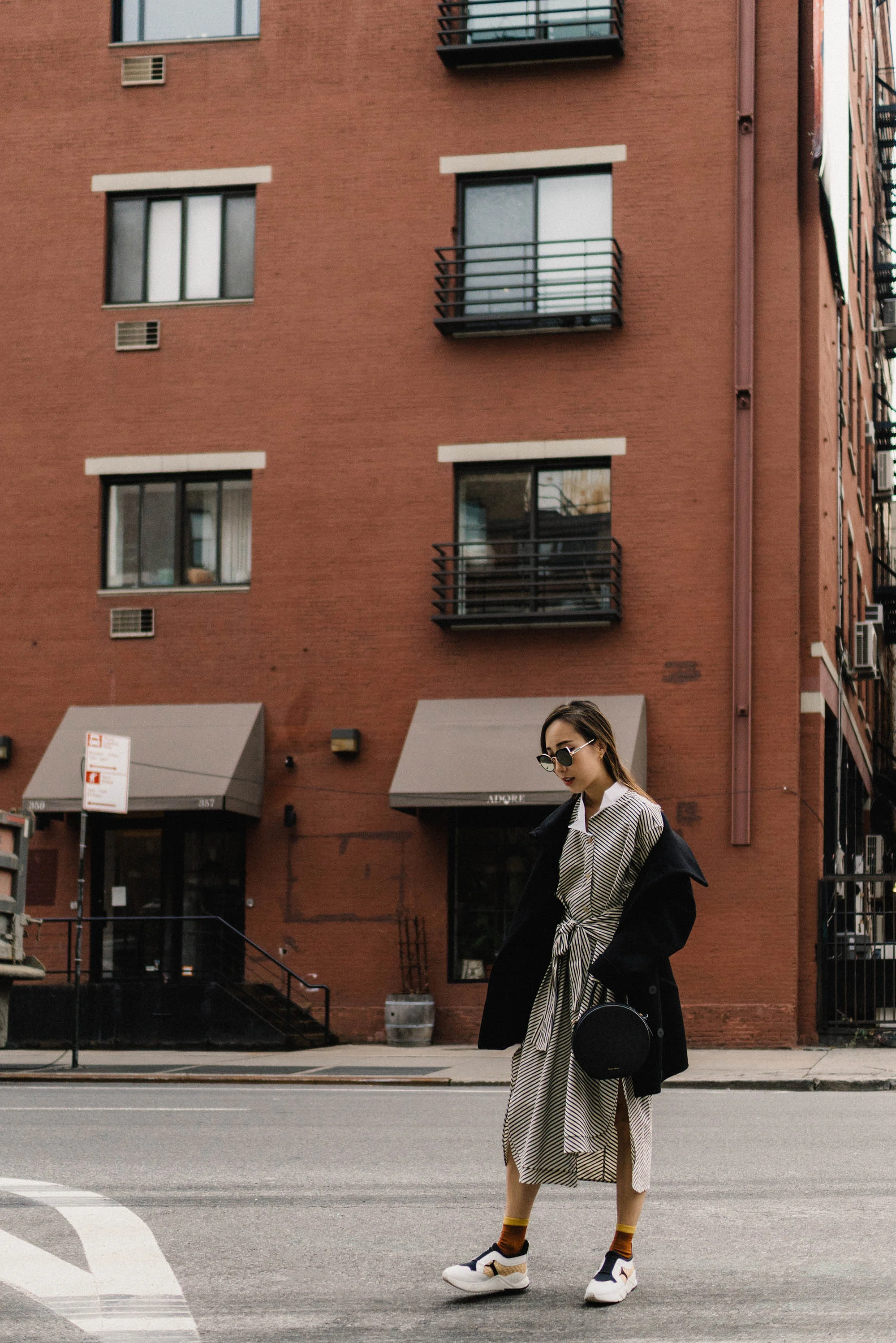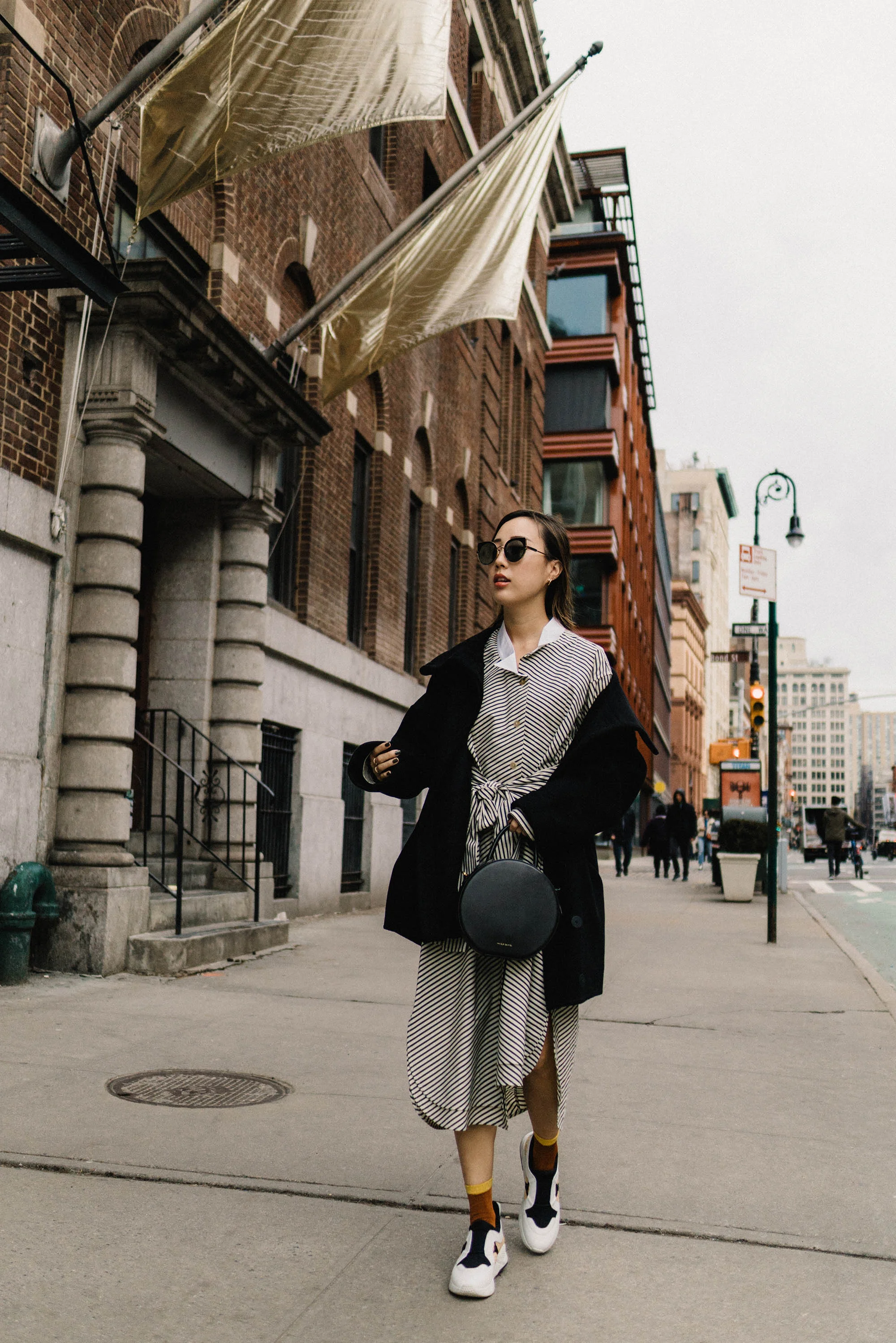 Michelle Waugh Coat, Loewe Dress, Hysteria by Happy Socks, Clergerie Shoes, Mansur Gavriel Bag, Gentle Monster x Moooi Sunglasses