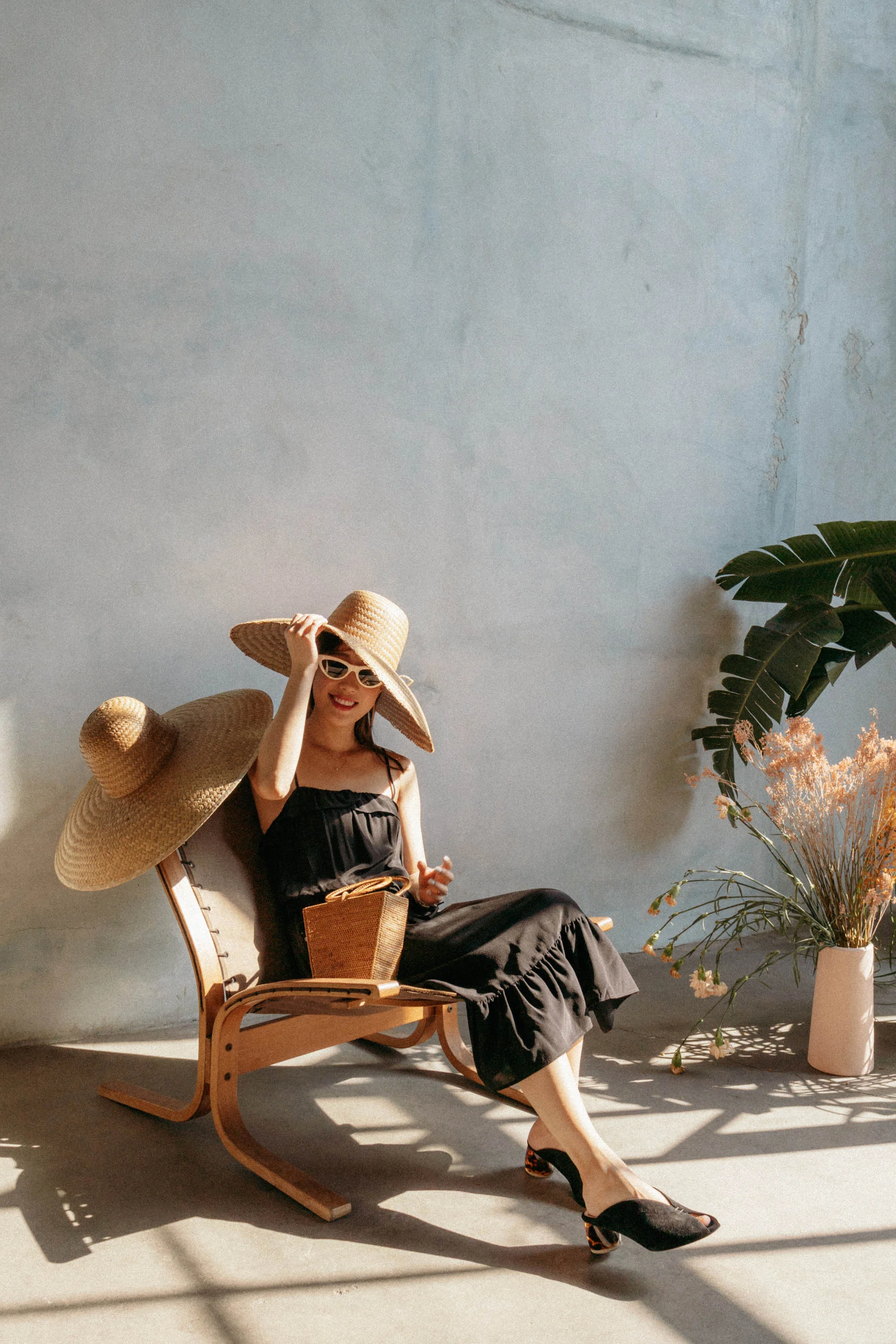 Philosophy di Lorenzo Serafini Top, Sezane Skirt, Chanel Shoes, Loewe Bag, Janessa Leone Hat, Celine Sunglasses