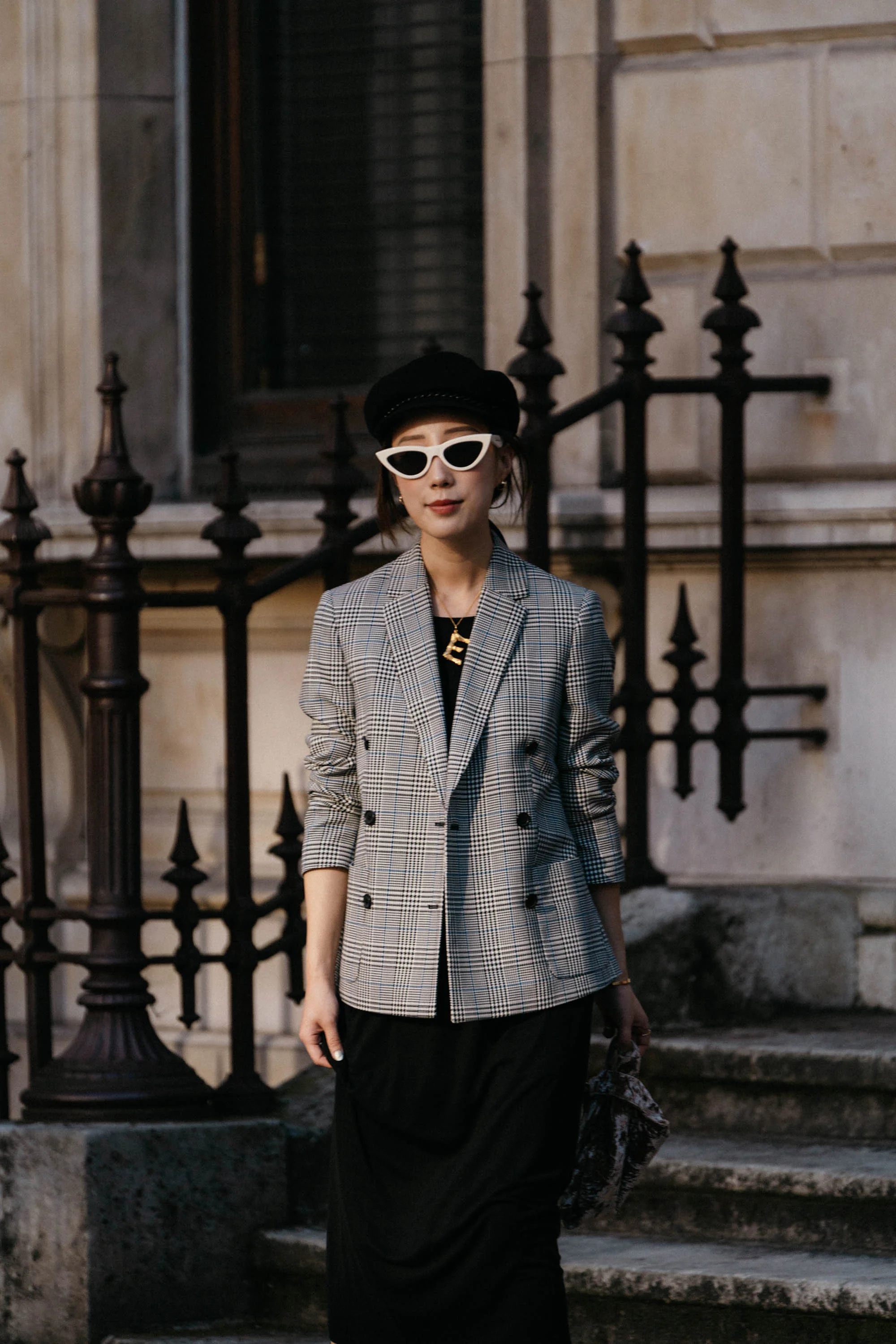 Balenciaga Jacket, FiveSeventyFive Dress, Seven All Around Shoes, Eugenia Kim Hat, Gucci Bag, Celine Sunglasses